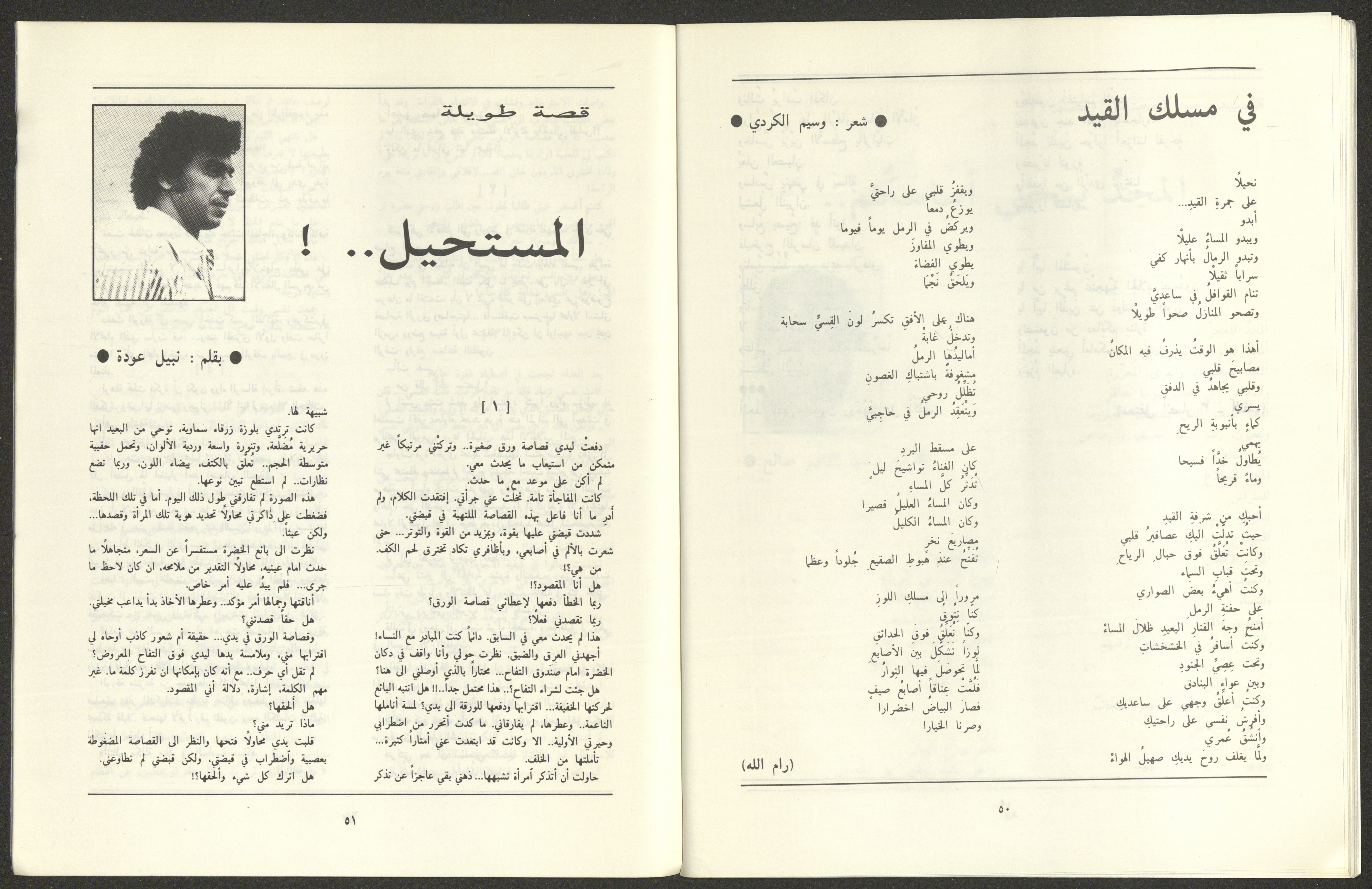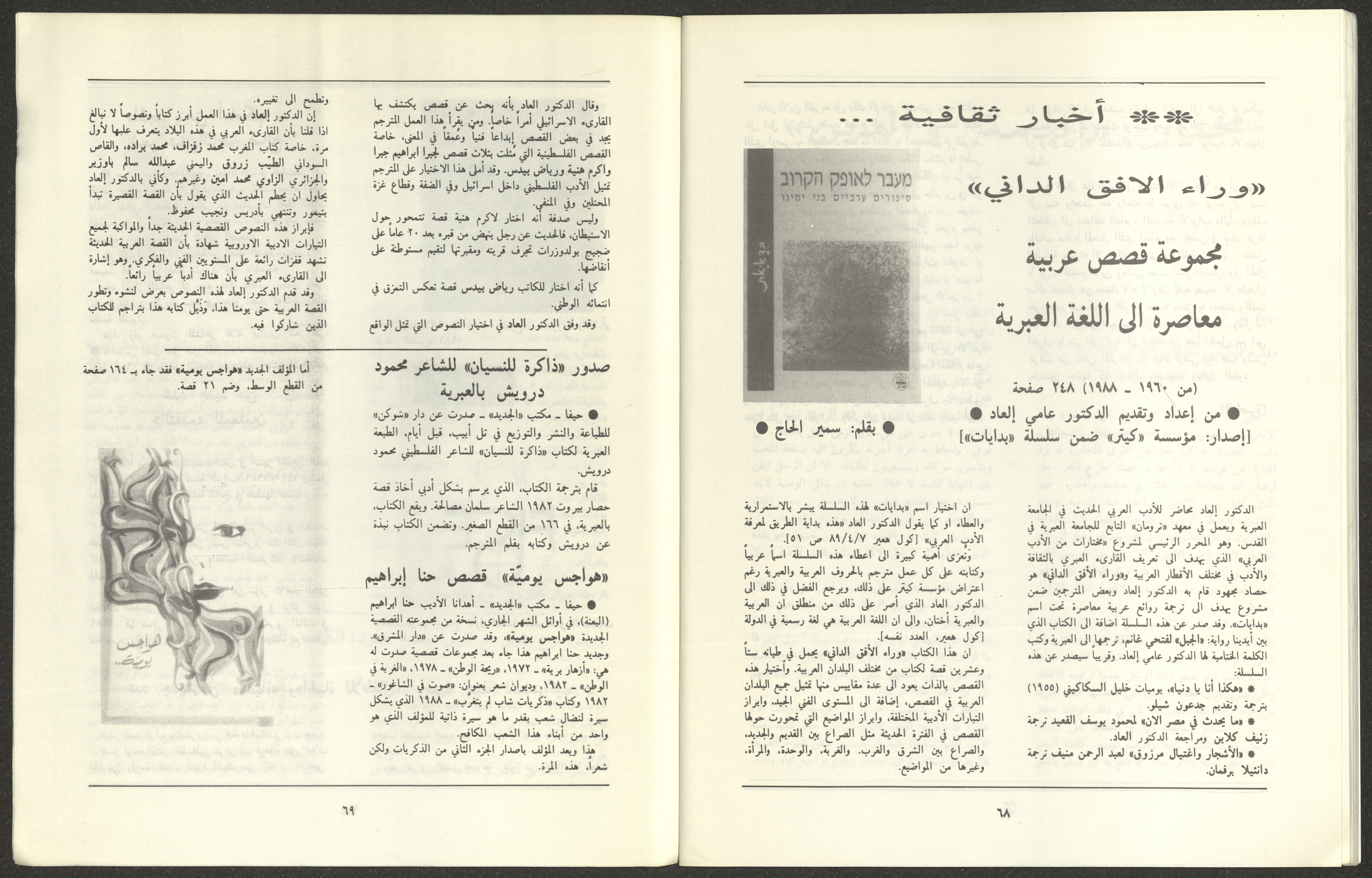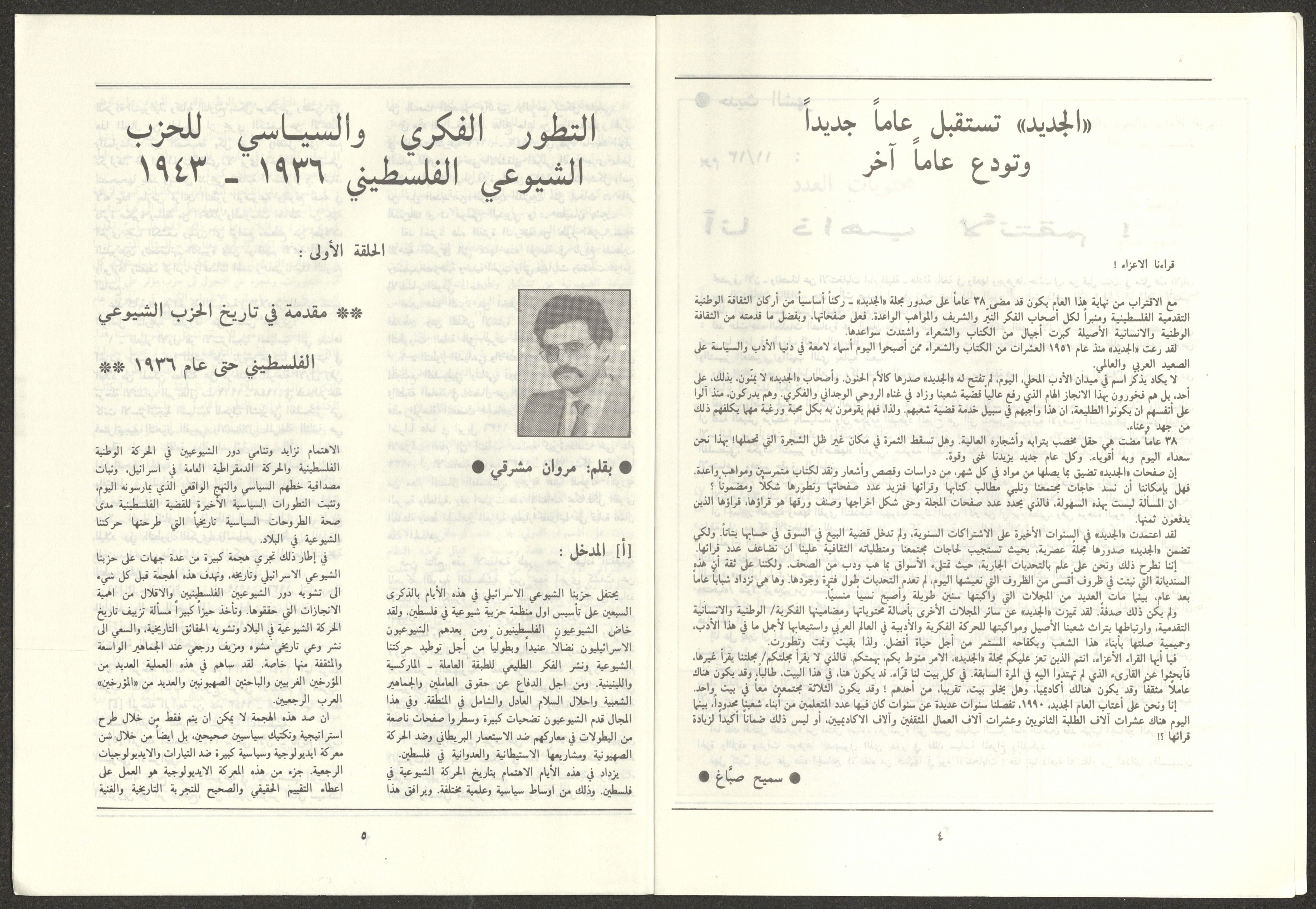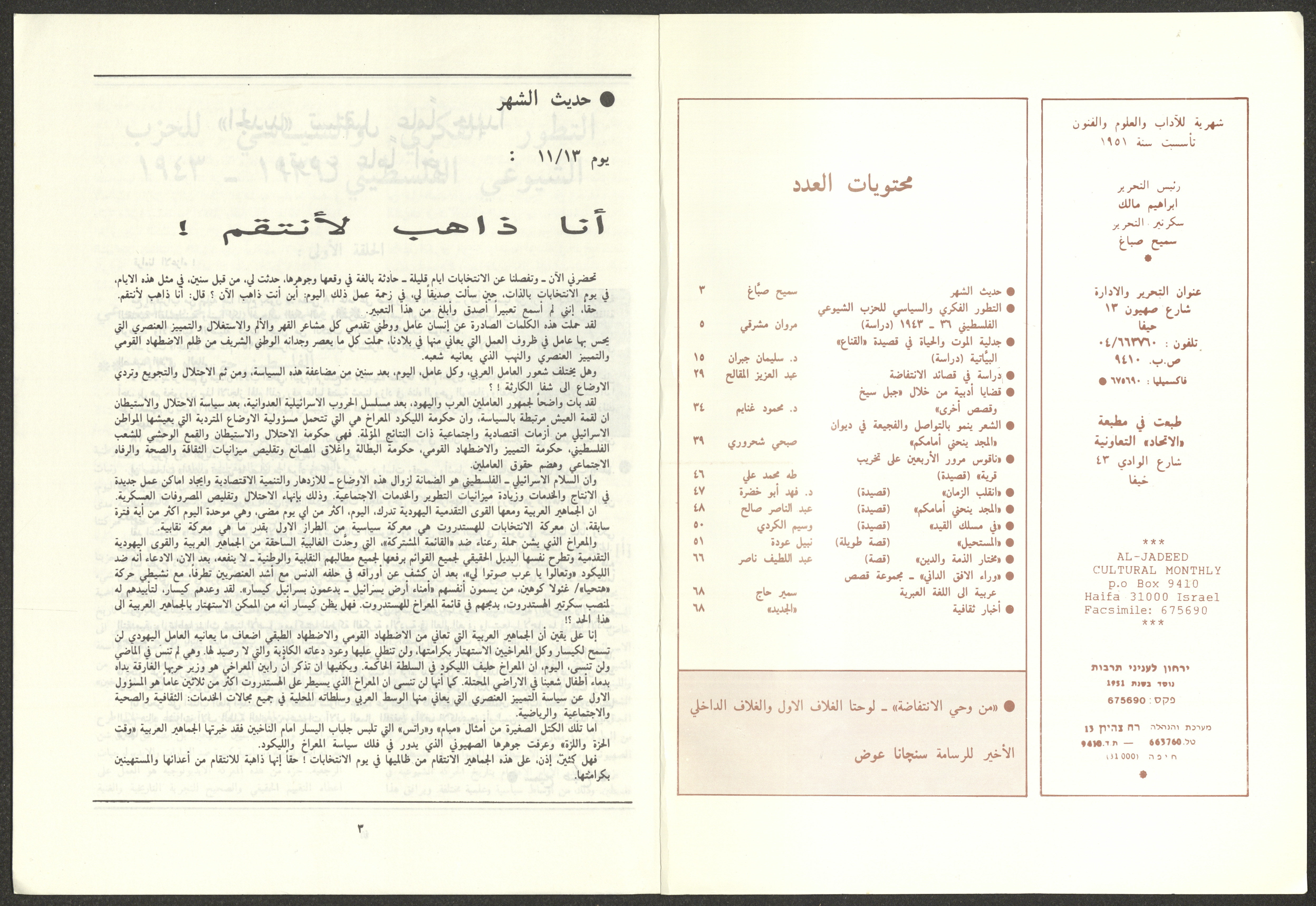 The tenth issue of the al-Jadeed magazine, a monthly magazine for progressive national thought and culture established in 1951, issued in October 1989 under the supervision of its first editor Hanna Naqara and its chief editor Ibrahim Malik. It was printed at the Union Cooperative Press in Haifa and two drawings by the artist Sanjana Awad were printed on the cover of the magazine. The issue included the following: 1. The talk of the month, "I'm Going to Get Revenge," by the magazine's editorial board. 2. A word for readers titled "Al-Jadeed Welcomes a New Year and Says Goodbye to Another" by Samih Sabbagh. 3. A series of episodes titled "The Intellectual and Political Development of the Palestinian Communist Party from 1936 -1943 (Episode 1) by Marwan Mashreqi. 4. A study titled "The Dialectic of Death and Life in the Bayatian Poem (The Mask)" by Suleiman Jubran. 5. A study titled “A Study in the Poems of the Intifada: The Shock of the Stones,” by Abdel-Aziz l-Maqaleh. 6. An article titled "Literary Issues through (Jabal Sikh and Other Stories)" by Mahmoud Ghanayem. 7. A critical article titled "Poetry Grows Through Communication and Bereavement in Abdennasser Saleh's Diwan (Glory Bows Before You)" by Sobhi Shahrouri. 8. A poem titled "Maqos Muroor al-Arabaeen Ala Takhrib al-Qaryah" (The Bill of 40 Years Passing Since the Destruction of the Village) by Taha Mohammad Ali. 9. A poem titled "Enqalaba az-Zaman" (The Time Overturned) by Fahd abu Khadra. 10. A poem titled "Al-Majdo Yanhani Amamakom" (Glory Bows Before You) by Abdennaser Saleh while at Ansar Prison 3 "The Naqab". 11. A poem titled "Fi Maslak al-Qayd" (In the Path of Chains) by Waseem al-Kurdi. 12. A long story titled "The Impossible" by Nabil Odeh. 13. A story titled "Mukhtar (Dhimma and Religion) by Abdel-Latif Naser. 14. A variety of cultural news, including "news about the release of new books", "news about Palestinian theatre and art" and others.