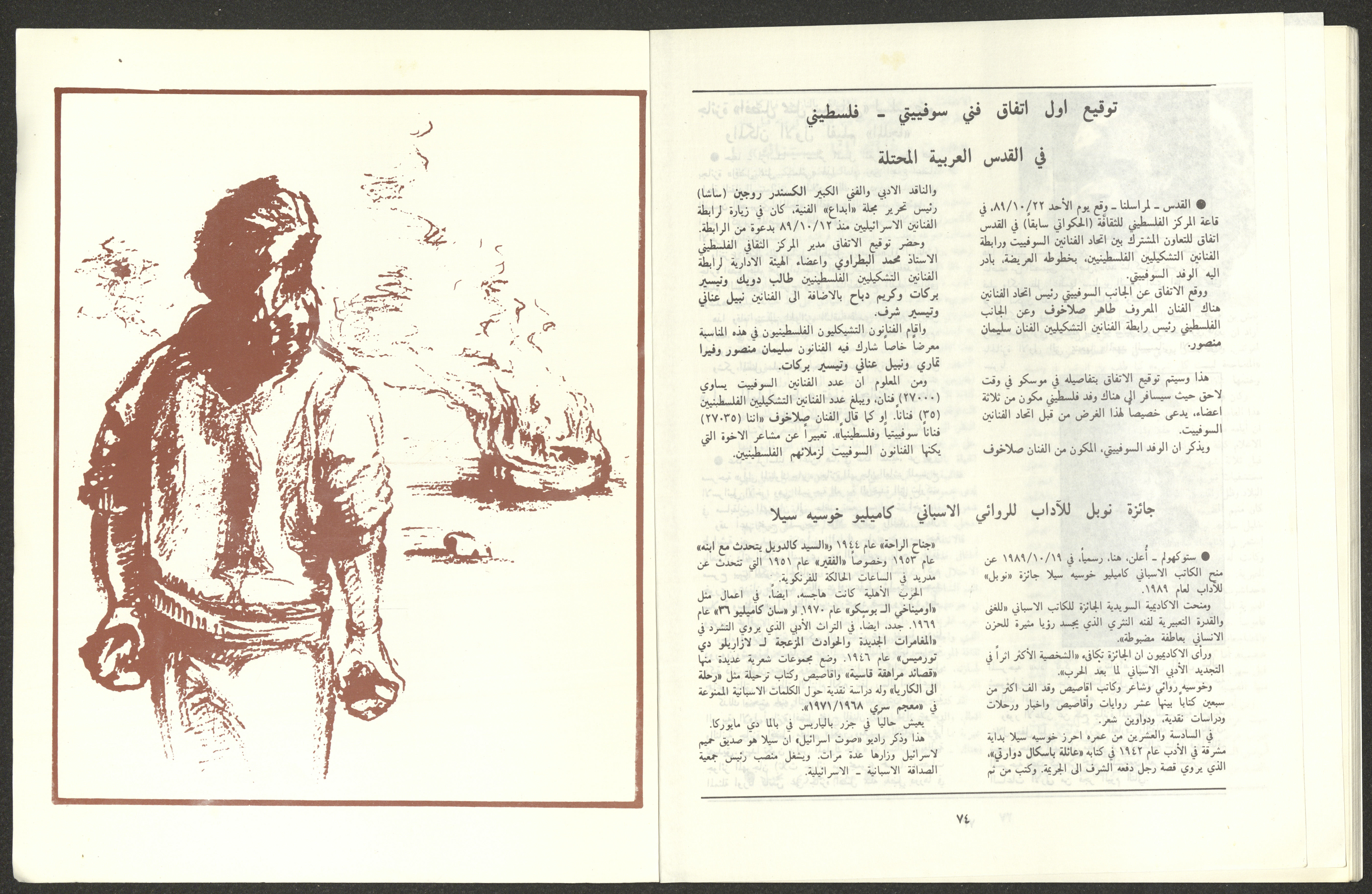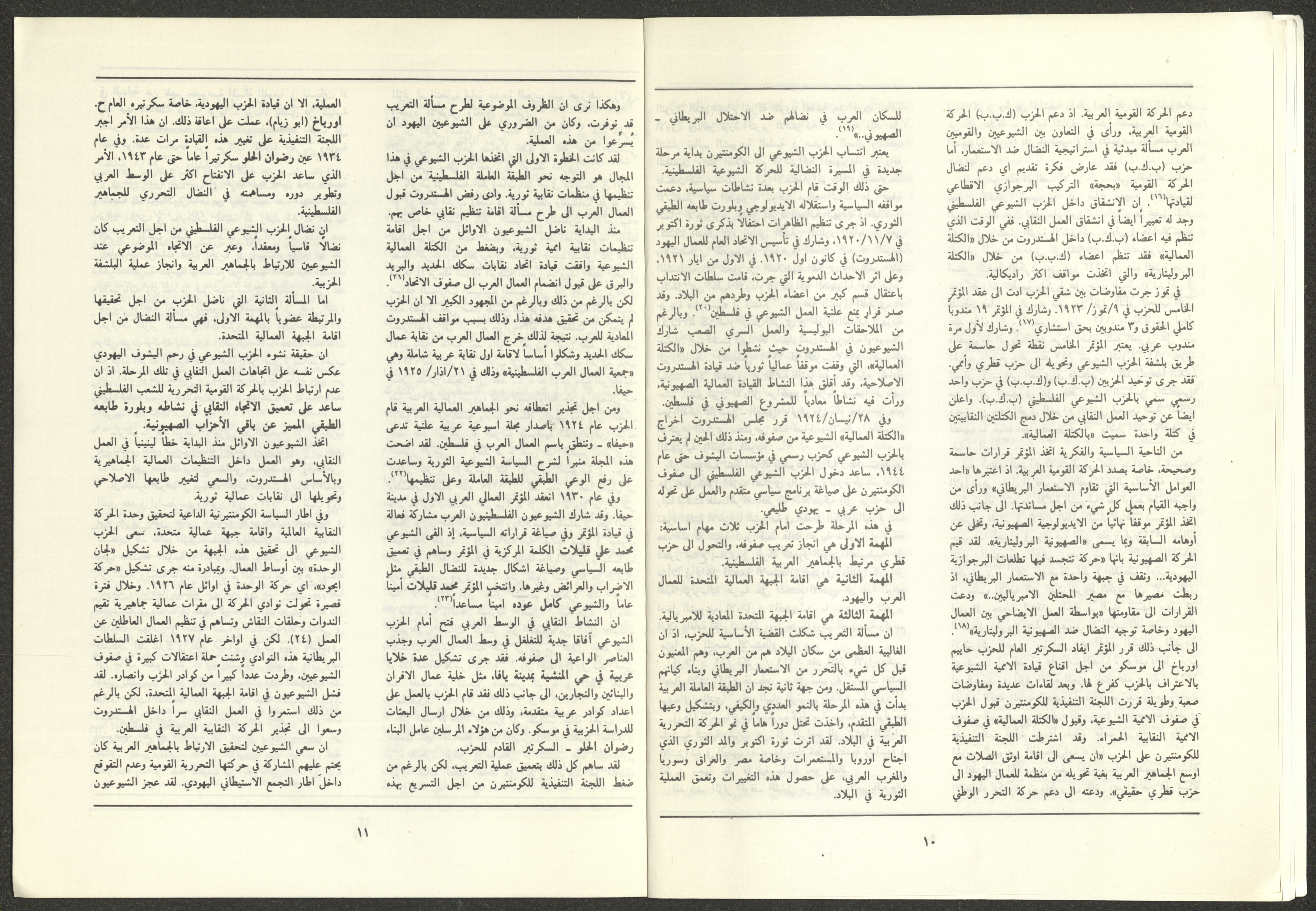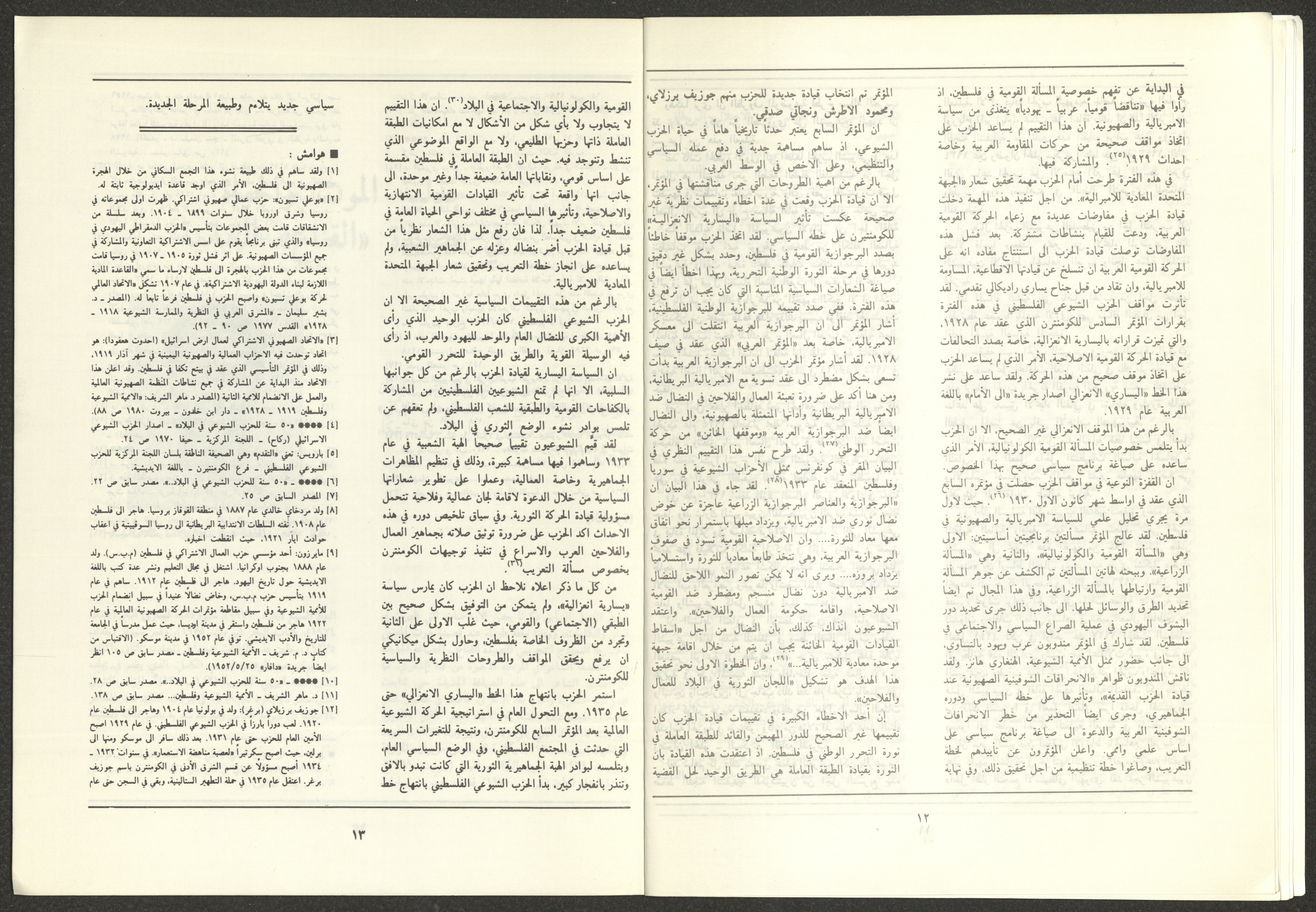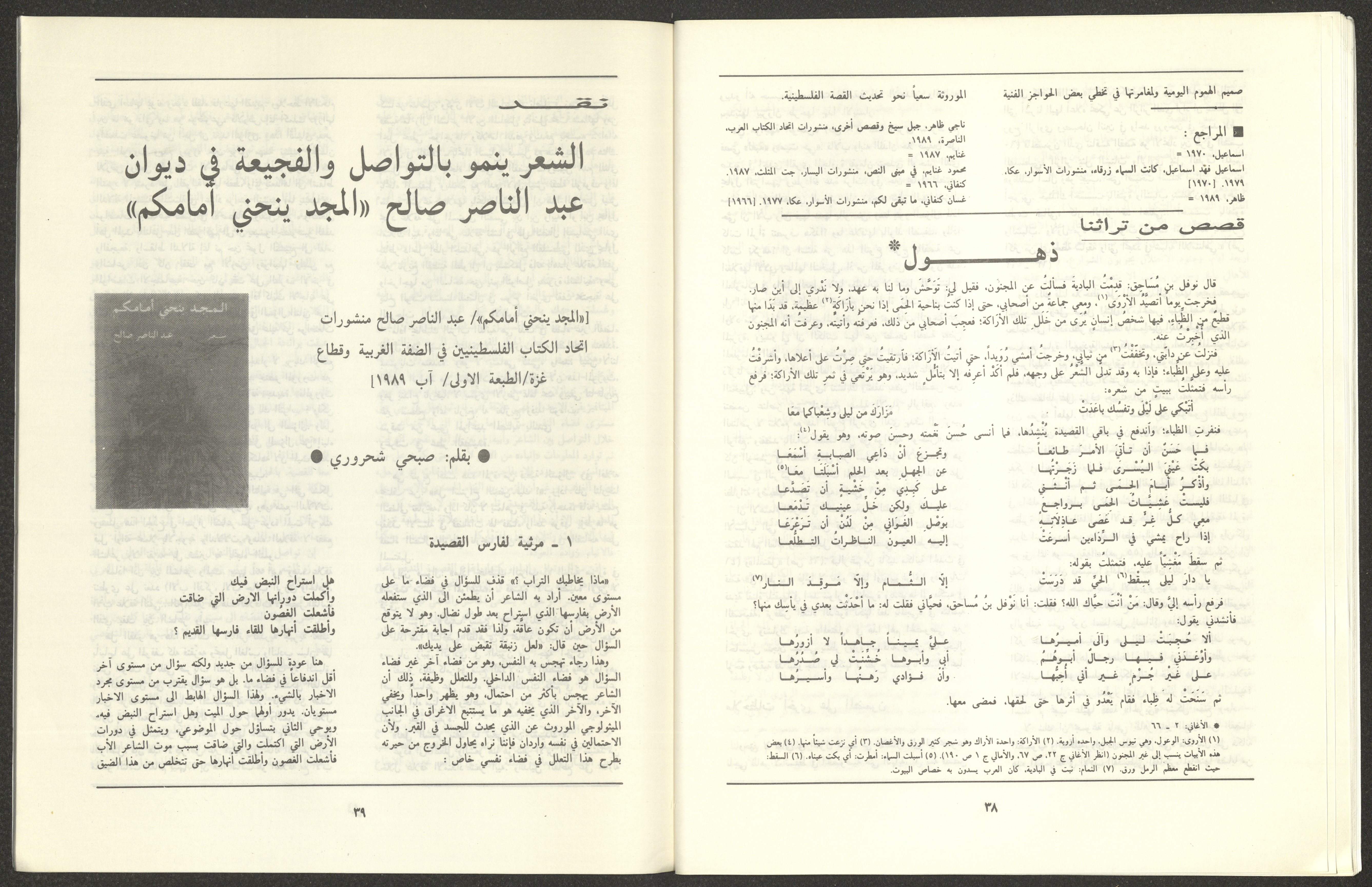 The tenth issue of the al-Jadeed magazine, a monthly magazine for progressive national thought and culture established in 1951, issued in October 1989 under the supervision of its first editor Hanna Naqara and its chief editor Ibrahim Malik. It was printed at the Union Cooperative Press in Haifa and two drawings by the artist Sanjana Awad were printed on the cover of the magazine. The issue included the following: 1. The talk of the month, "I'm Going to Get Revenge," by the magazine's editorial board. 2. A word for readers titled "Al-Jadeed Welcomes a New Year and Says Goodbye to Another" by Samih Sabbagh. 3. A series of episodes titled "The Intellectual and Political Development of the Palestinian Communist Party from 1936 -1943 (Episode 1) by Marwan Mashreqi. 4. A study titled "The Dialectic of Death and Life in the Bayatian Poem (The Mask)" by Suleiman Jubran. 5. A study titled “A Study in the Poems of the Intifada: The Shock of the Stones,” by Abdel-Aziz l-Maqaleh. 6. An article titled "Literary Issues through (Jabal Sikh and Other Stories)" by Mahmoud Ghanayem. 7. A critical article titled "Poetry Grows Through Communication and Bereavement in Abdennasser Saleh's Diwan (Glory Bows Before You)" by Sobhi Shahrouri. 8. A poem titled "Maqos Muroor al-Arabaeen Ala Takhrib al-Qaryah" (The Bill of 40 Years Passing Since the Destruction of the Village) by Taha Mohammad Ali. 9. A poem titled "Enqalaba az-Zaman" (The Time Overturned) by Fahd abu Khadra. 10. A poem titled "Al-Majdo Yanhani Amamakom" (Glory Bows Before You) by Abdennaser Saleh while at Ansar Prison 3 "The Naqab". 11. A poem titled "Fi Maslak al-Qayd" (In the Path of Chains) by Waseem al-Kurdi. 12. A long story titled "The Impossible" by Nabil Odeh. 13. A story titled "Mukhtar (Dhimma and Religion) by Abdel-Latif Naser. 14. A variety of cultural news, including "news about the release of new books", "news about Palestinian theatre and art" and others.