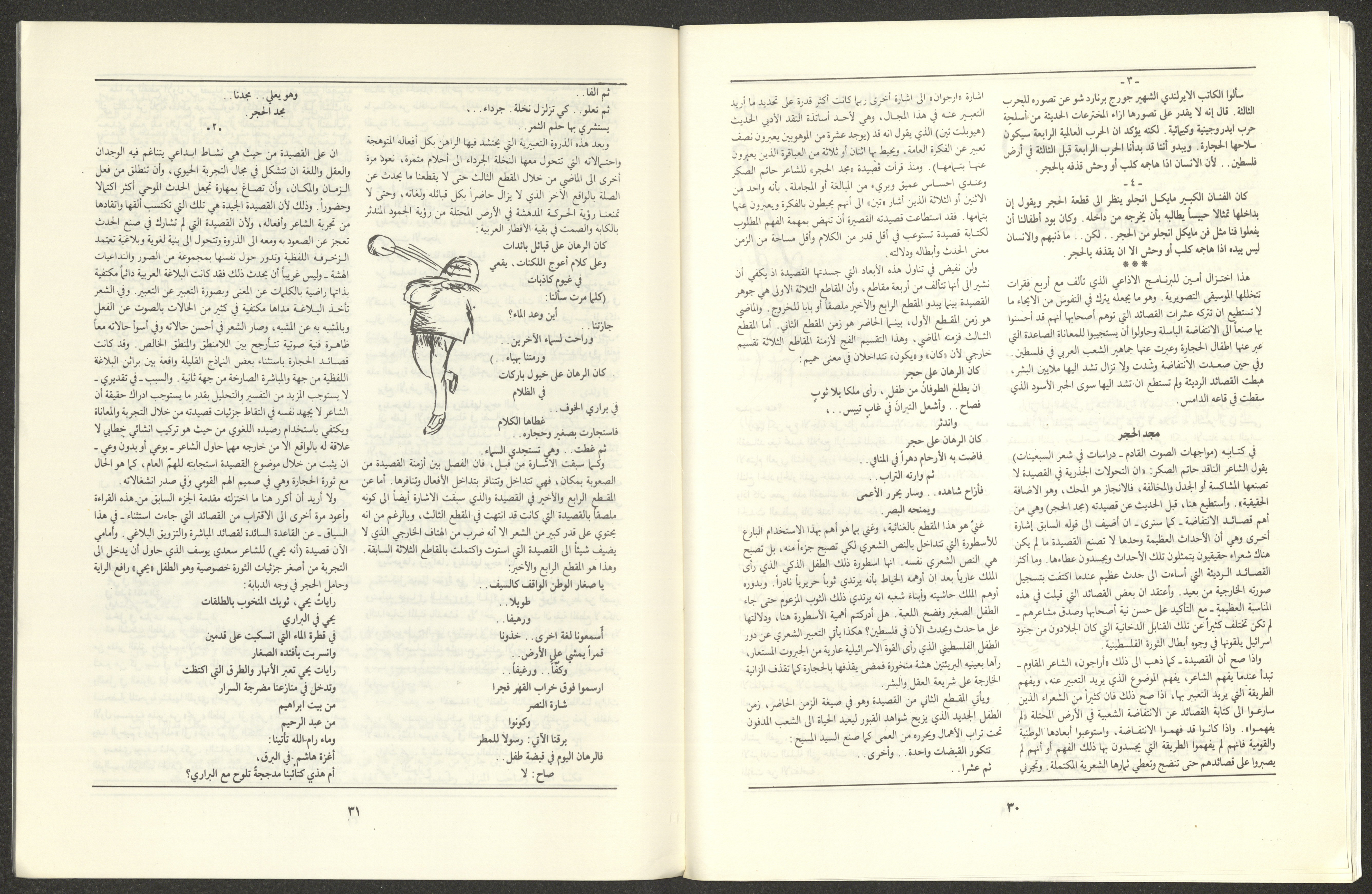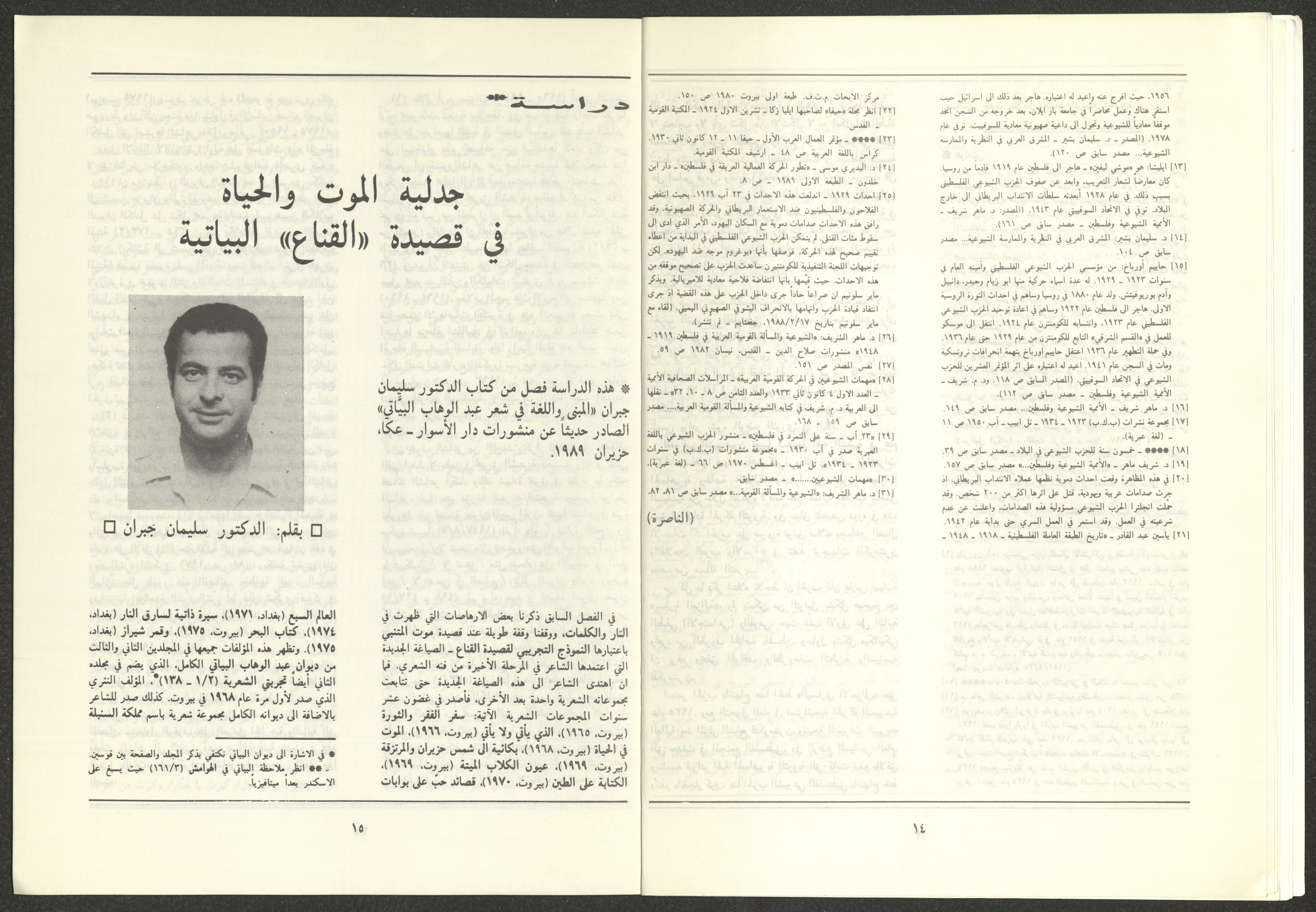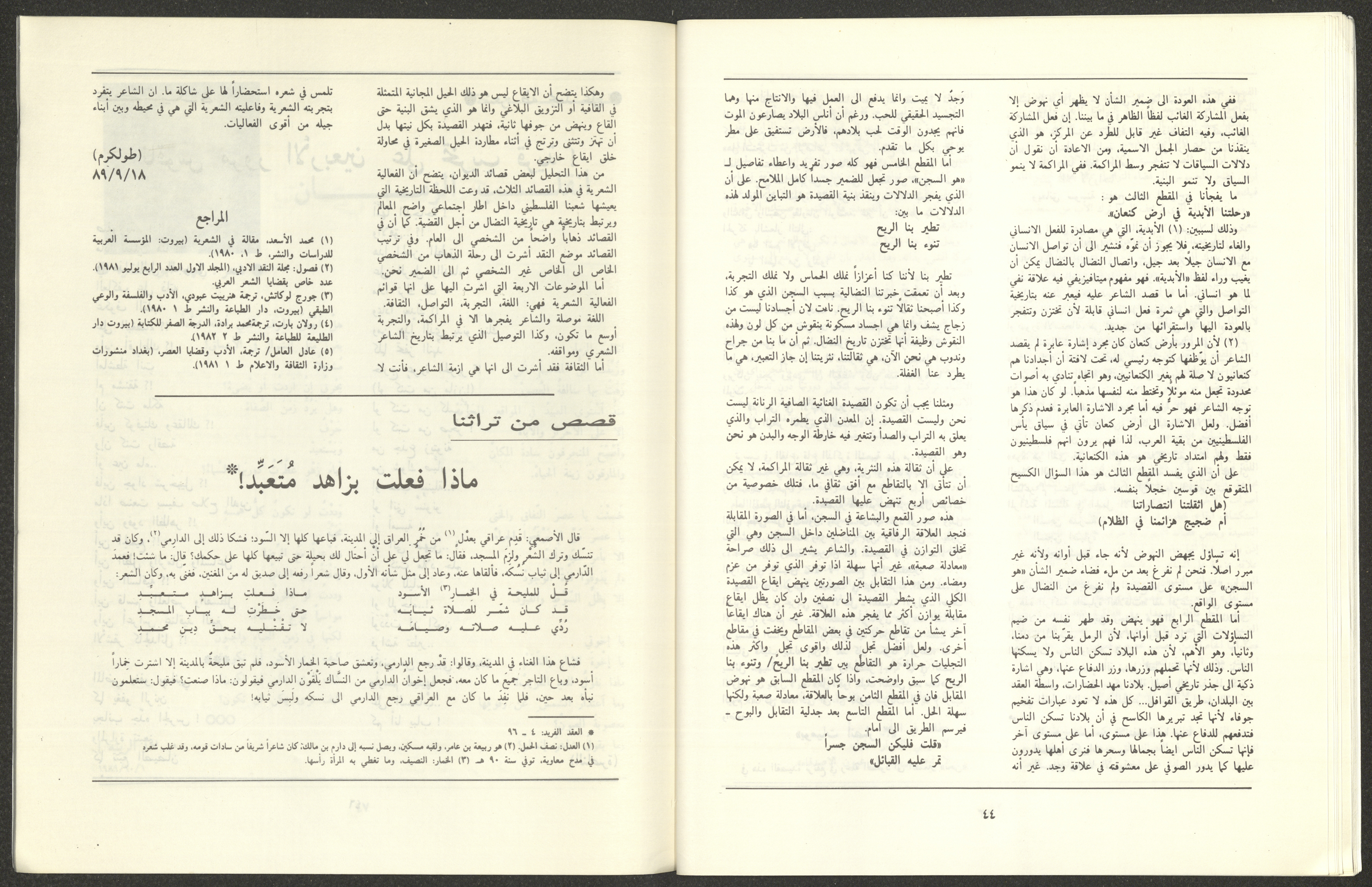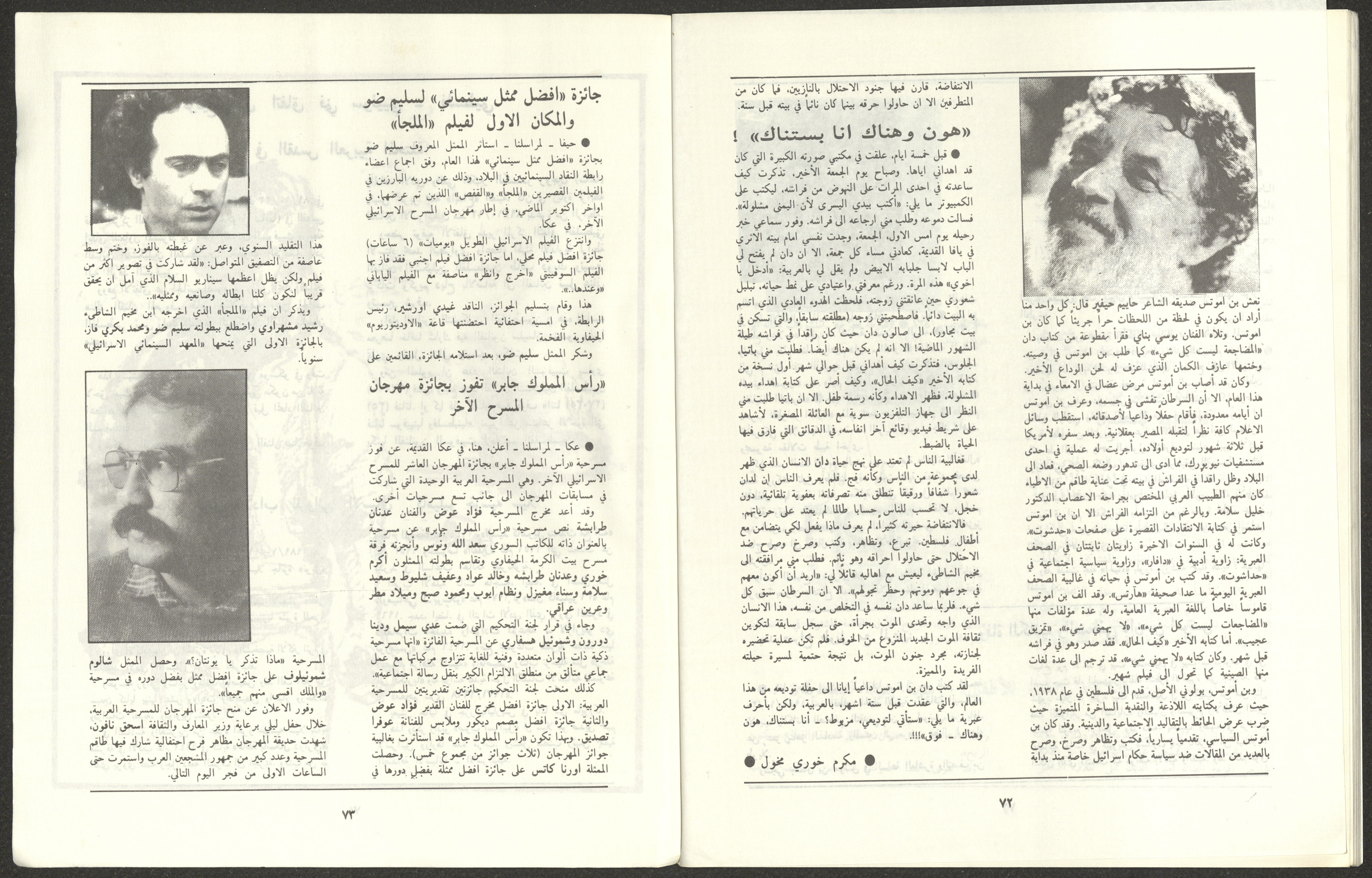 The tenth issue of the al-Jadeed magazine, a monthly magazine for progressive national thought and culture established in 1951, issued in October 1989 under the supervision of its first editor Hanna Naqara and its chief editor Ibrahim Malik. It was printed at the Union Cooperative Press in Haifa and two drawings by the artist Sanjana Awad were printed on the cover of the magazine. The issue included the following: 1. The talk of the month, "I'm Going to Get Revenge," by the magazine's editorial board. 2. A word for readers titled "Al-Jadeed Welcomes a New Year and Says Goodbye to Another" by Samih Sabbagh. 3. A series of episodes titled "The Intellectual and Political Development of the Palestinian Communist Party from 1936 -1943 (Episode 1) by Marwan Mashreqi. 4. A study titled "The Dialectic of Death and Life in the Bayatian Poem (The Mask)" by Suleiman Jubran. 5. A study titled “A Study in the Poems of the Intifada: The Shock of the Stones,” by Abdel-Aziz l-Maqaleh. 6. An article titled "Literary Issues through (Jabal Sikh and Other Stories)" by Mahmoud Ghanayem. 7. A critical article titled "Poetry Grows Through Communication and Bereavement in Abdennasser Saleh's Diwan (Glory Bows Before You)" by Sobhi Shahrouri. 8. A poem titled "Maqos Muroor al-Arabaeen Ala Takhrib al-Qaryah" (The Bill of 40 Years Passing Since the Destruction of the Village) by Taha Mohammad Ali. 9. A poem titled "Enqalaba az-Zaman" (The Time Overturned) by Fahd abu Khadra. 10. A poem titled "Al-Majdo Yanhani Amamakom" (Glory Bows Before You) by Abdennaser Saleh while at Ansar Prison 3 "The Naqab". 11. A poem titled "Fi Maslak al-Qayd" (In the Path of Chains) by Waseem al-Kurdi. 12. A long story titled "The Impossible" by Nabil Odeh. 13. A story titled "Mukhtar (Dhimma and Religion) by Abdel-Latif Naser. 14. A variety of cultural news, including "news about the release of new books", "news about Palestinian theatre and art" and others.