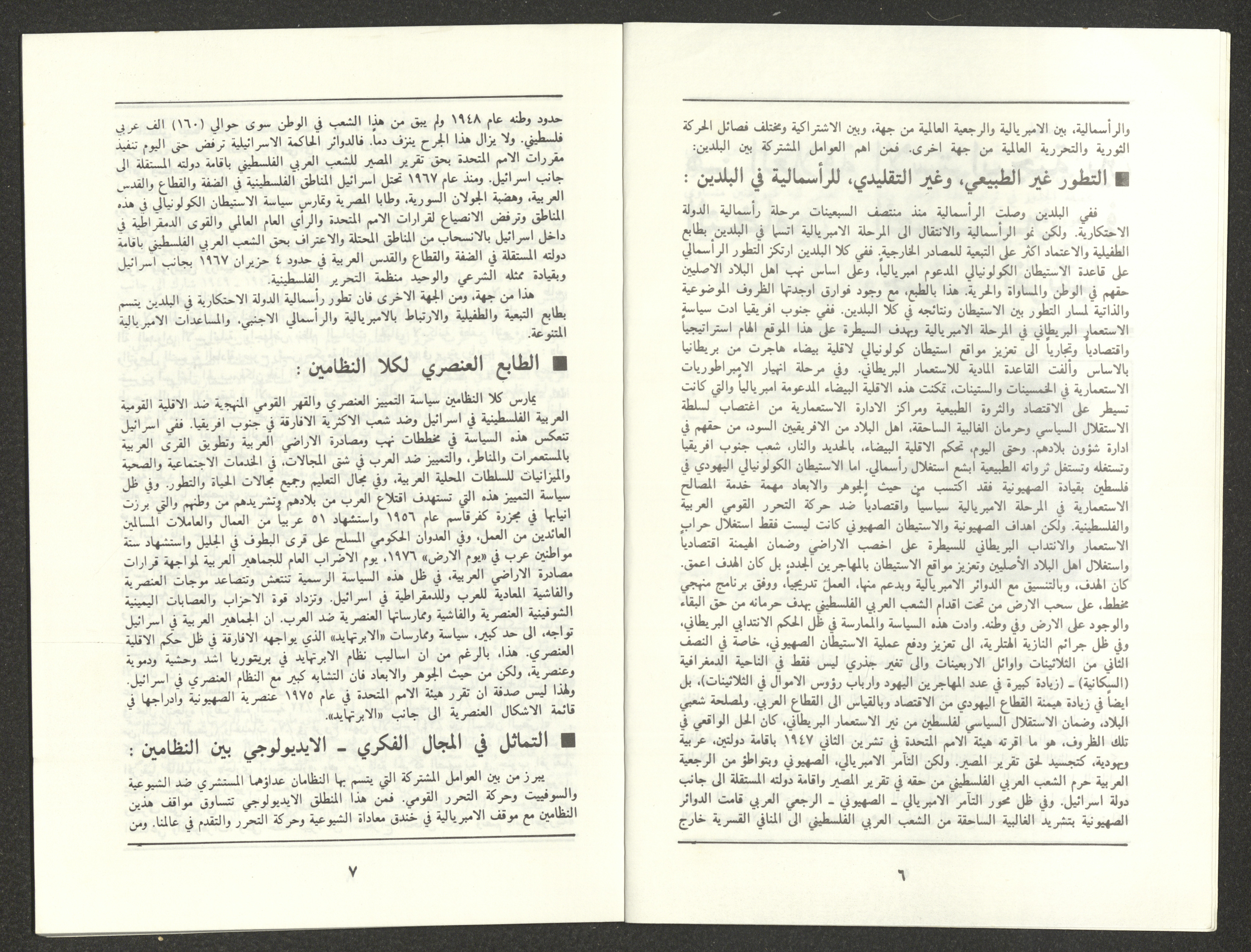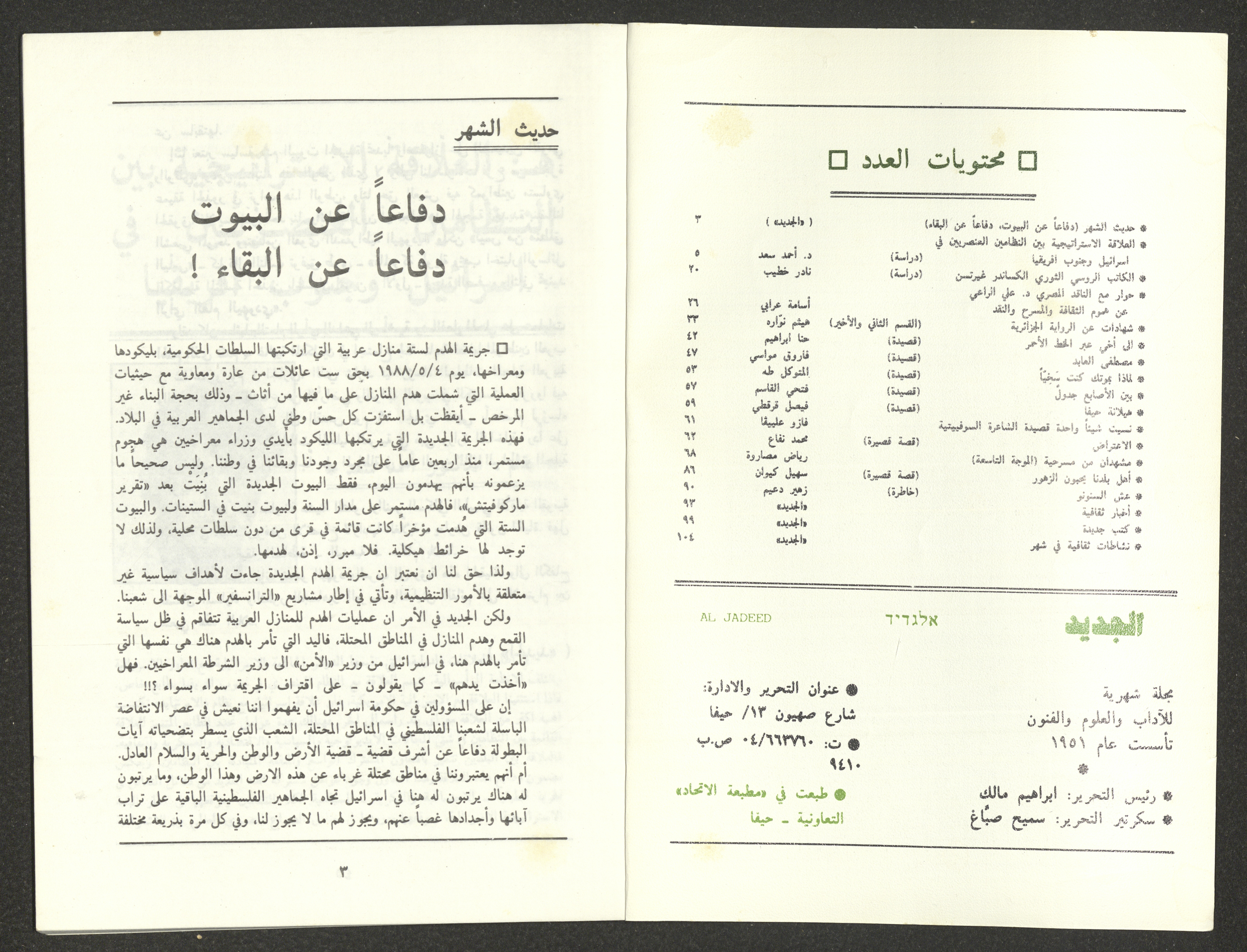 العدد السابع من مجلة الجديد، مجلة شهرية للفكر والثقافة الوطنية التقدمية تأسست عام 1951، الصادر في شهر تموز عام 1988 تحت إشراف محررها الأول حنا نقارة ورئيس تحريرها ابراهيم مالك وطبع في مطابع الإتحاد التعاونية في مدينة حيفا، ويحتوي الغلاف على لوحة للفنان الفلسطيني موسى العليان. تضمن العدد ما يلي: حديث الشهر بعنوان "دفاعًا عن البيوت، دفاعًا عن البقاء" من إعداد هيئة تحرير المجلة. دراسة بعنوان "العلاقة الاستراتيجية بين النظامين العنصريين في اسرائيل وجنوب أفريقيا" أعدها أحمد سعد. دراسة بعنوان "الكاتب الروسي الثوري الكساندر غيرتسن" أعدها نادر الخطيب. حوار مع الناقد المسرحي المصري علي الزاعي حول هموم الثقافة والمسرح والنقد أجراه أسامة عرابي. سلسلة شهادات عن الرواية الجزائرية (الحلقة الثانية والأخيرة) أعدها هيثم نوارة. قصيدة بعنوان "إلى أخي عبر الخط الأحمر" لحنا ابراهيم. قصيدة بعنوان "مصطفى العابد" لفاروق مواسي. قصيدة بعنوان "لماذا بموتك كنت سخيًا" للمتوكل طه. قصيدة بعنوان "بين الأصابع جدول" لفتحي القاسم. قصيدة بعنوان "هيلانة حيفا" لفيصل قرقطي. "نسيت شيئا واحد"، قصيدة للشاعرة السوفيتية فازو علييفا. قصة قصيرة بعنوان "الإعتراض" كتبها محمد نفاع. مشهدان من مسرحية "الموجة التاسعة" لرياض مصاروة. قصة بعنوان "أهل بلدنا يحبون الزهور" لسهيل كيوان. خاطرة بعنوان "عش السنونو" لزهير دعيم. أخبار ثقافية منوعة.