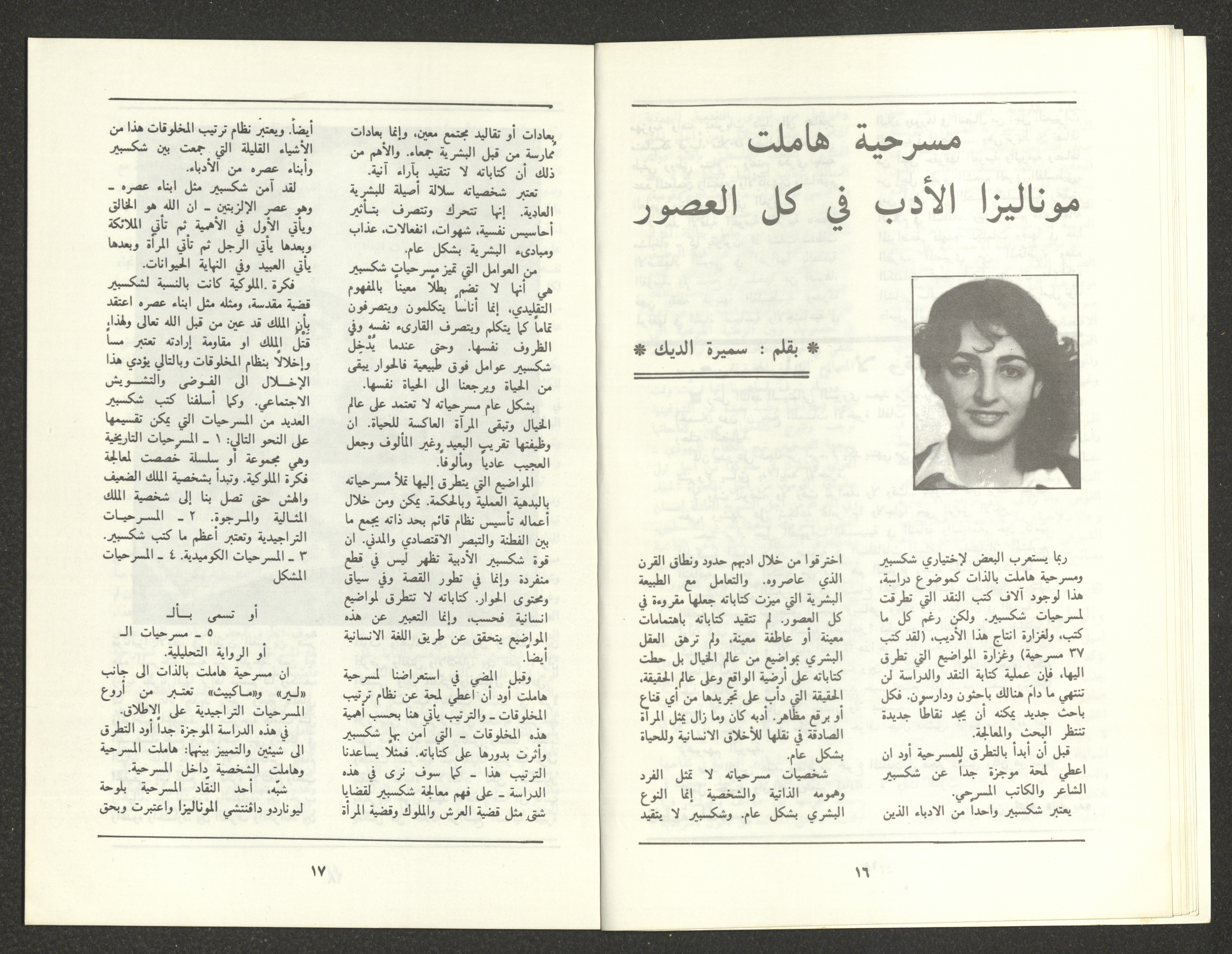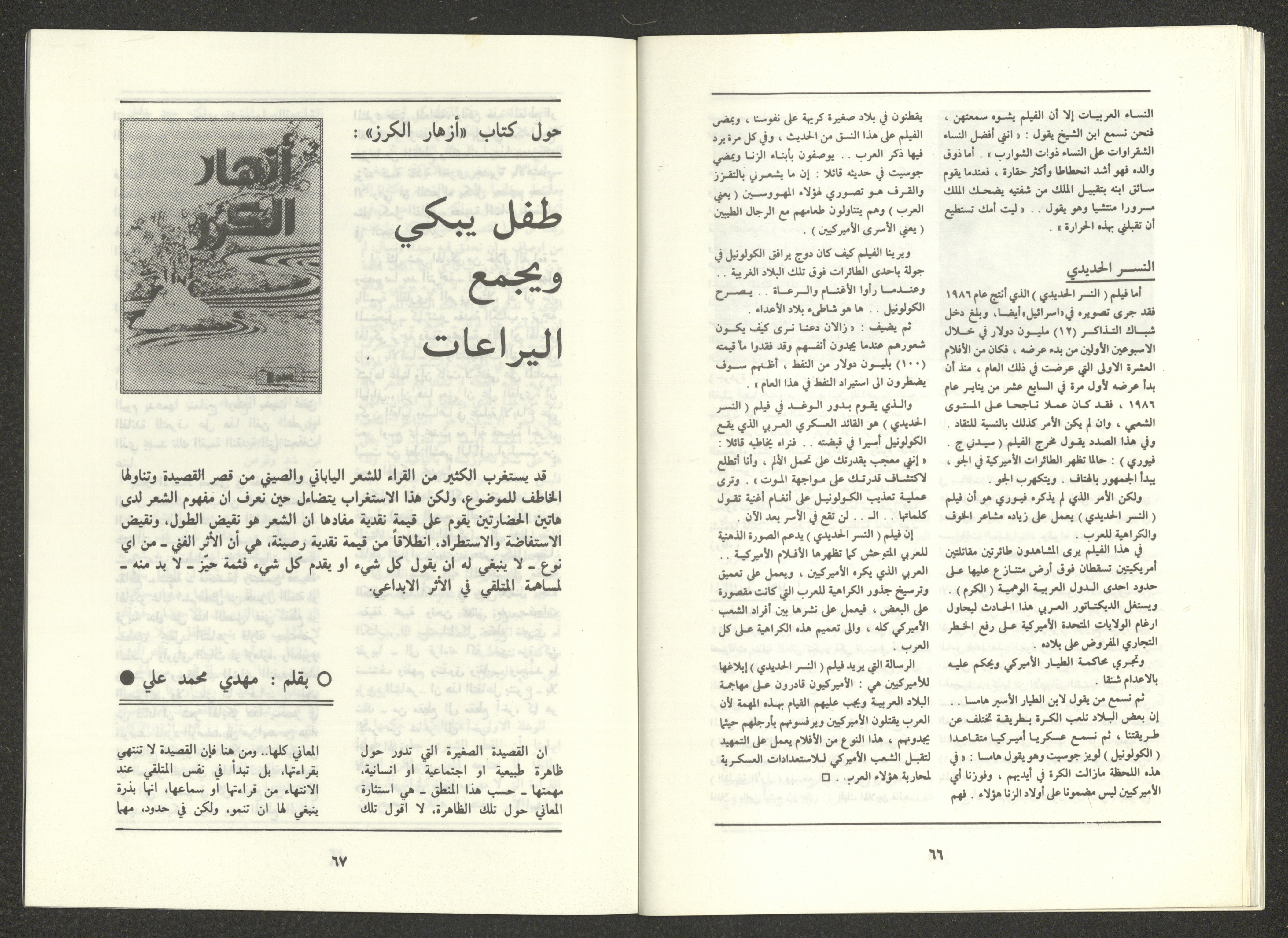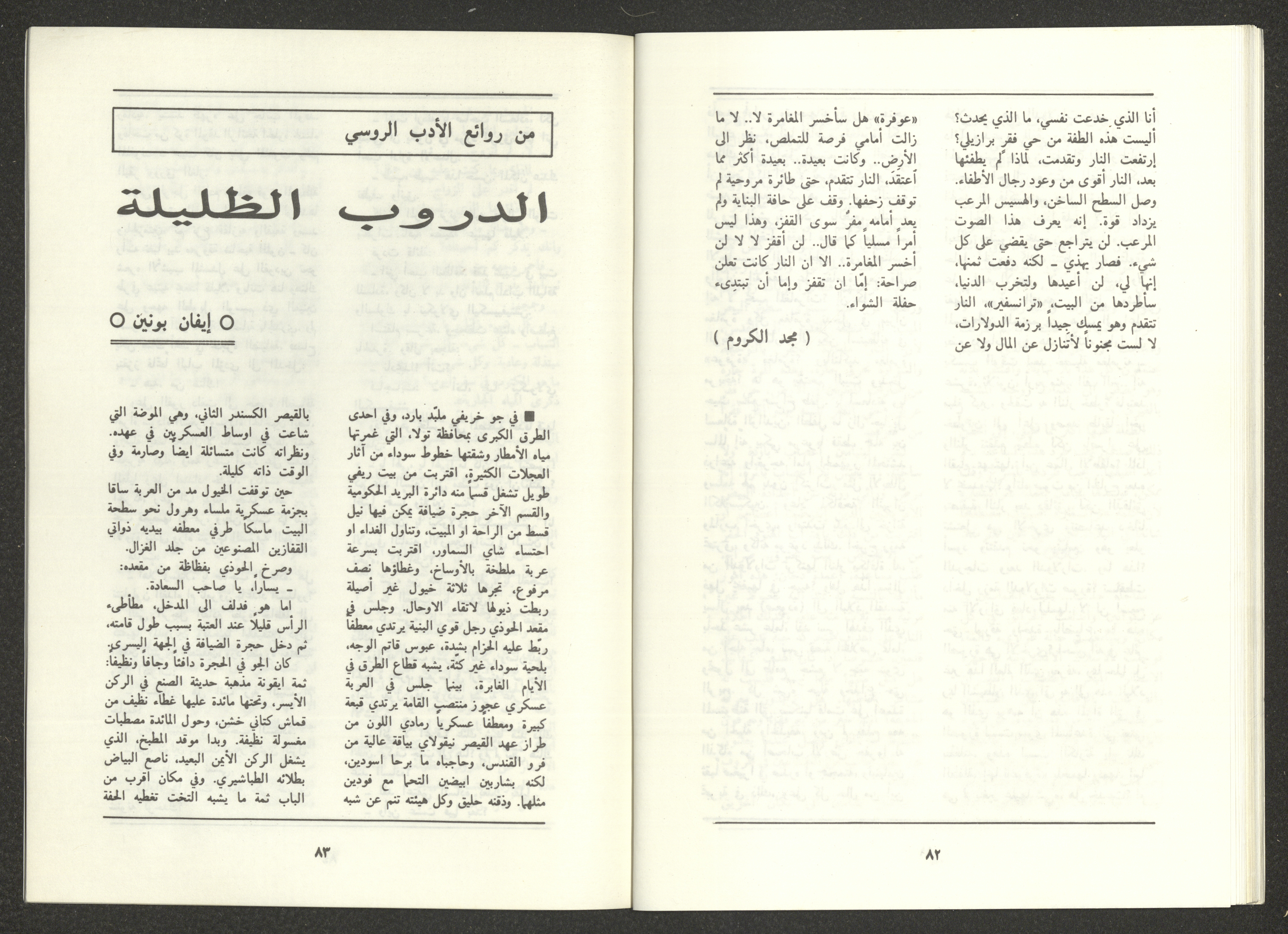 The eighth issue of the al-Jadid magazine, a monthly magazine for progressive national thought and culture, was founded in 1951 and printed in the Union Cooperative Press in Haifa, issued in August 1988 under the supervision of its first editor Hanna Naqra and its chief editor Ibrahim Malik. The cover contains a picture of the Palestinian writer Emile Touma on the third anniversary of his passing. The issue included the following: 1. The talk of the month is titled “Be Strong” by editor Ibrahim Malik. 2. An article titled “The Heritage of Emil Touma, the Spring and the Lighthouse” by Ahmad Saad. 3. An article titled “Hamlet, the Monalisa of Literature” by Samira ad-Deek. 4. An article titled “Ibn Abi Usaybi'a and the Medical History Philosophy” by Yahia Matani. 5. A study titled “The Fetal Composition of the Revolutionary Hero of Kanafani” by Qusai Hussein. 6. Poetry from the collection “I Ask No One’s Pardon” by Sameeh al-Qasem. 7. Poetry titled “Raqsat al-Farashah as-Sawda” (The Dance of the Black Butterfly). 8. Poetry titled “Al-Mohr an-Nari” (The Fire Foul) by Yousef al-Mahmoud. 9. Poetry titled “Ma Arwa ath-Thkera” (How Great the Memory Is) by Iman ar-Rafati. 10. An article titled “Discussions on the Poetry of Intifada” by Abdullah Issa. 11. An article titled “The Poetic Rhythm of the Intifada in Two Poems: Sameeh al-Qasem from Dialogue to Monologue” by al-Muthanna Ash-Sheikh Ateyyeh. 12. A study titled “Arabs as Hollywood Views Them” by Jack Shahin. 13. An article on the book “Cherry Blossoms” by Mahdi Mohammad Ali. 14. A story titled “Waiting” by Ayda Nasrallah. 15. A story titled “Fire Column” by Suheil Kiwan. 16. A Russian story titled “Dark Avenues” by Ivan Bunin. 17. Varied news of cultural and literary monthly activities.