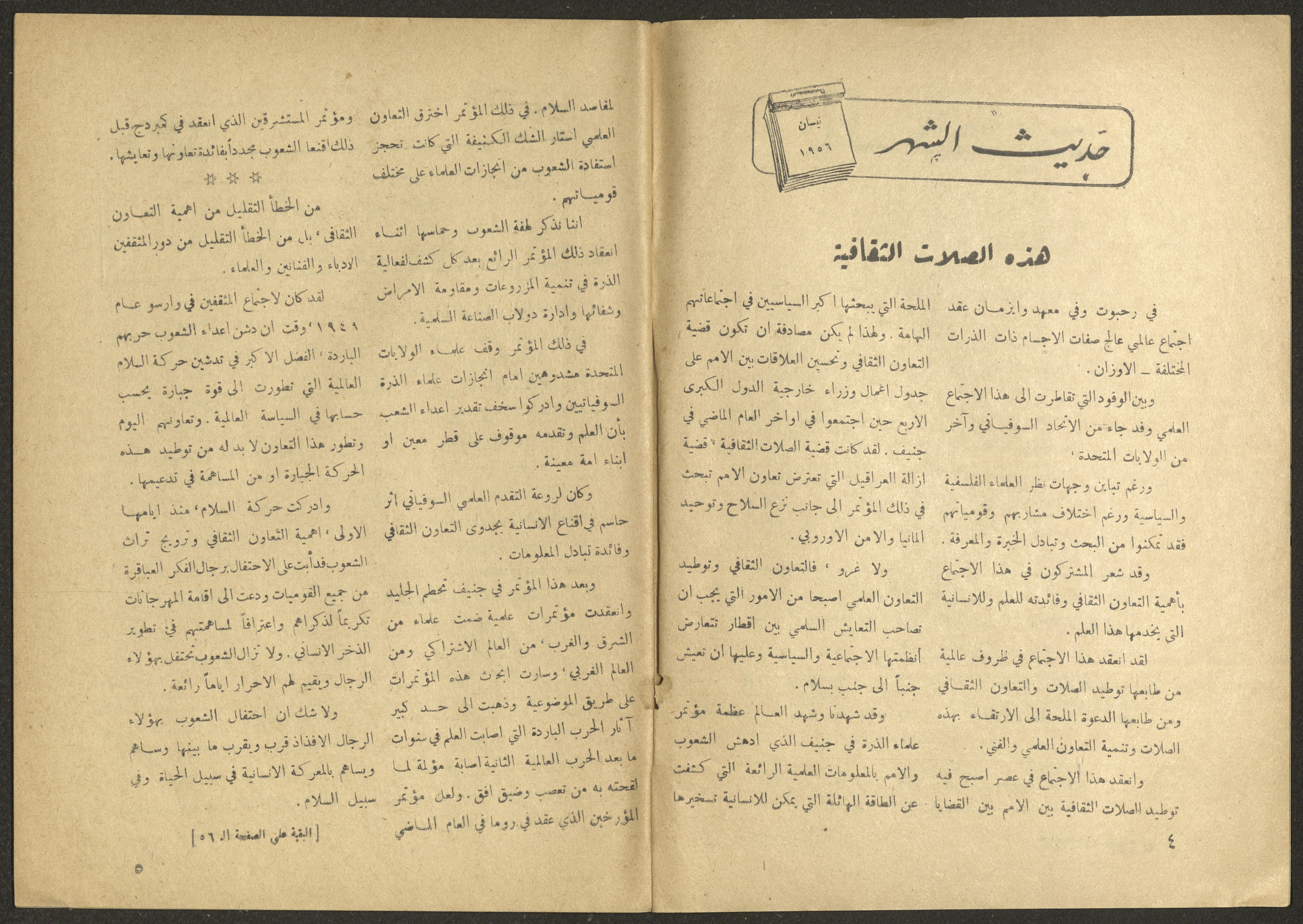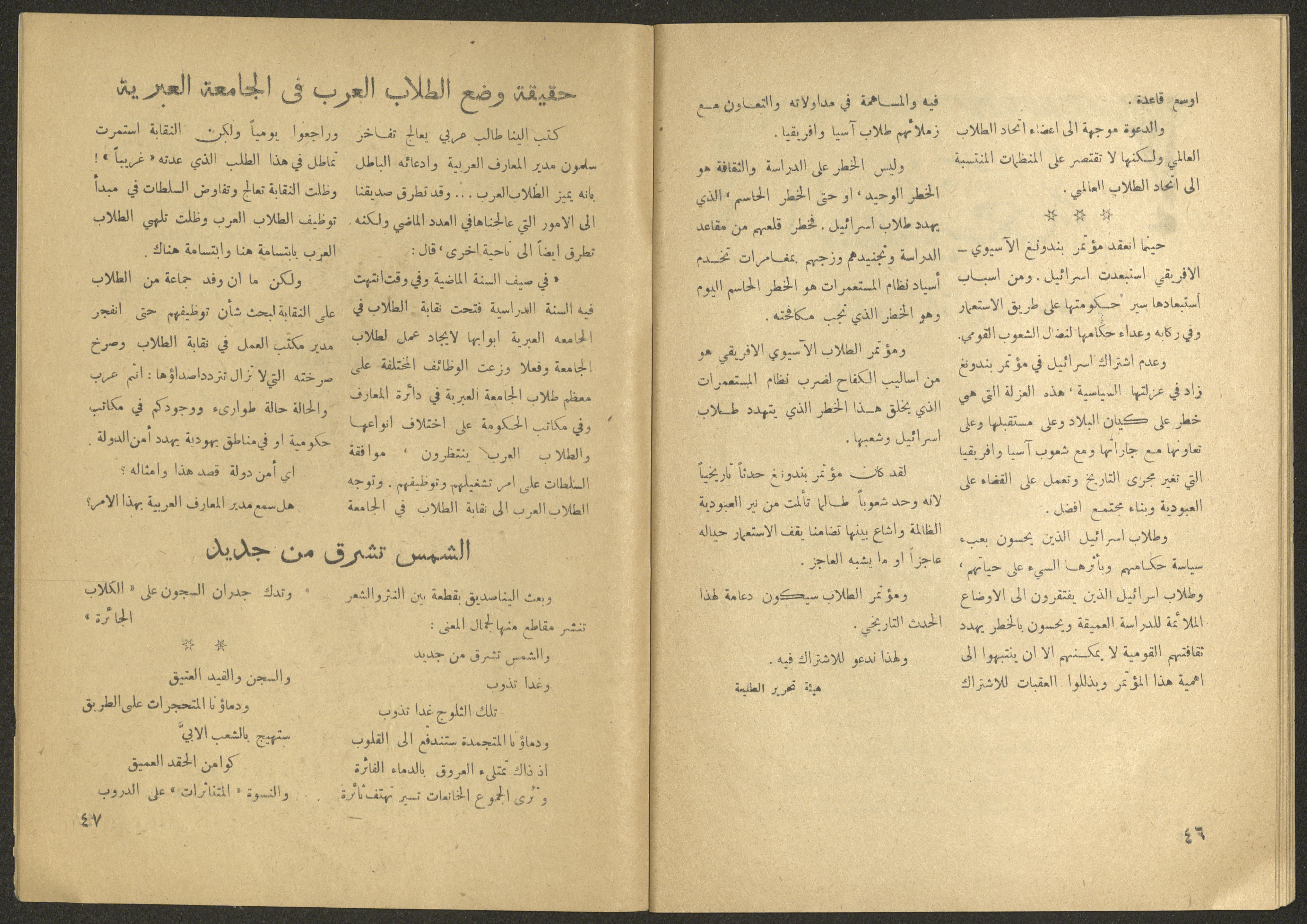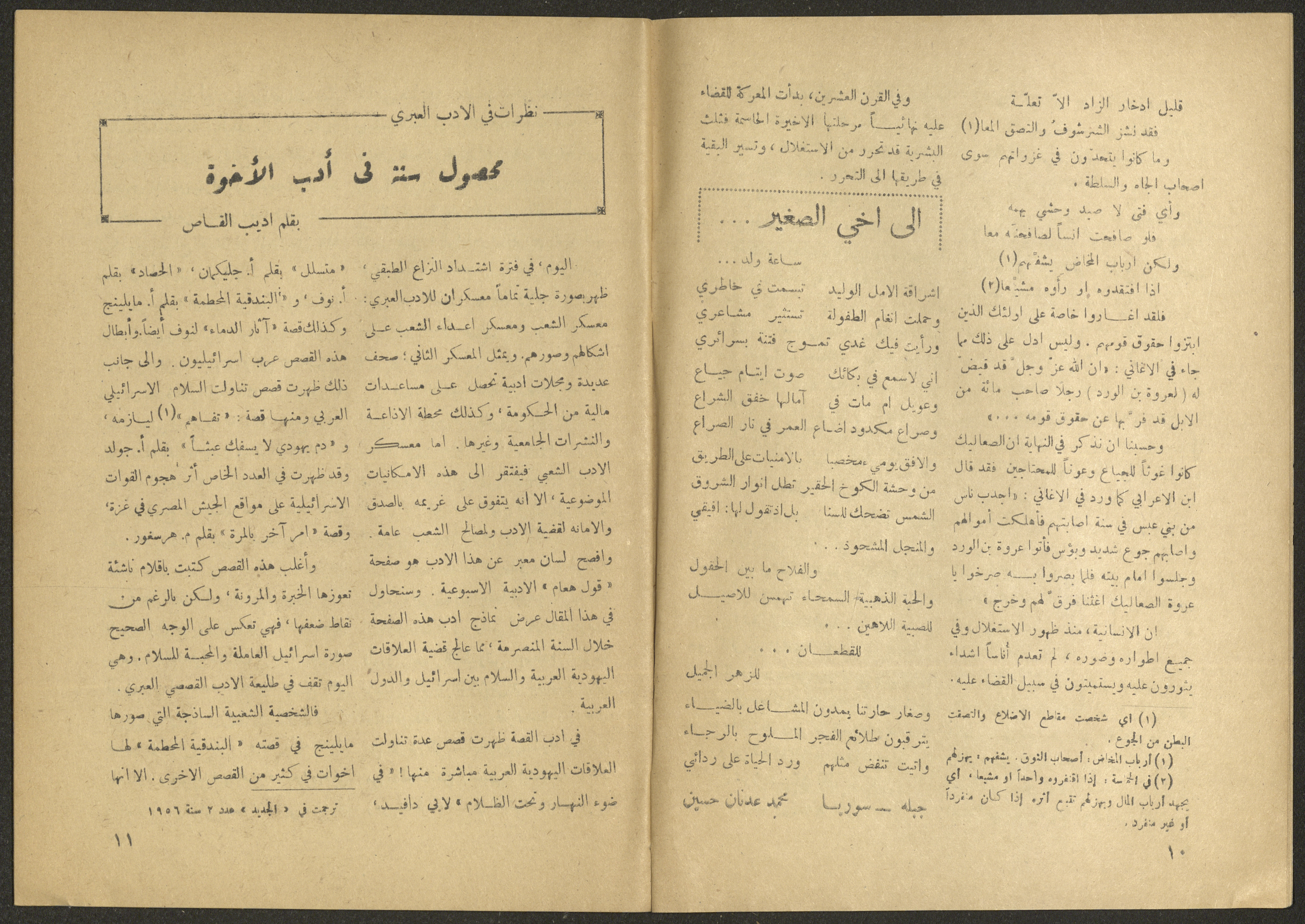 The fifth issue of the al-Jadeed magazine, a monthly magazine for progressive national thought and culture established in 1951, was issued in April 1956 under the supervision of its first editor Hanna Naqqara and printed in the Union Cooperative Press in Haifa. The issue included the following: 1. The talk of the month titled “These Cultural Connections.” 2. An article titled "The Tramps" by David Samah. 3. An article titled "Looks on Hebrew Literature" by Adib al-Qass. 4. An article titled "Al-Safi al-Najafi" by Ibrahim Khayat. 5. A poem titled "Lehaola Oghani" (For These People I Sing) by Mahran as-Sayed. 6. Essay on Mexican Art. 7. A story titled "The Desire of a Wife" by Abdel-Majid Jouda as-Sahar. 8. Students' corner titled "At-Talia". 9. A poem titled "Kon Kawkaban" (Be a Planet) by Jamal Kawar. 10. An article titled "Heine" by Alexander Dich. 11. Various literary, cultural and scientific news.