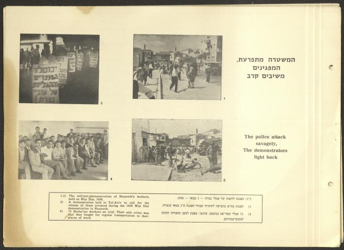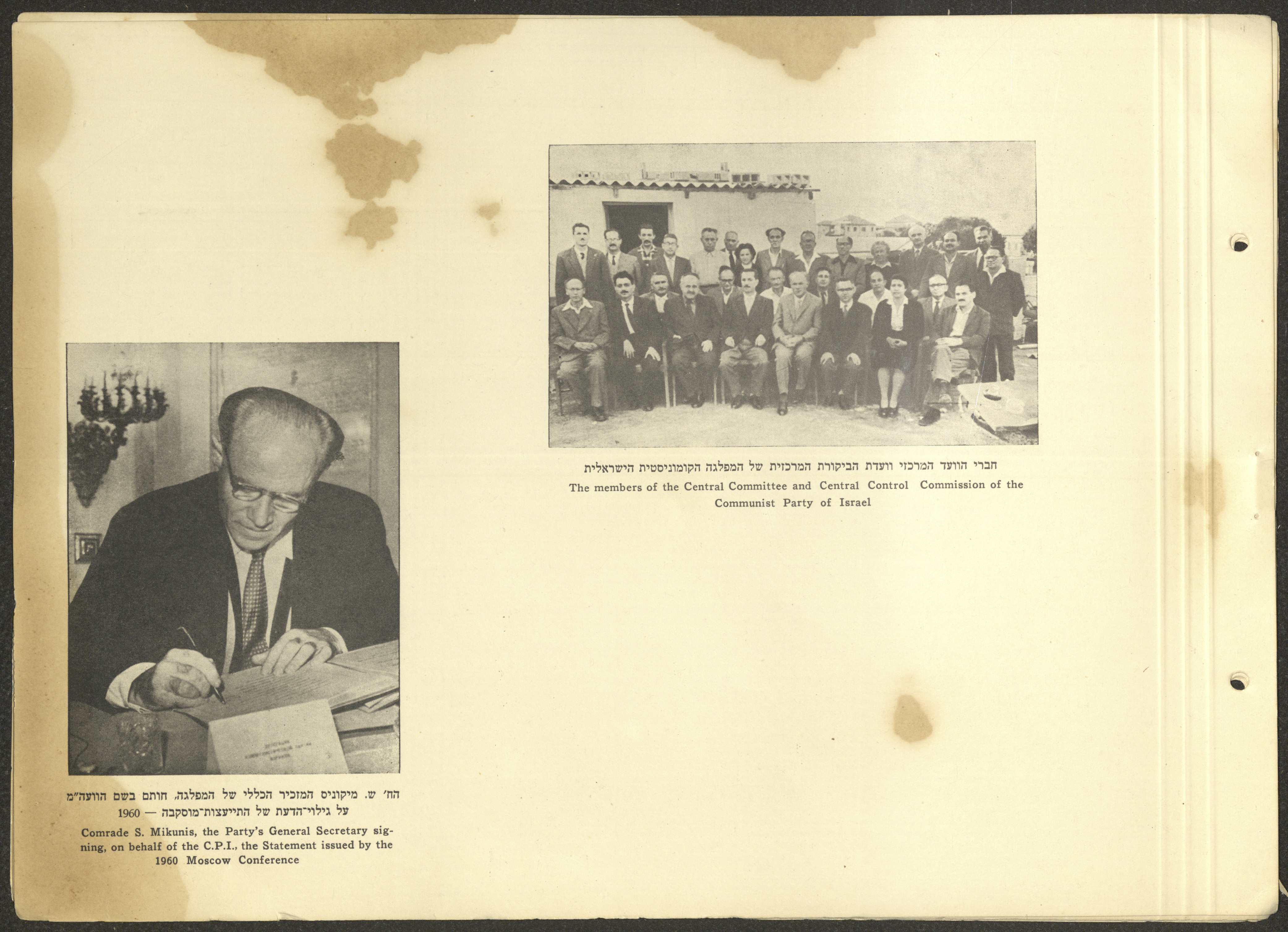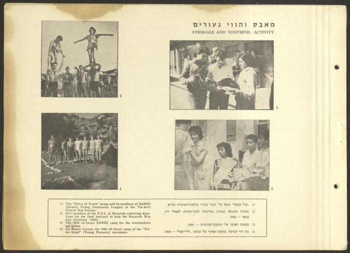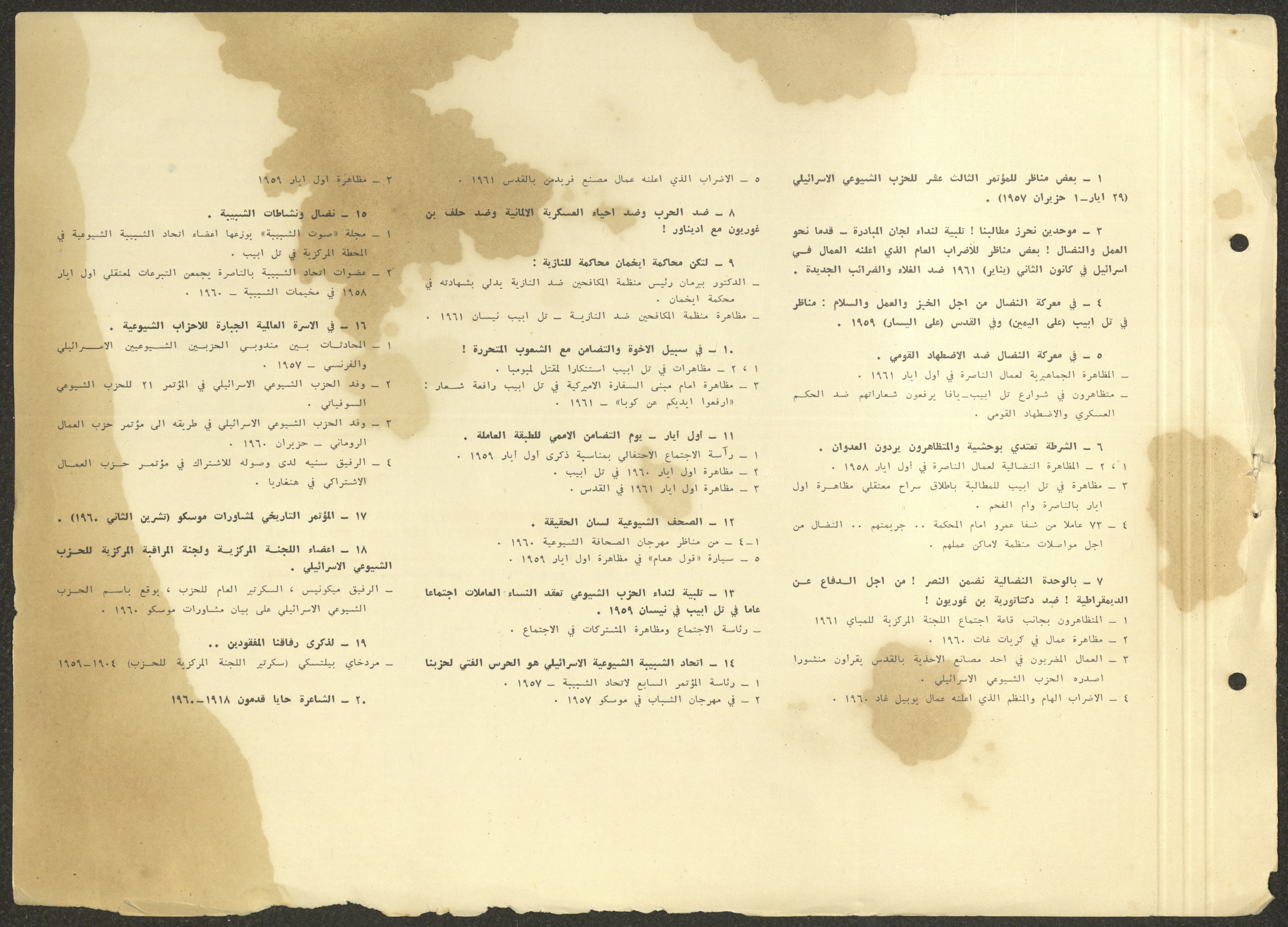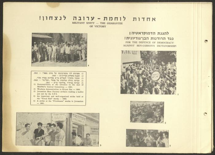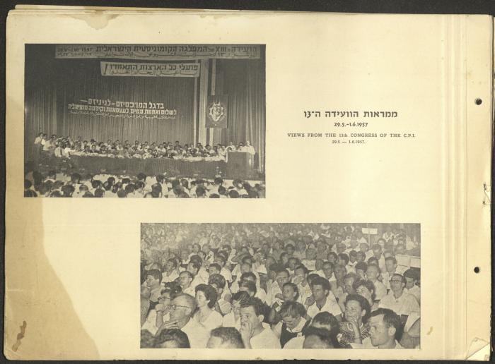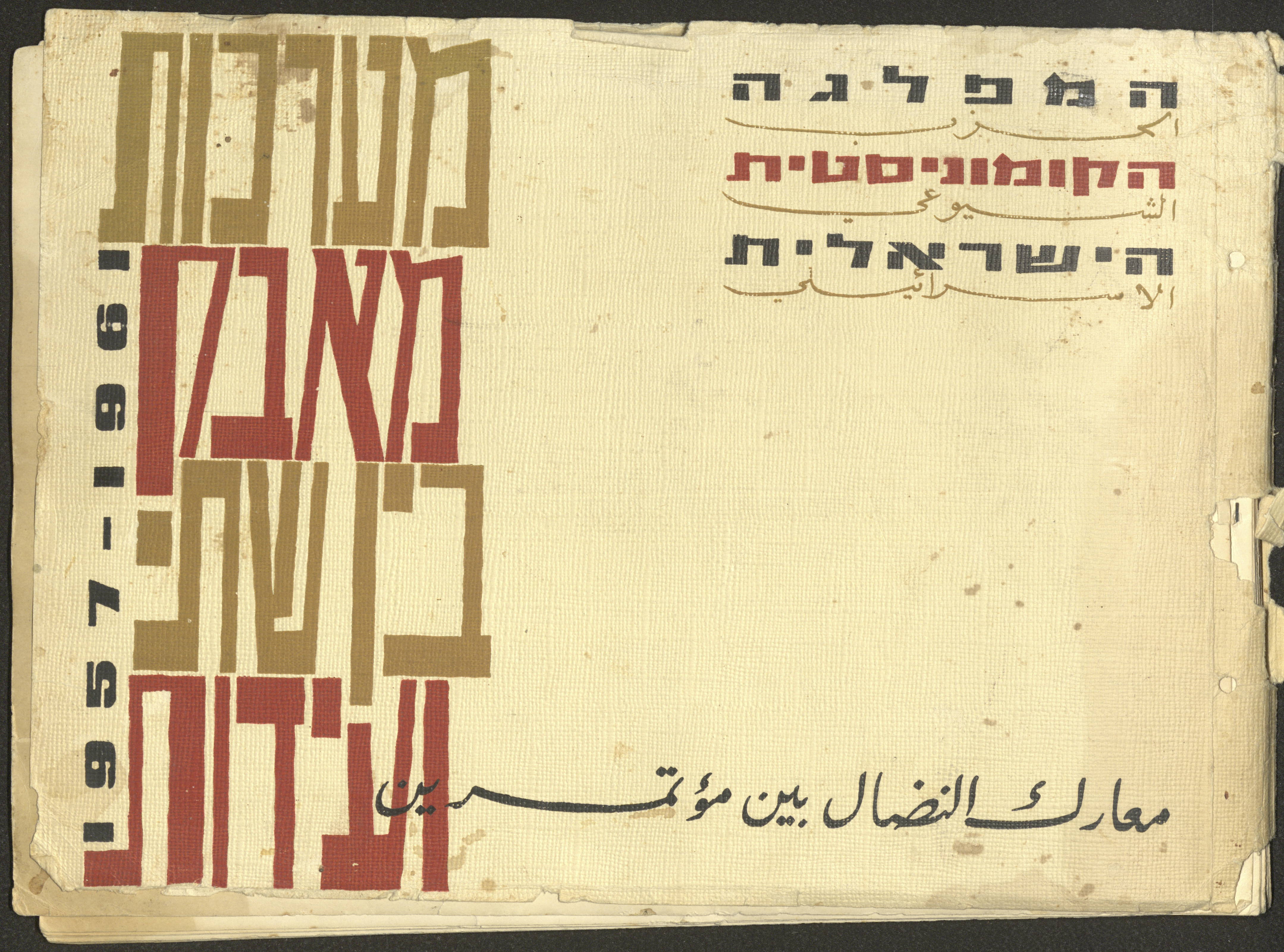 وثيقة مكتوبة باللغة العبرية تتضمن ملخصًا لأهم نشاطات الحزب الشيوعي الاسرائيلي في الفترة الممتدة ما بين دورتي مؤتمر الحزب الثالثة عشر والرابعة عشر الواقعة بين 1957-1961 بعنوان "معارك النضال بين مؤتمرين".