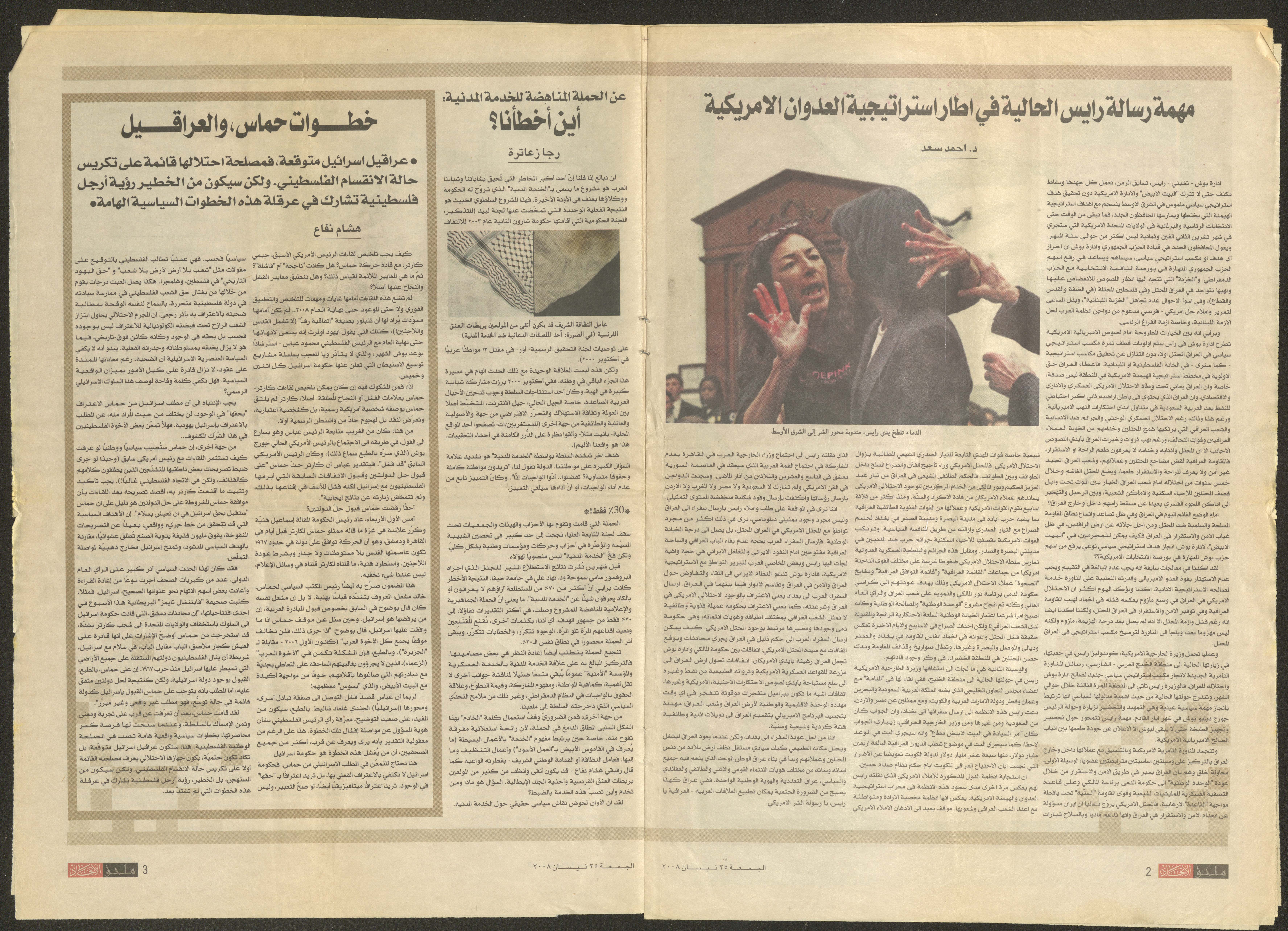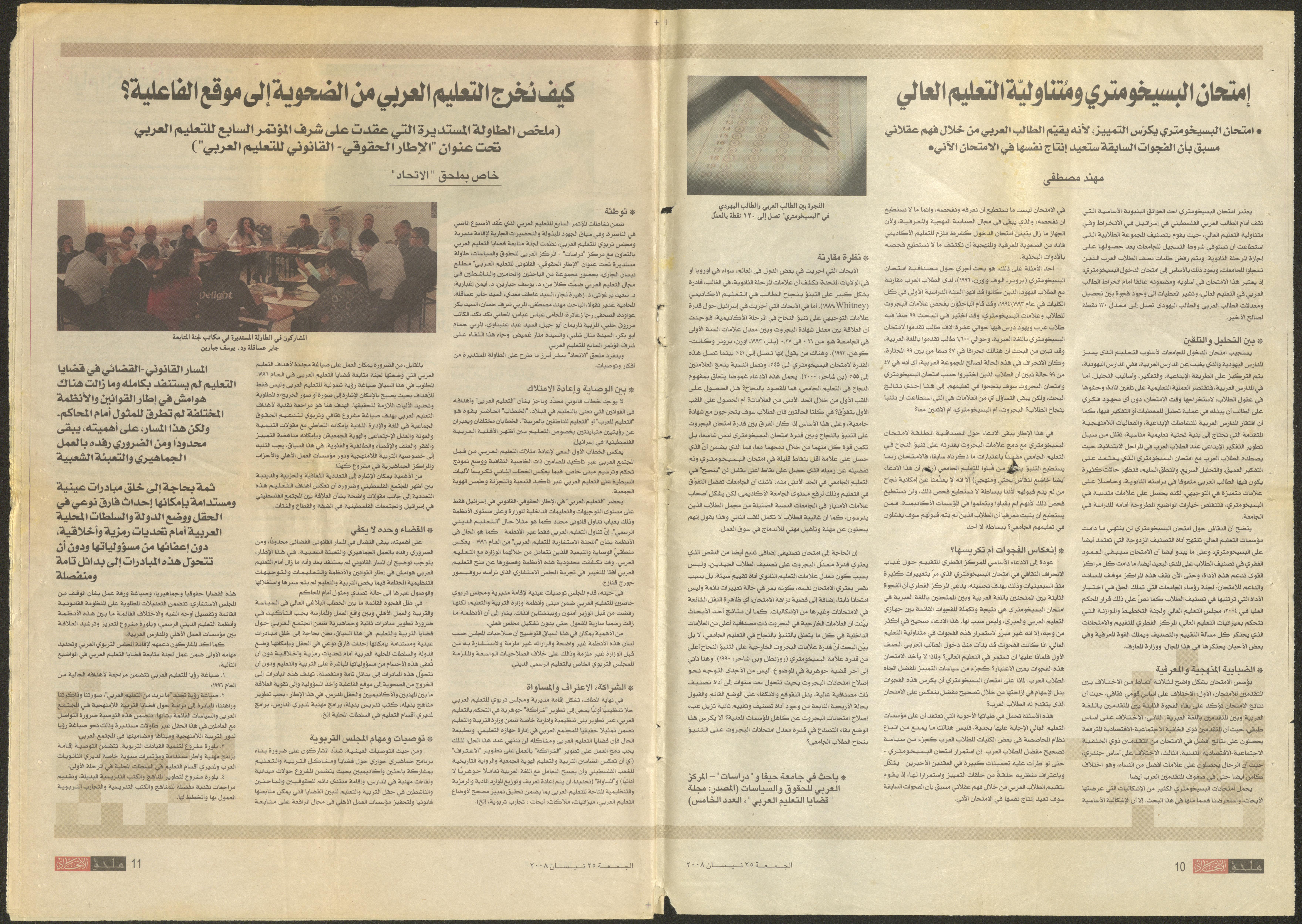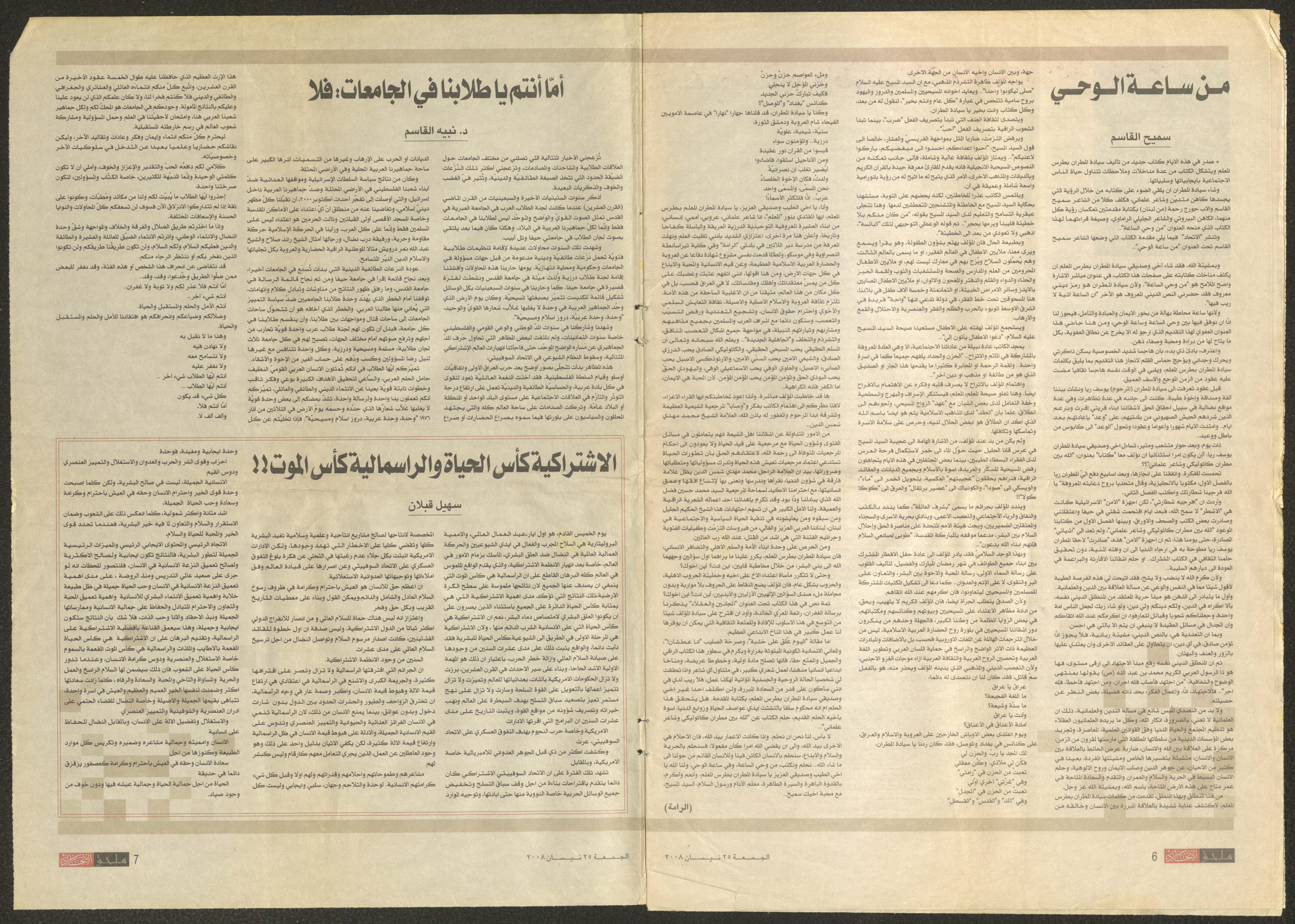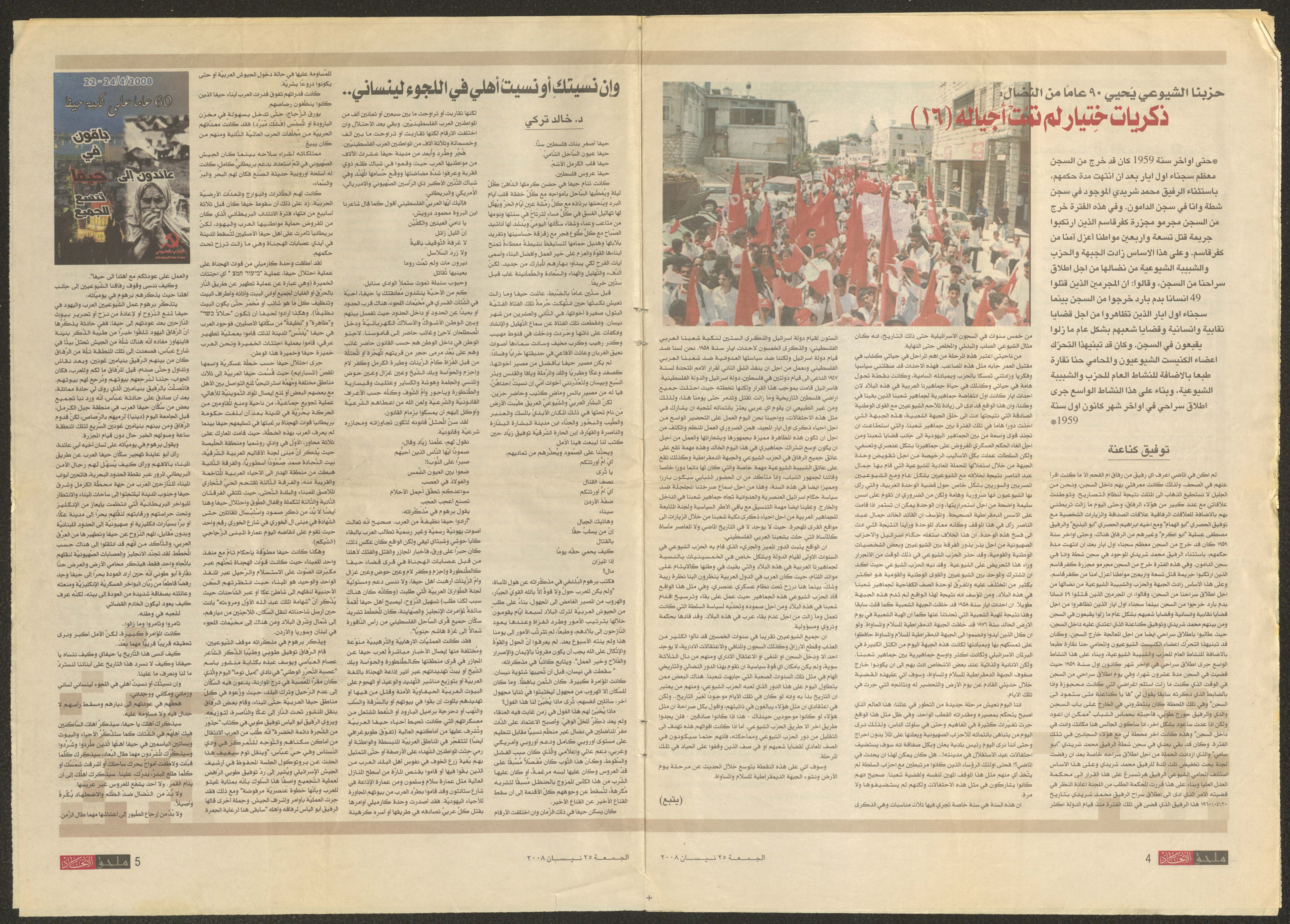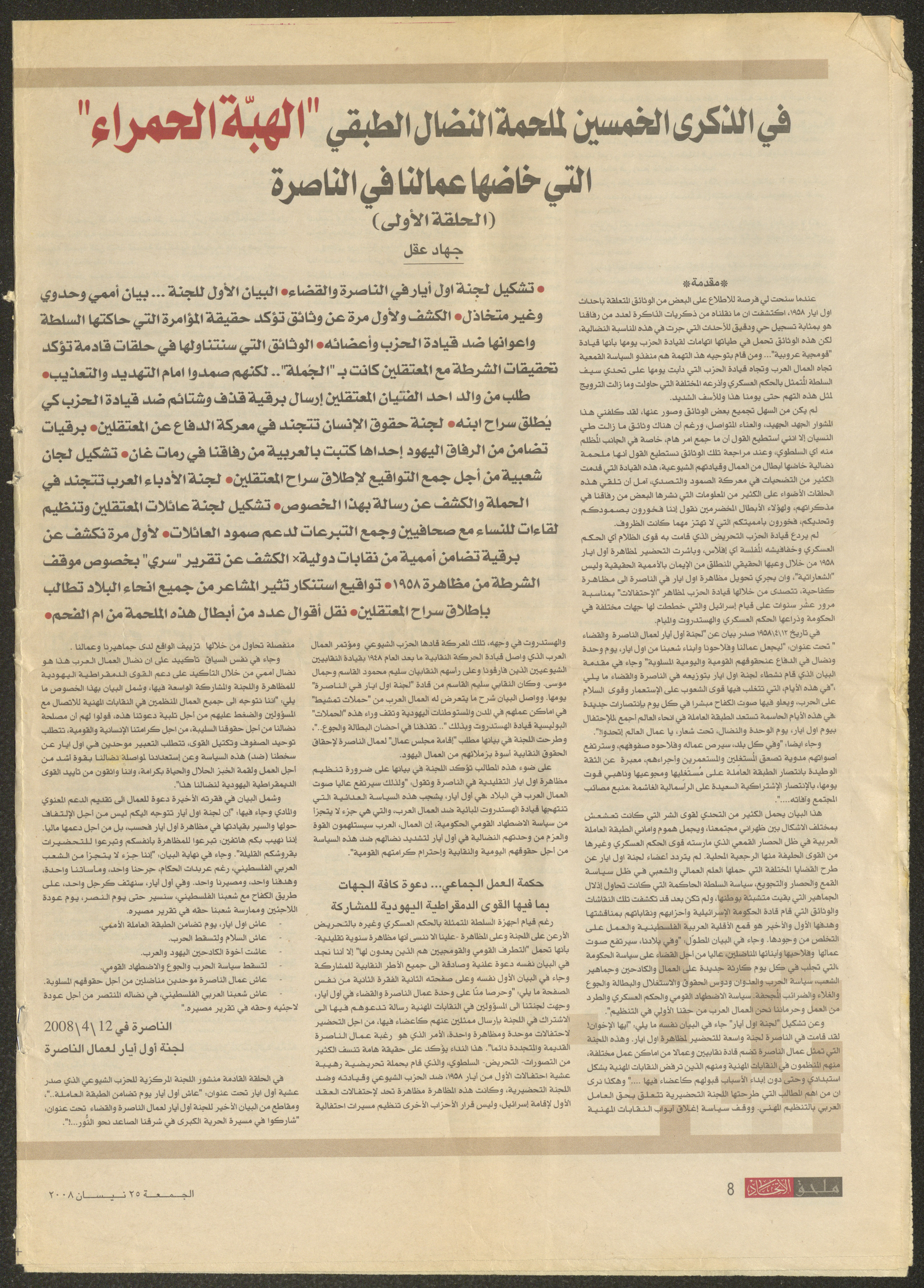 Published on 24 April 2008, this document shows al-Ittihad Newspaper supplement including an article by Nabiha Murqus about her memories when she and a group of friends from Kafr Yasif participated in the first intifada of 1958 in Nazareth.