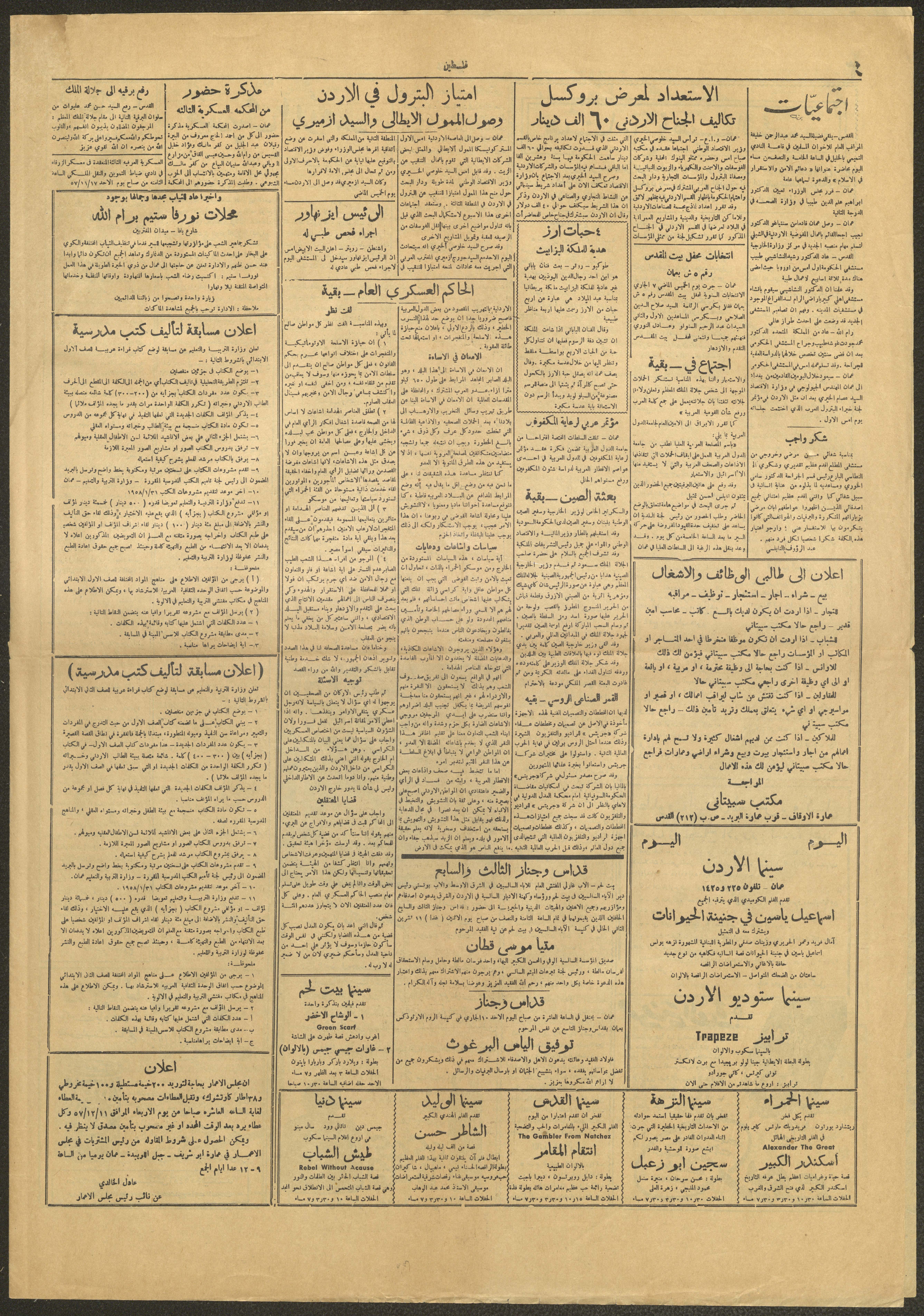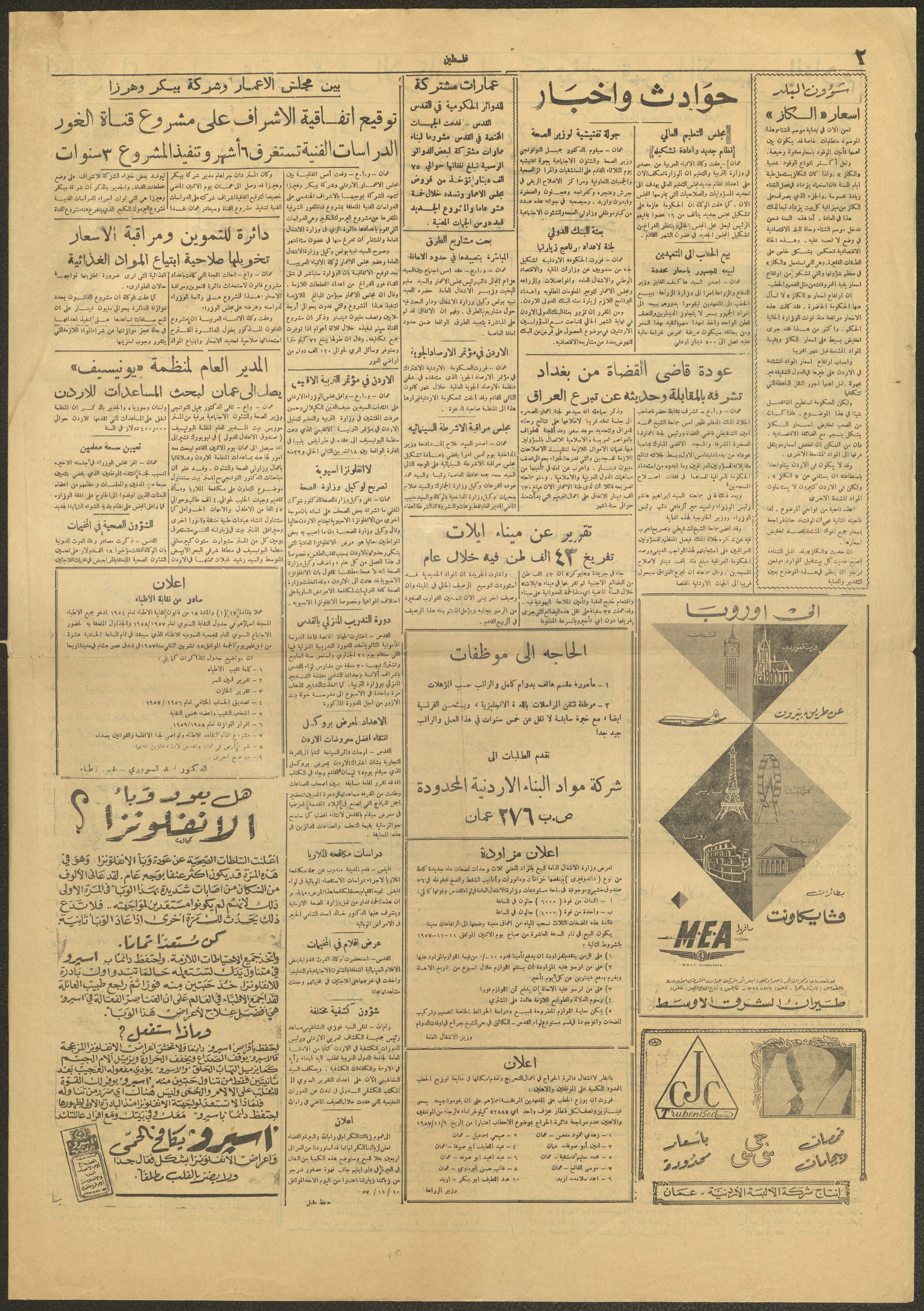 عدد جريدة فلسطين الذي صدر بتاريخ 10 تشرين الثاني 1957، وهي جريدة سياسية إخبارية مصورة تأسست سنة 1911 على يد عيسى داوود العيسى. يضم العدد مجموعة من المواضيع والعناوين، منها: 1- اجتماع في بلدية نابلس ضم رجالات المدينة وأعيانها وقد أعرب الجميع عن استيائهم واستنكارهم للحملات التي تذيعها الإذاعات والصحف العربية. 2- حوالي خمسمئة لاجئ فلسطيني وسوري أبعدو عن الأراضي اللبنانية. 3- اتفاقية بين مجلس الإعمار الأردني وشركة بيكر وهيرزا تتعهد الشركة بموجبها بالإشراف الهندسي على الدراسات الفنية المتعلقة بمشروع قناة الغور الشرقية. 4- المدير العام لمنظمة اليونيسيف يصل إلى عمان للبحث في موضوع مساعدات الأردن. 5- إعلانات لسينما الأردن وسينما الحمراء والقدس وغيرها.