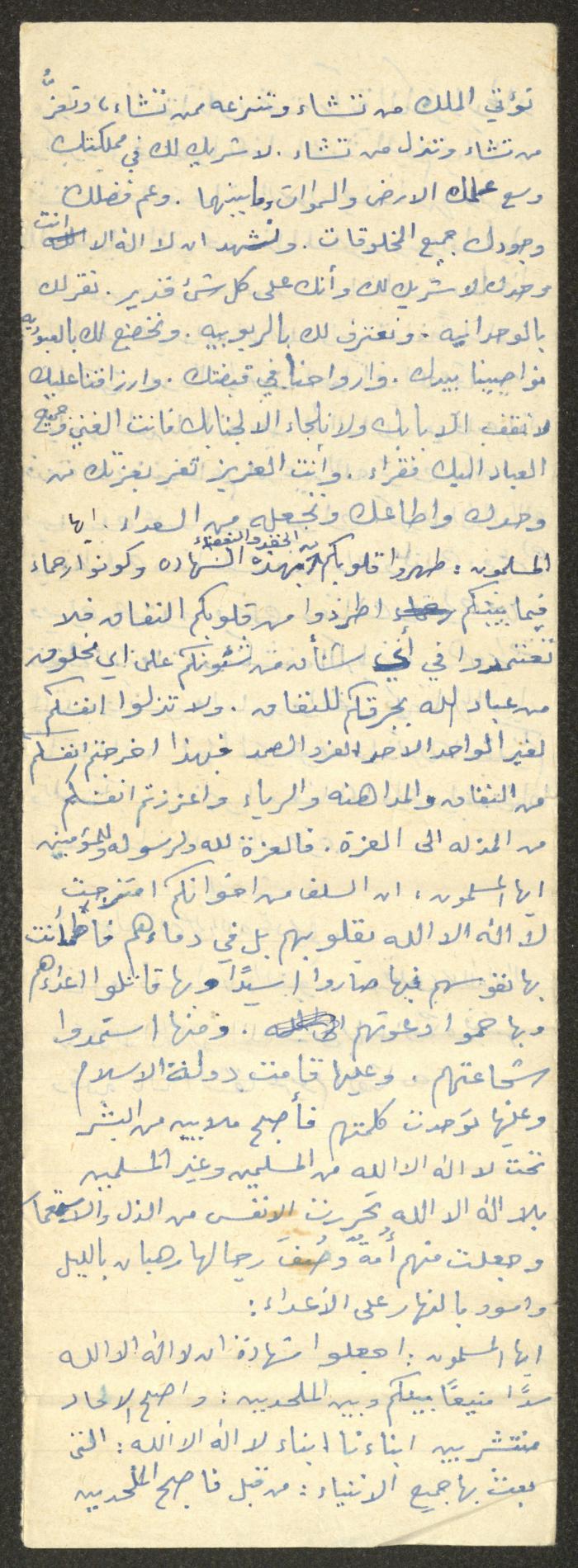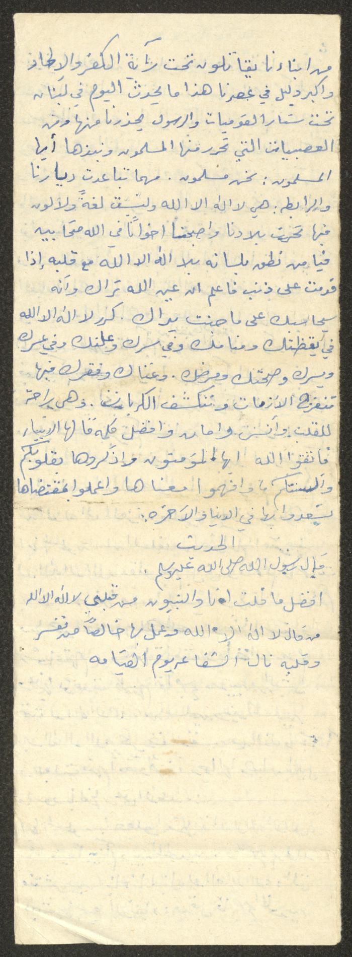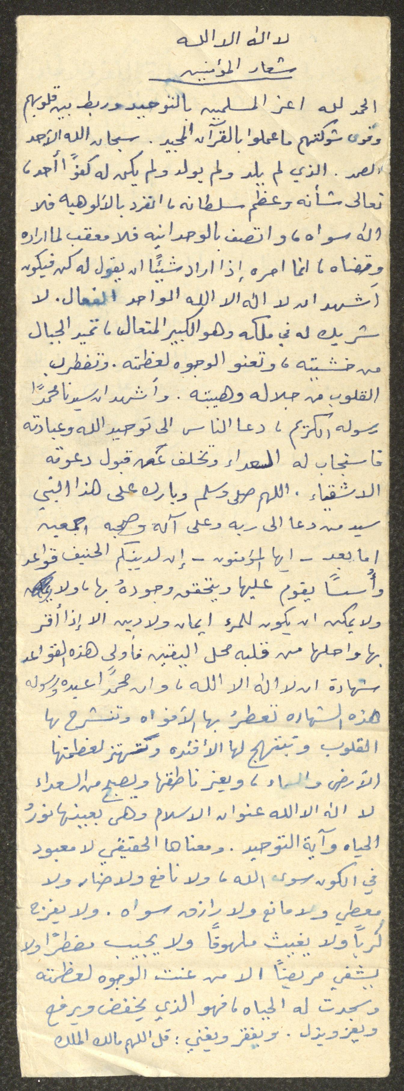 Handwritten, this document shows a Friday Khutbah titled "Shahada, the Badge of Muslims" given by Imam Marouf Shtayyeh at a mosque in the village of Salem in the 1970s, which he began by praising Allah, then he spoke of the importance of the Shahada in Islam.