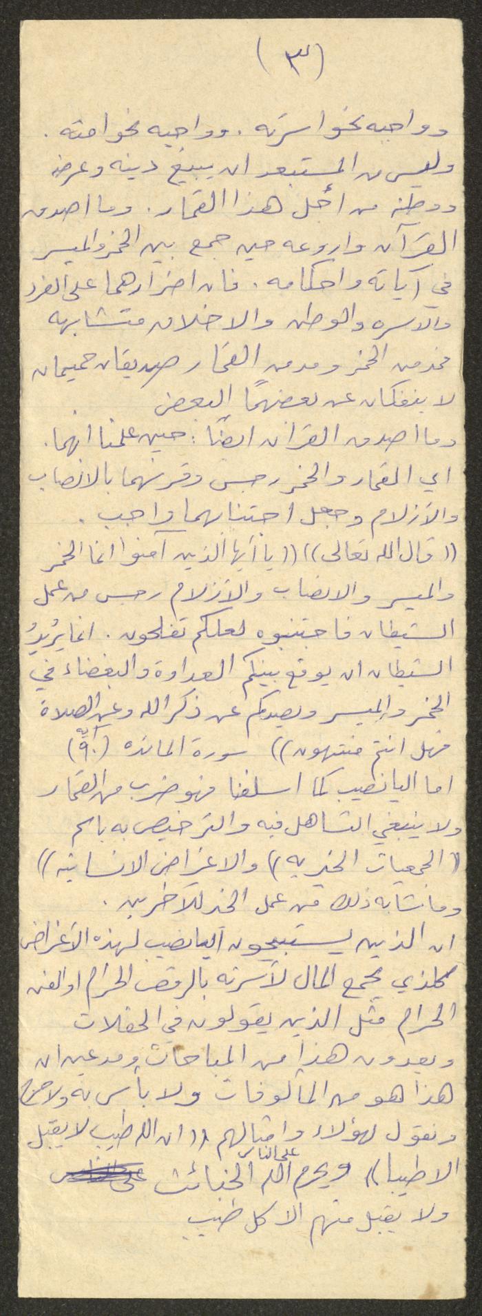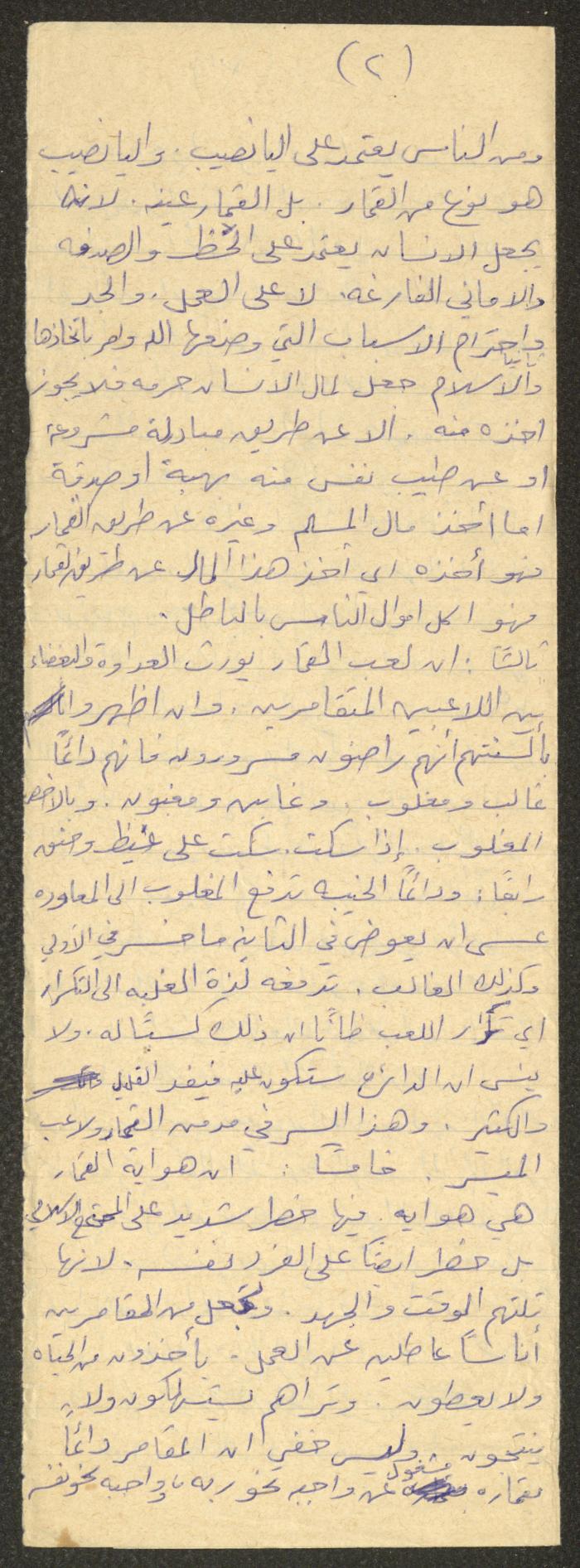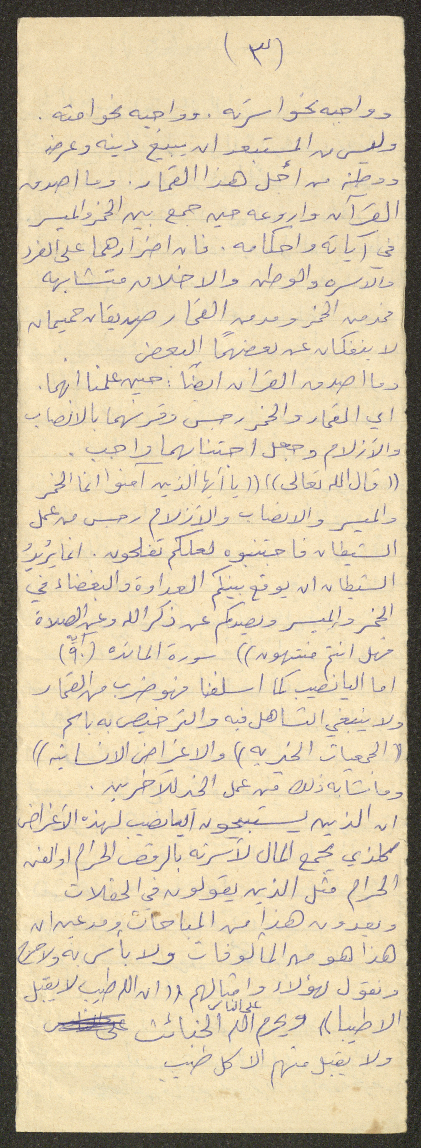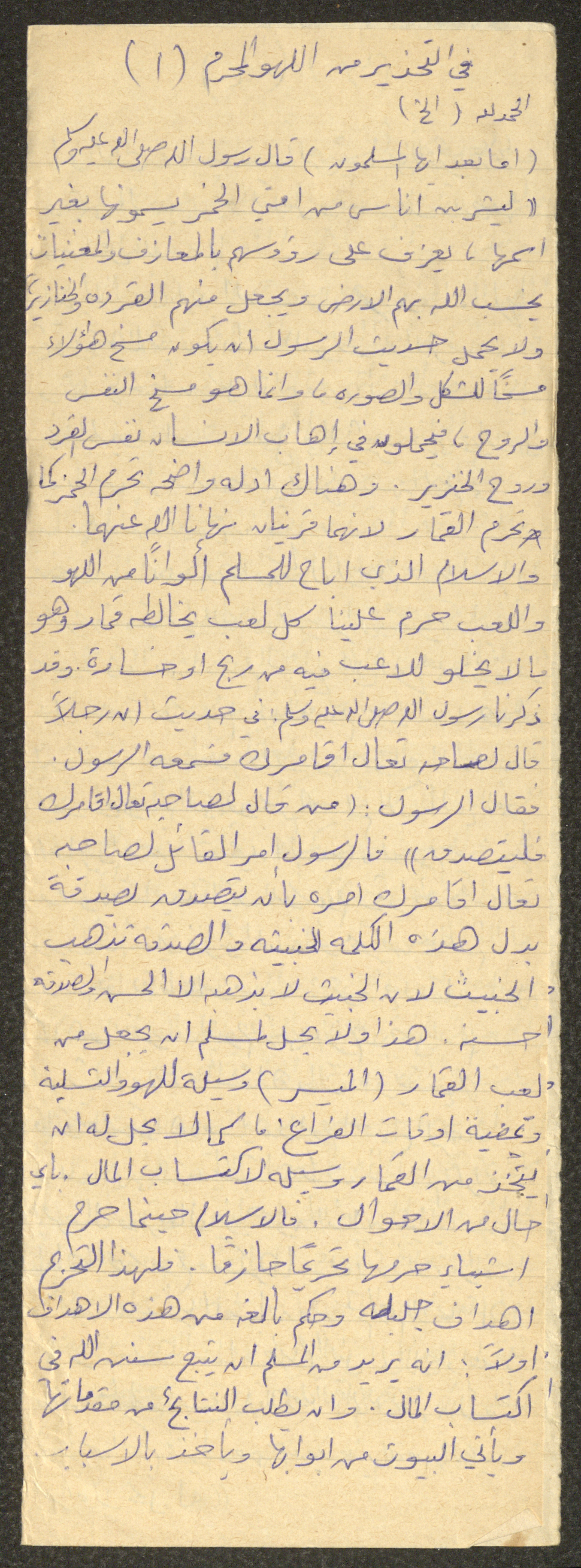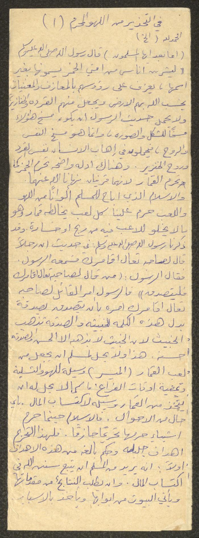 Handwritten, this document shows a Friday Khutbah titled "Warning Against Forbidden Pastimes" given by Imam Marouf Shtayyeh at a mosque in the village of Salem in the 1970s, which he began by praising Allah, and then mentioned that Islam forbade gambling.
