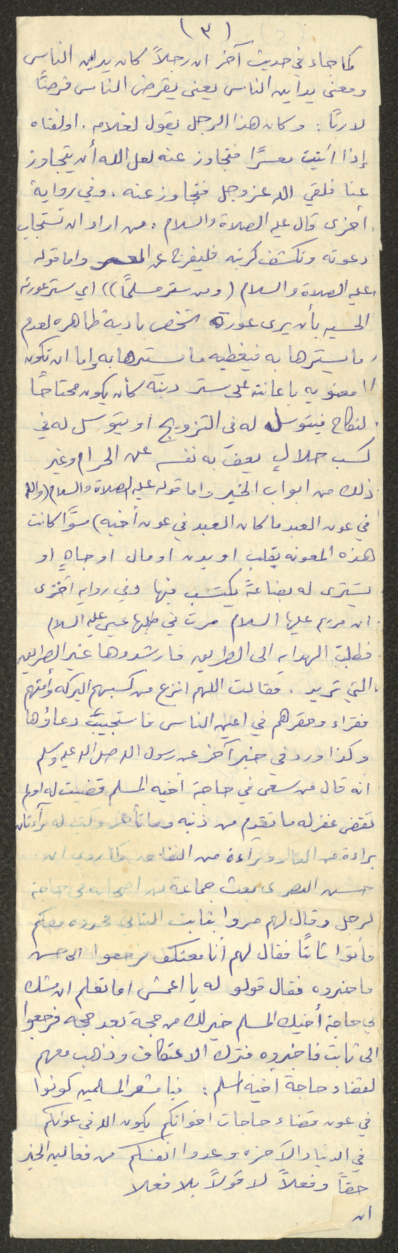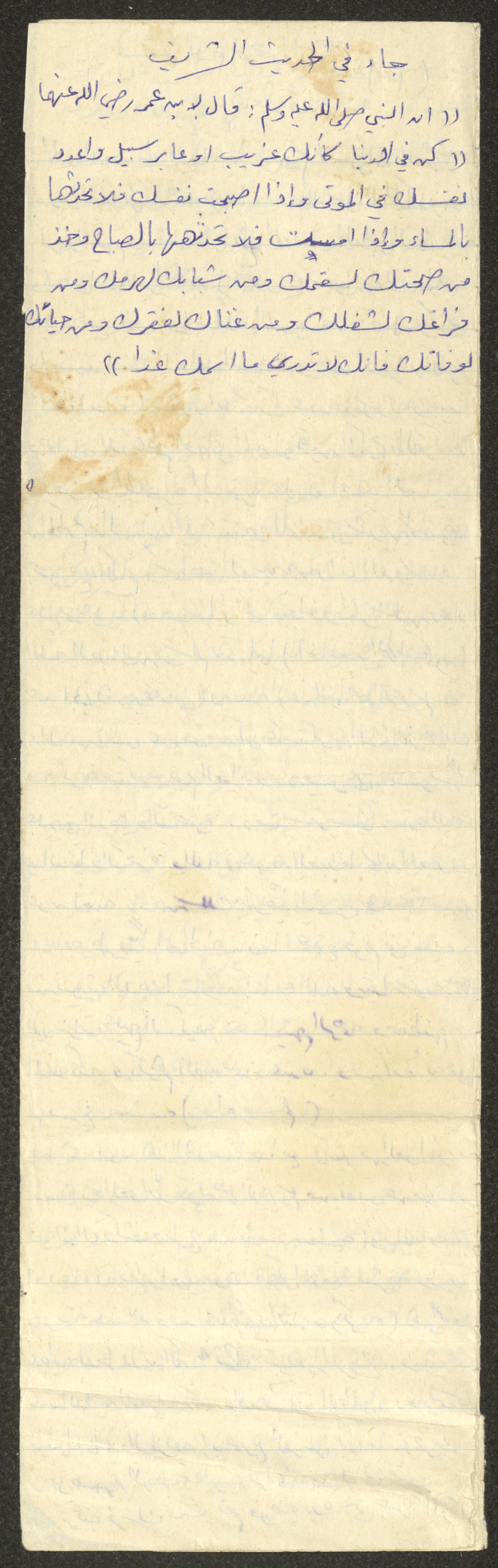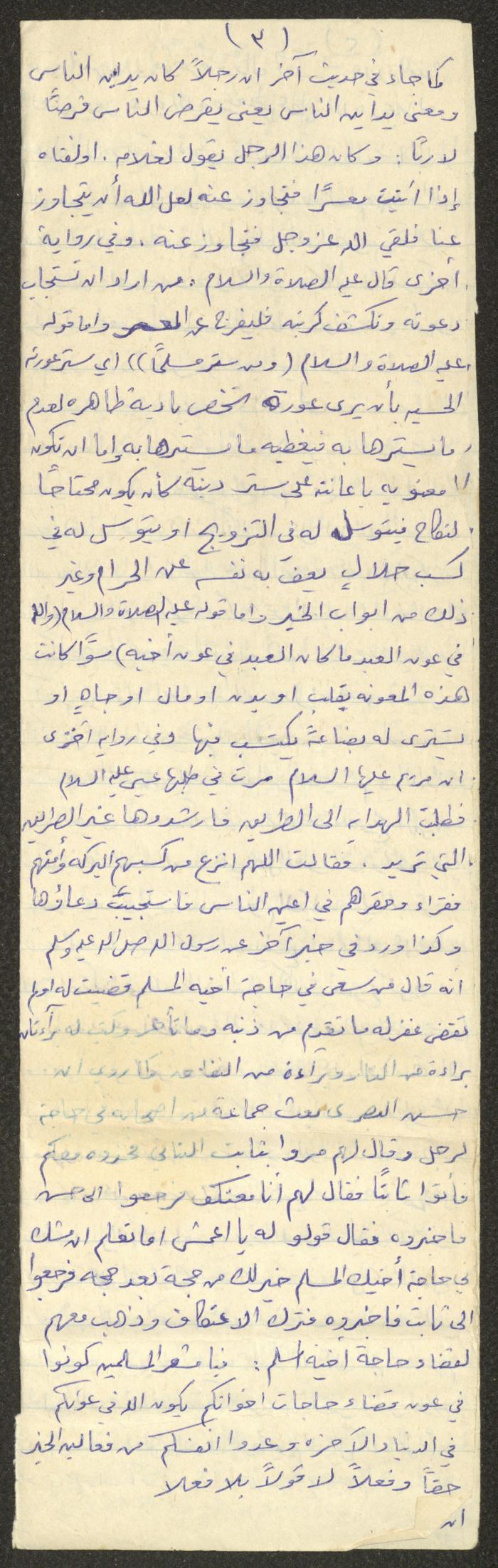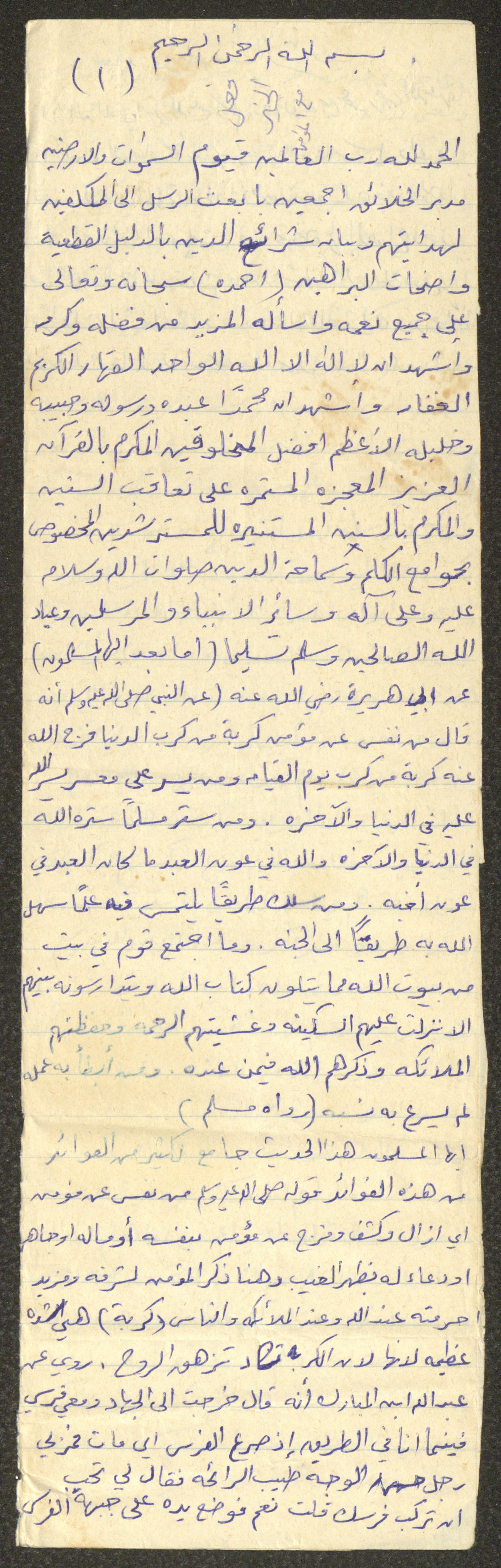 Handwritten, this document shows a Friday Khutbah titled "Doing Good unto Believers" given by Imam Marouf Shtayyeh at a mosque in the village of Salem in the 1970s, which he began by praising Allah and mentioning the importance of believers doing good and helping each other, where he added the Hadiths and Quran verses persuing doing good unto believers.
