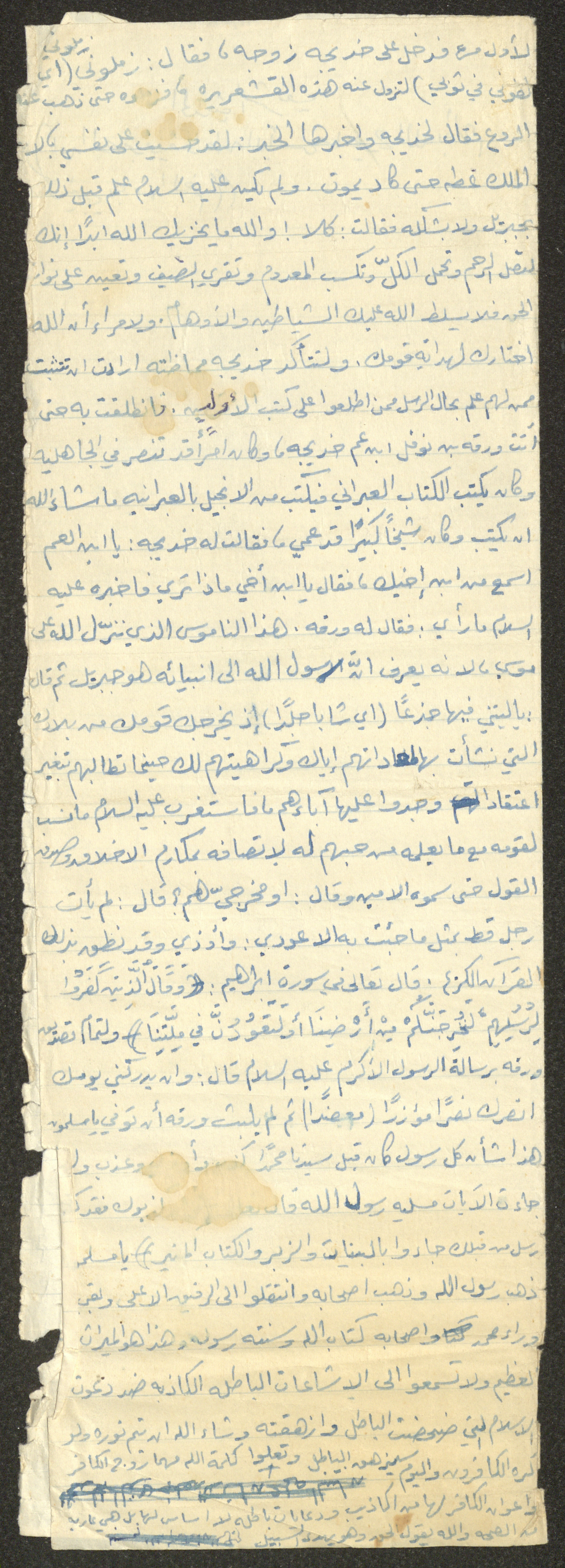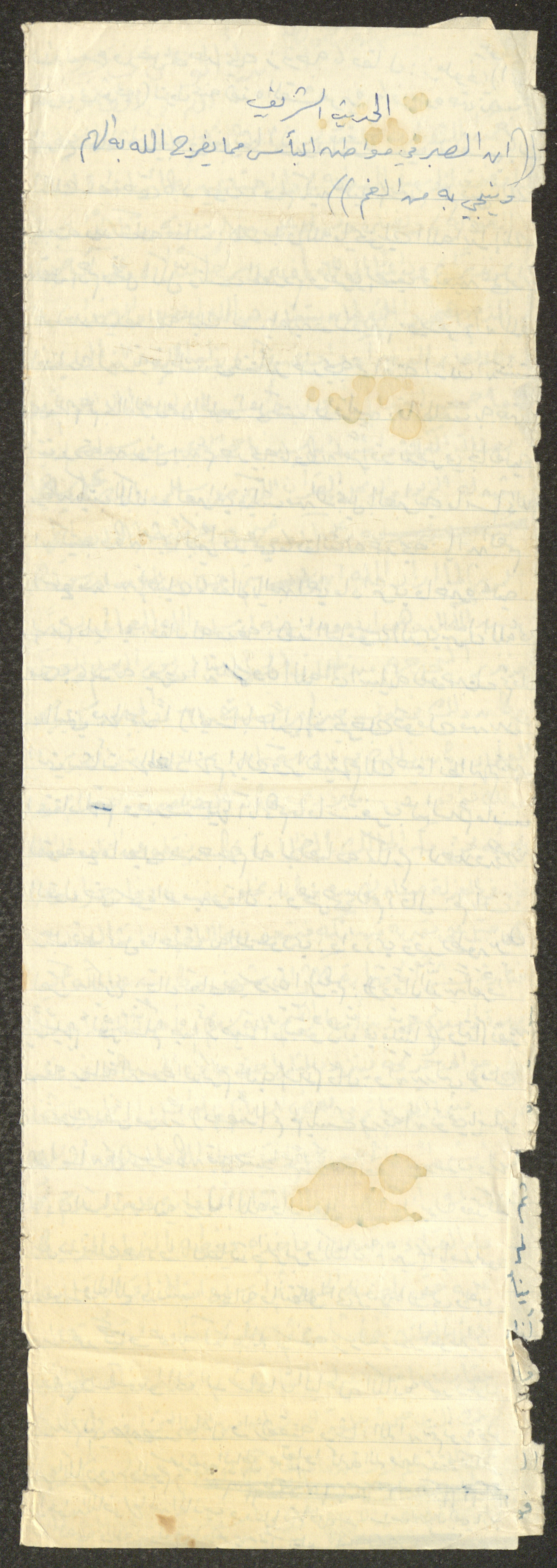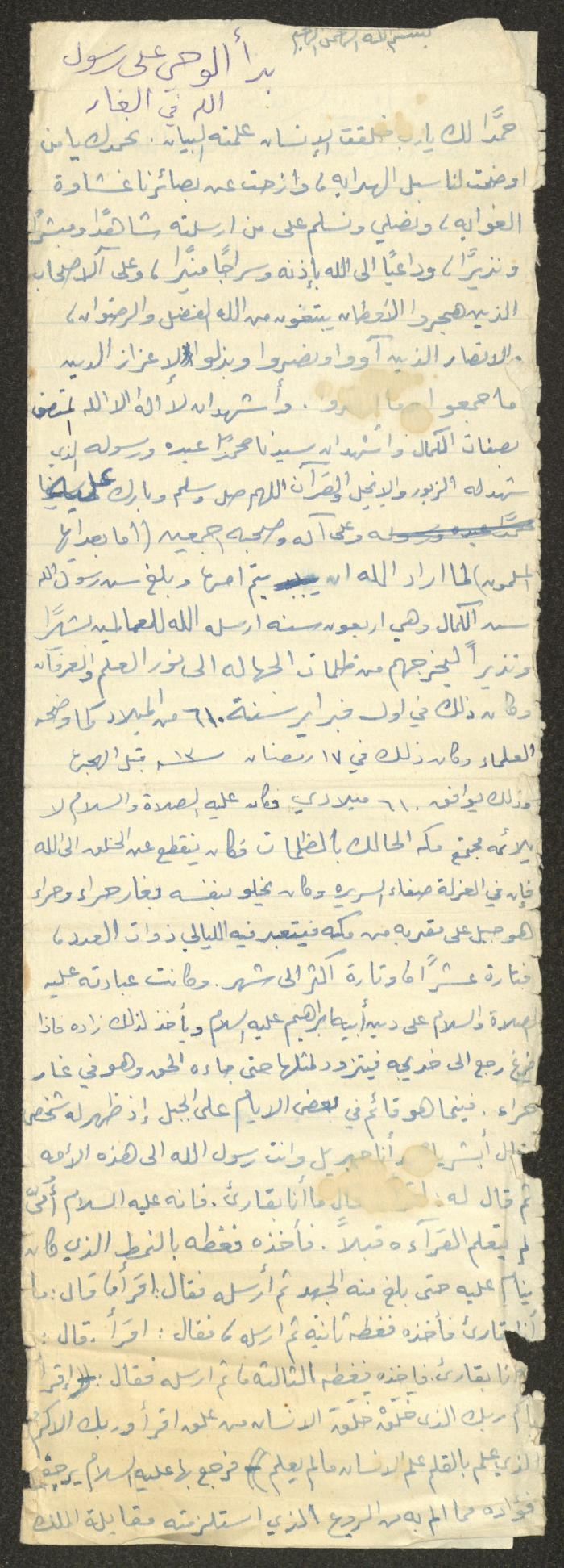 Handwritten, this document shows a Friday Khutbah titled "The Beginning of Wahi for the Prophet at the Cave" given by Imam Marouf Shtayyeh at a mosque in the village of Salem to the northeast of Nablus in the 1970s, which he began by praising Allah and mentioning the Wahy coming to Prophet Mohammad at the Hira Cave and supporting that with Hadiths and Quran verses.