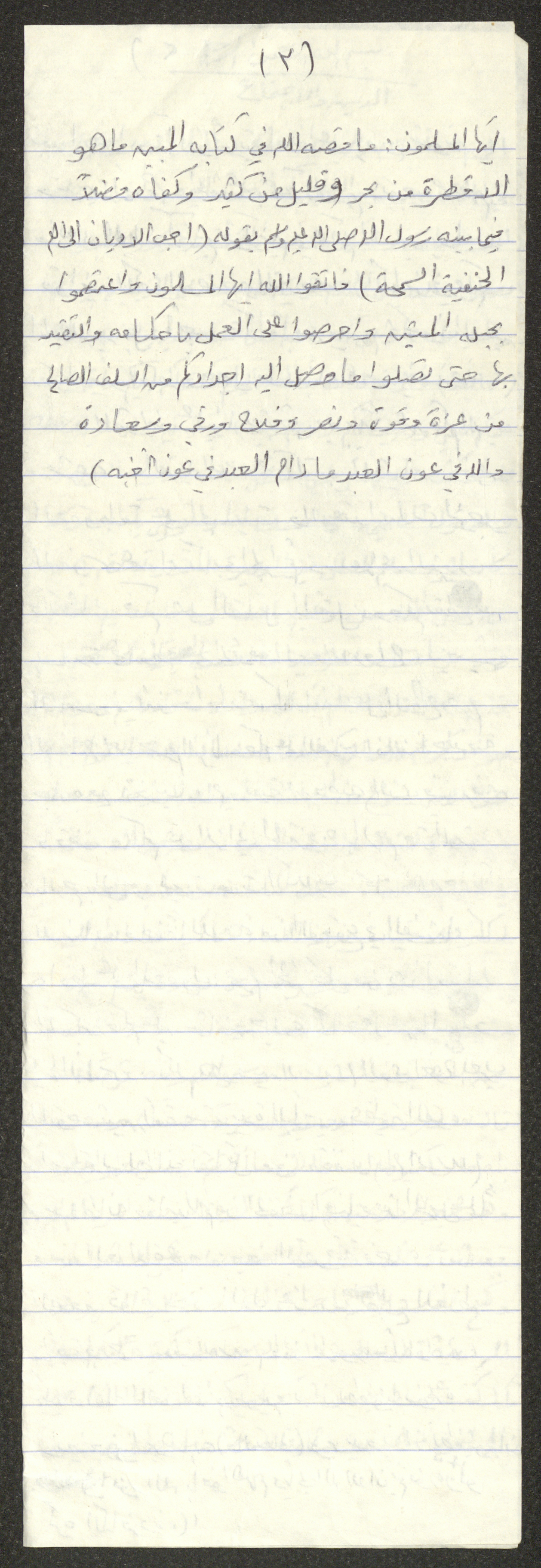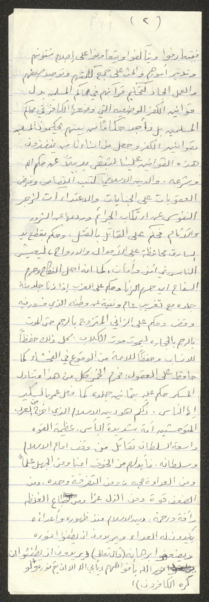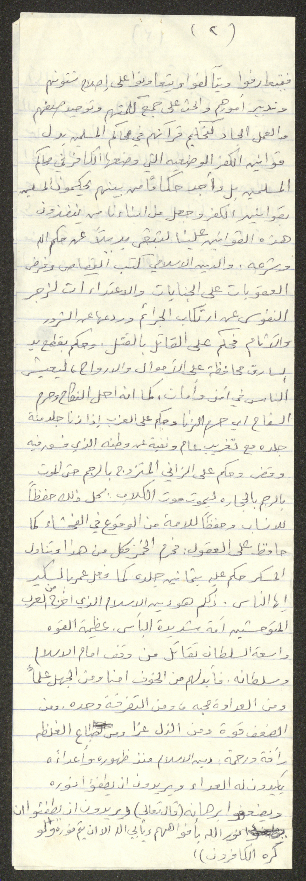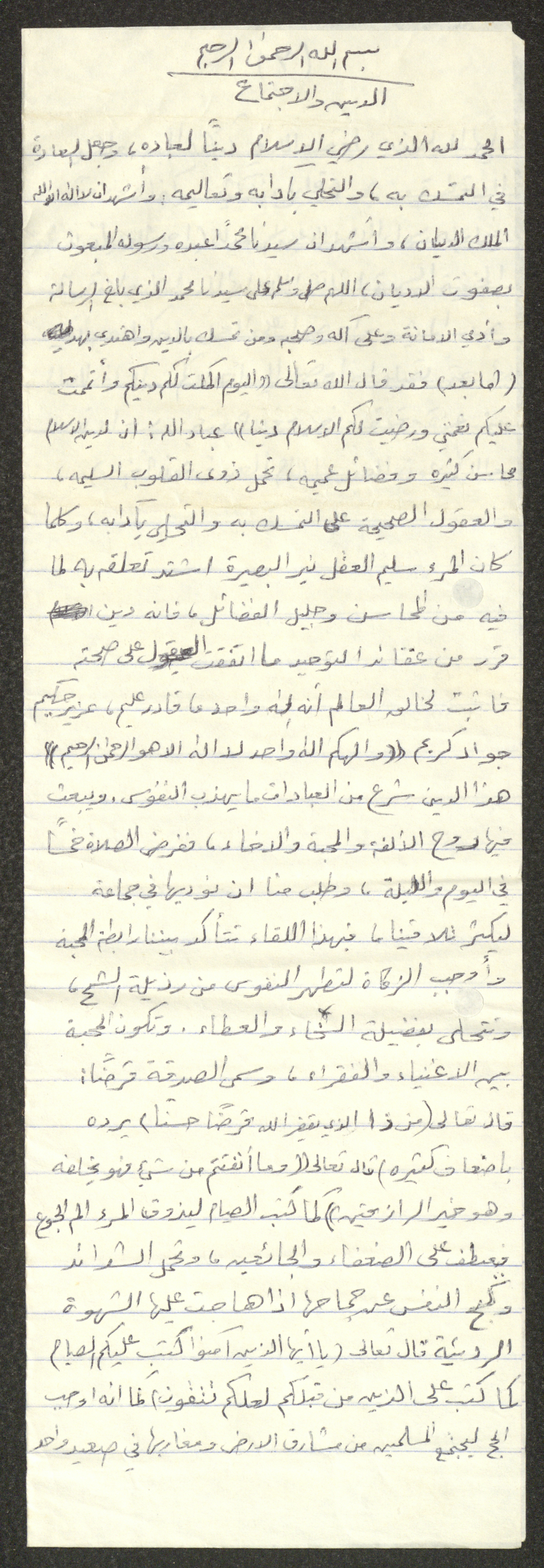 Handwritten, this document shows a Friday Khutbah titled "Religion and Society" given by Imam Marouf Shtayyeh at a mosque in the village of Salem in the 1980s, which he began by praising Allah and mentioning how important strengthening social relations to the Islamic society through zakat, Qard al-Hasan, synthesis between the hearts of rich and poor Muslims and supported his speech with Quran verses and Hadiths.