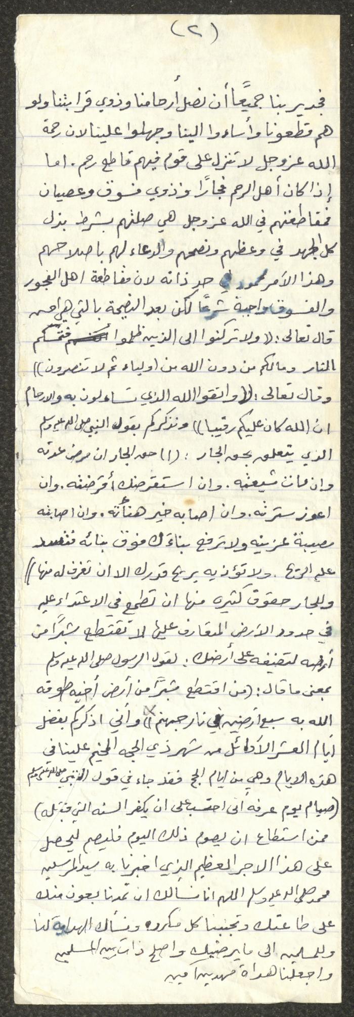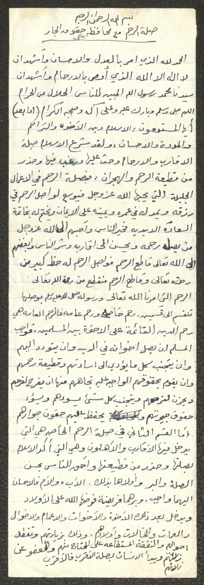 Handwritten, this document shows a Friday Khutbah titled "Affinity and Keeping the Rights of Neighbours" given by Imam Marouf Shtayyeh at a mosque in the village of Salem to the northeast of Nablus in the 1980s, which he began by praising Allah and mentioning the importance of affinity and the reward of those who keep it, then he moved to talk on the significance of maintaining the rights of neighbours and not violating them, as he supported his speech with several Quran verses and Hadiths.