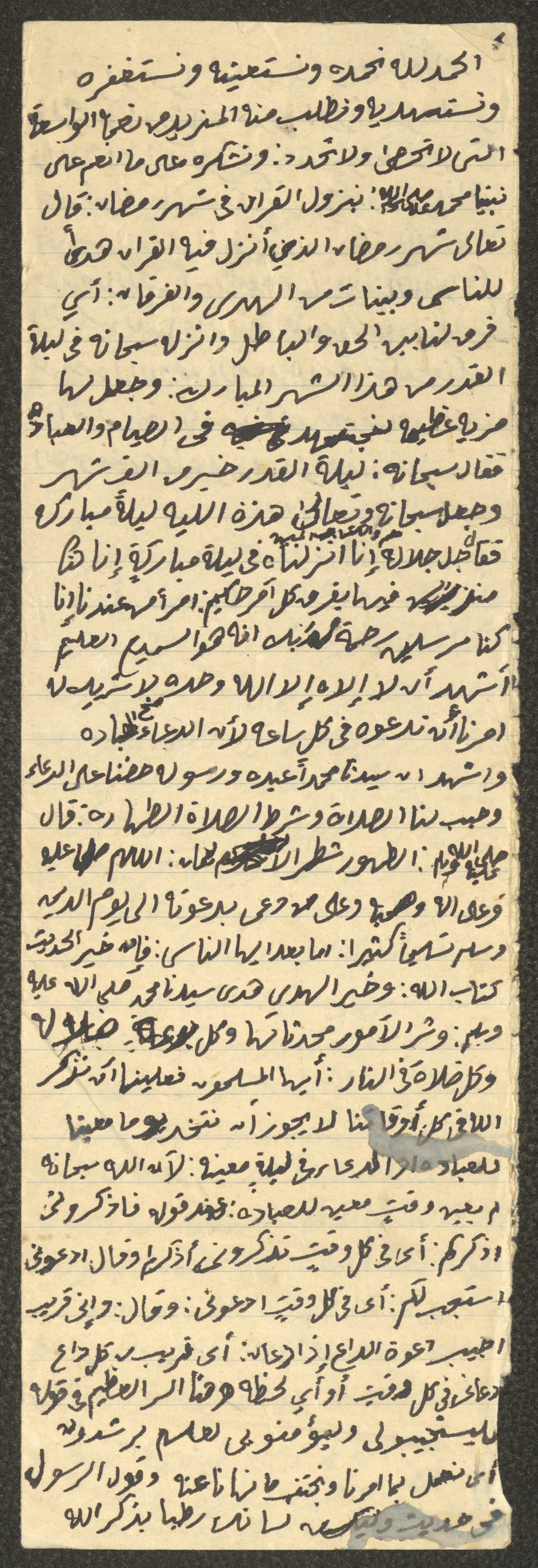 وثيقة مكتوبة بخط اليد تتضمن خطبة يوم الجمعة غير معنونة، ألقاها الإمام معروف اشتية في مسجد في قرية سالم شمال شرق نابلس في سبعينيات القرن العشرين. بدأها بحمد الله وتحدث فيها عن ليلة القدر وأهميتها وفضلها، كما تحدث عن شهر رمضان ومكانته في الإسلام وعند المسلمين، حيث دعم خطبته بعدد من الآيات القرآنية والأحاديث النبوية.