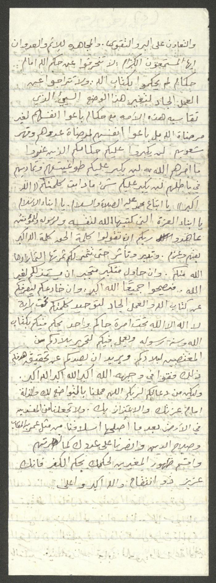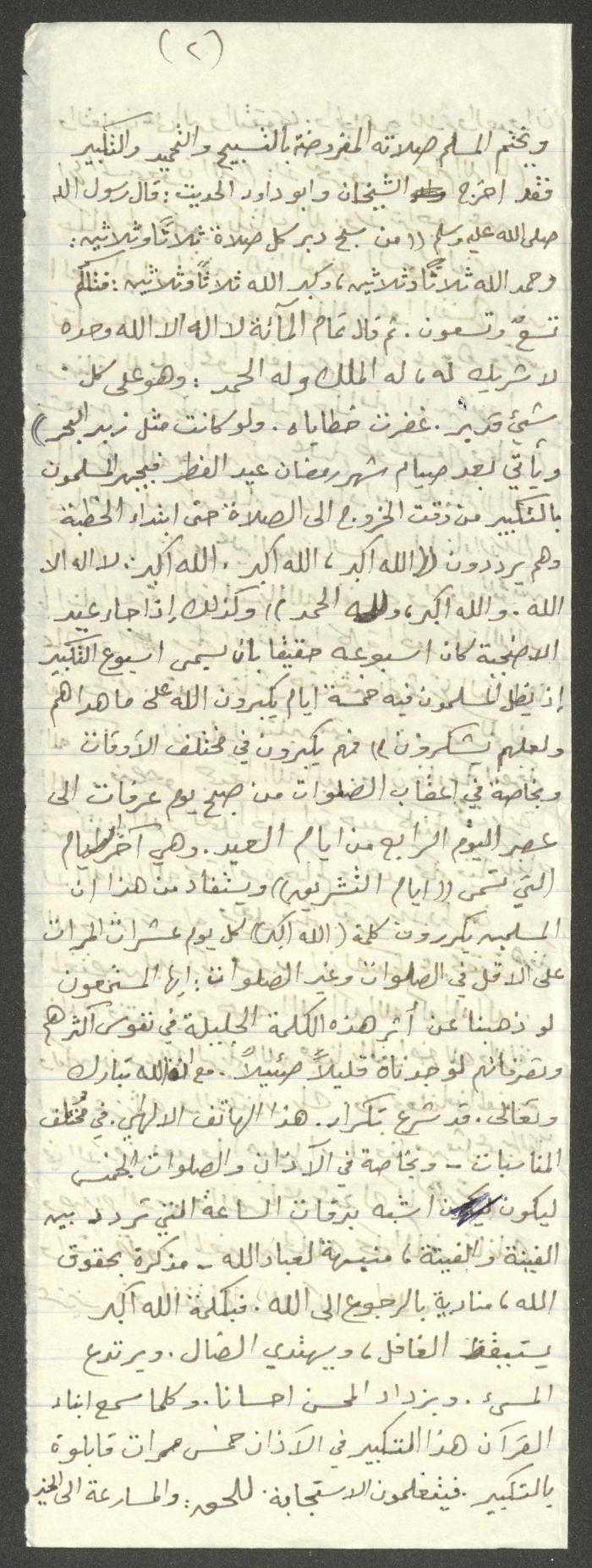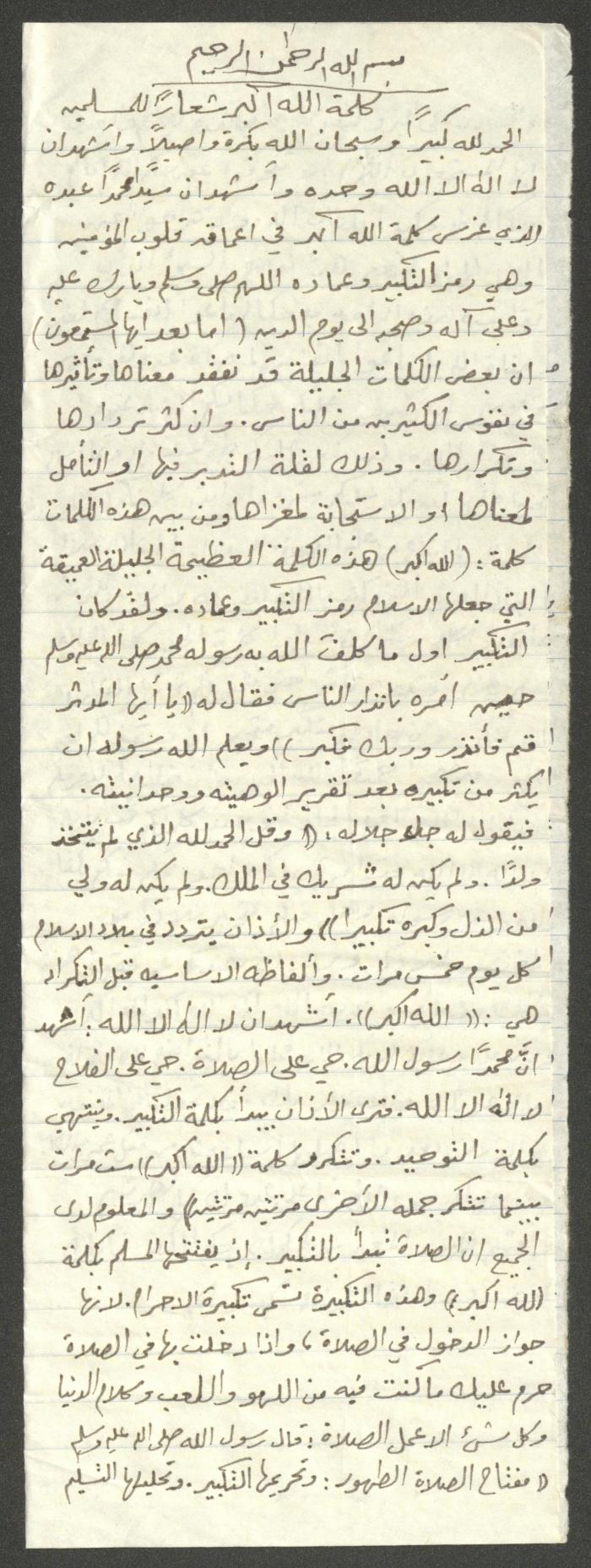 Handwritten, this document shows a Friday Khutbah titled "Takbir is the Banner of Muslims" given by Imam Marouf Shtayyeh at a mosque in the village of Salem to the northeast of Nablus in the 1980s, which he began by praising Allah and mentioned the sentence "Allahu Akbar" (Takbir) wondering it one of the most banners of Islam, then he talked about how it is recited in every prayer, Day of Arafat and Eid Takbirs, as he supported his speech with several Quran verses and Hadiths.