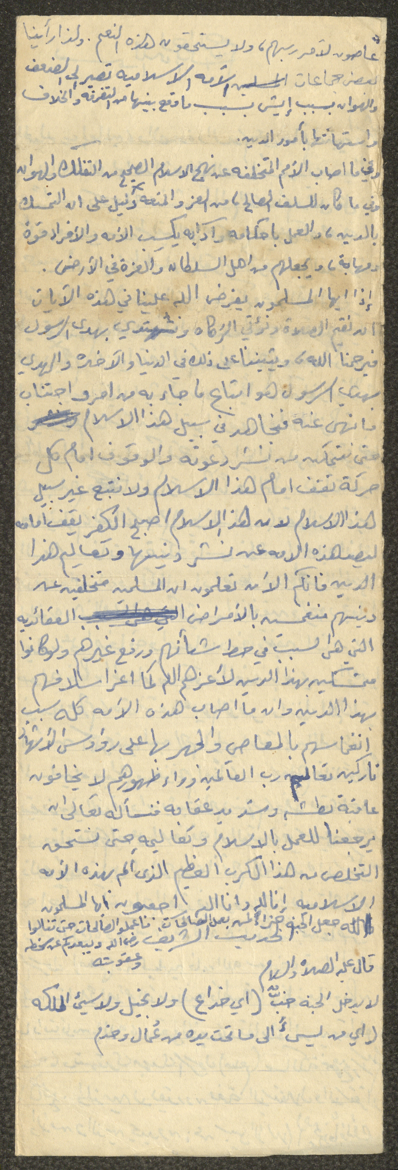 Handwritten, this document shows an untitled Friday Khutbah given by Imam Marouf Shtayyeh at a mosque in the village of Salem to the northeast of Nablus in the 1970s, in which he began by praising Allah and spoke about Allah's promise for the Muslims to replace their fear with safety. In addition to making them successors and rulers of the Earth, supporting his Khutbah with several Quran verses and Hadiths.