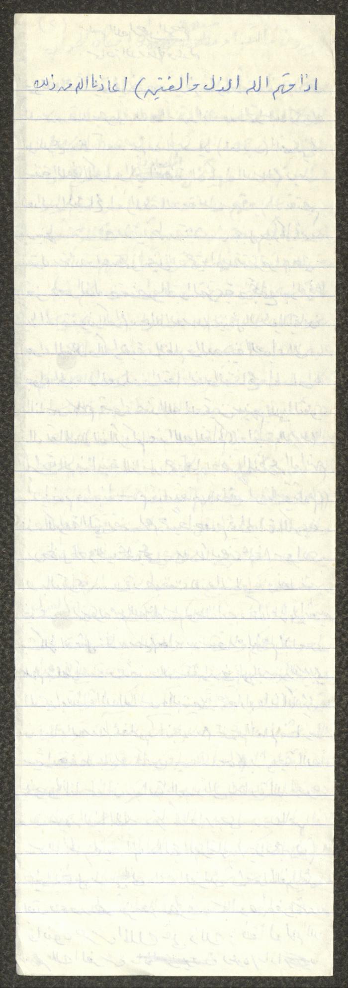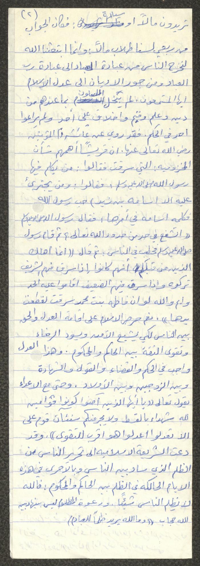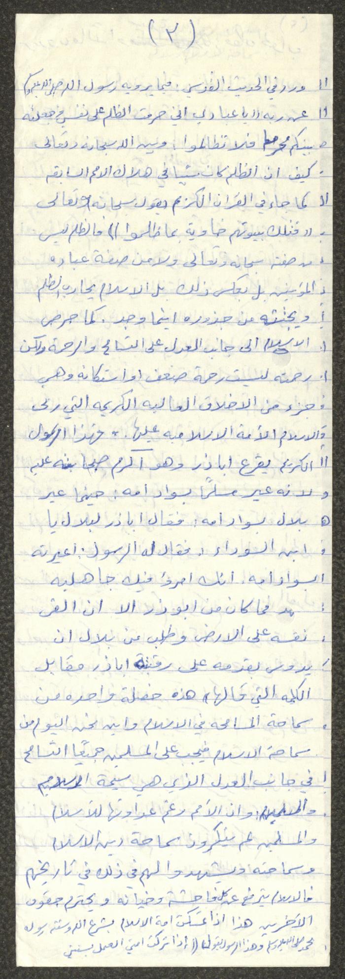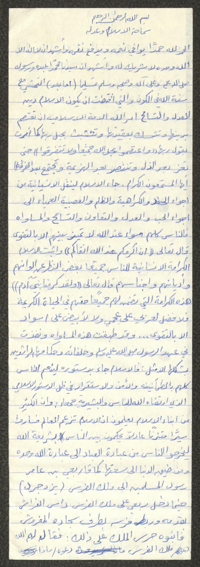 Handwritten, this document shows a Friday Khutbah titled "Islam's Tolerance and Justice" given by Imam Marouf Shtayyeh at a mosque in the village of Salem to the northeast of Nablus in the 1980s, which he began by praising Allah and spoke about the importance of justice and tolerance and the necessity of implementing justice and tolerance, supporting his Khutbah with Hadiths and Quran verses.