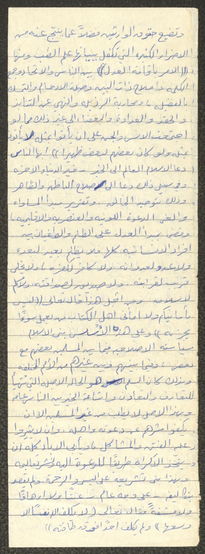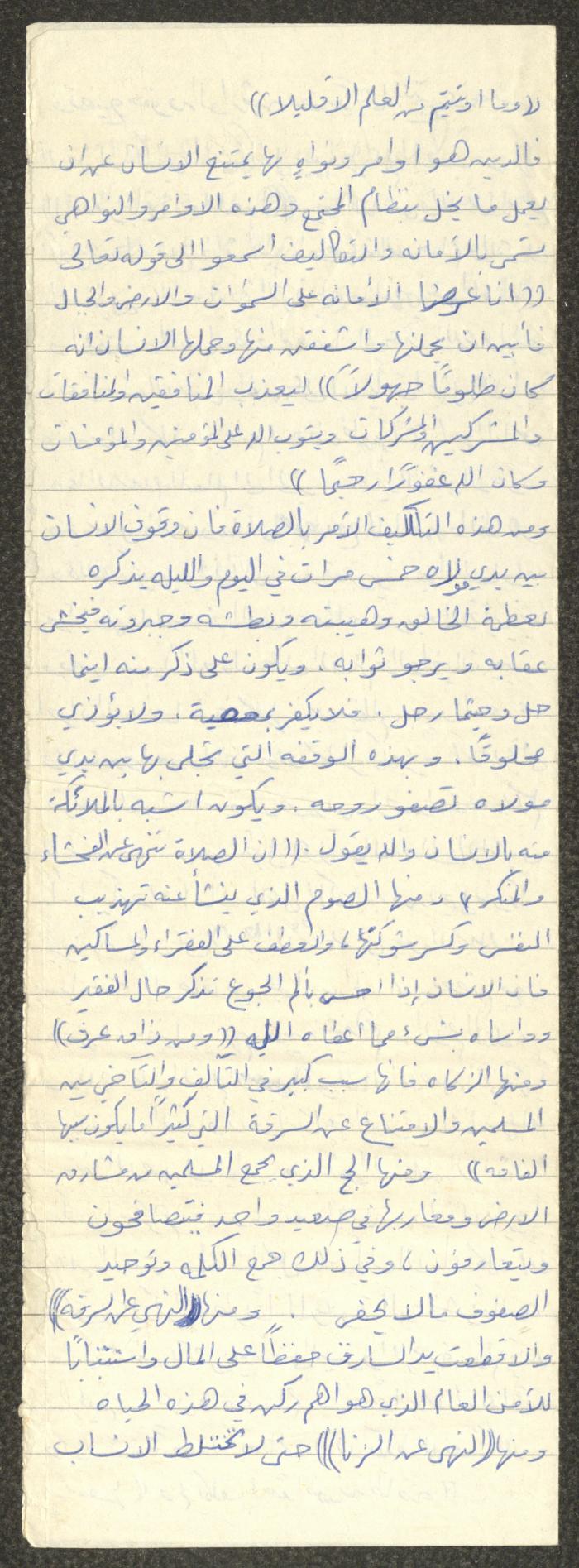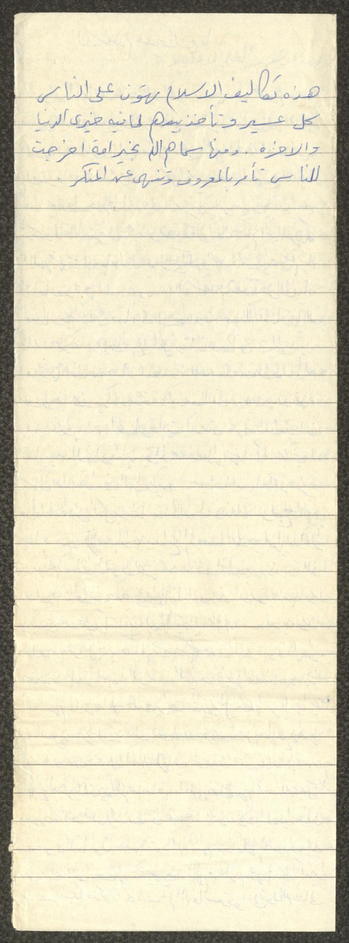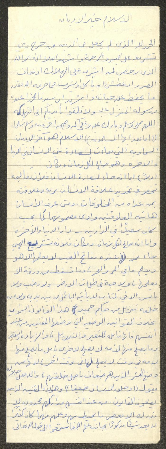 Handwritten, this document shows a Friday Khutbah titled "Islam is the Best of Religions" given by Imam Marouf Shtayyeh at a mosque in the village of Salem to the northeast of Nablus in the 1980s, which he began by praising Allah and spoke about the necessity for humans to worship Allah. He also addressed a number of worships such as fasting, Zakat, prayer etc and mentioned making Dhikr and its benefits for Muslims, supporting his speech with Hadiths and Quran verses.