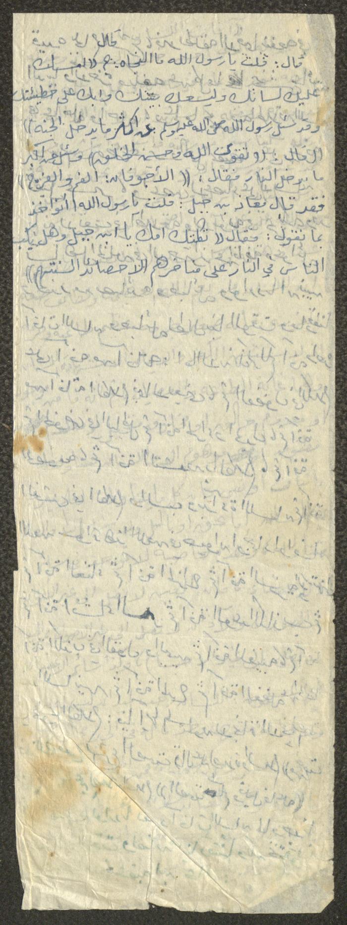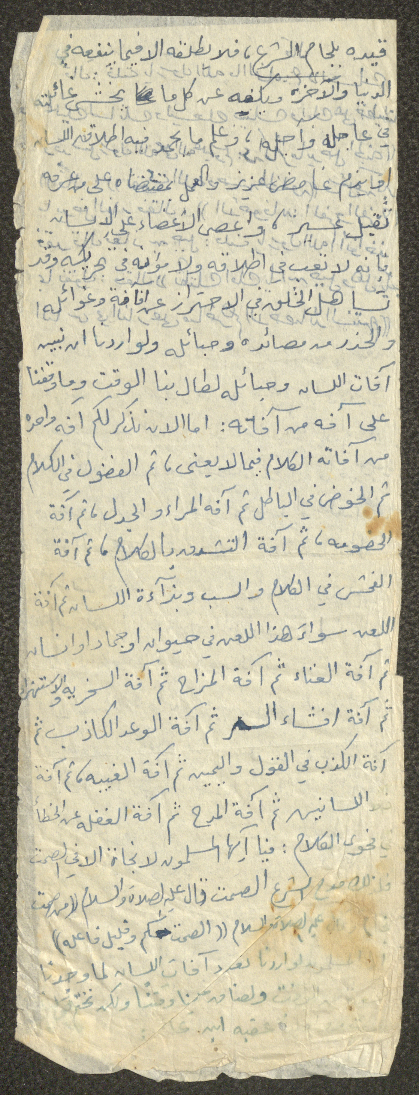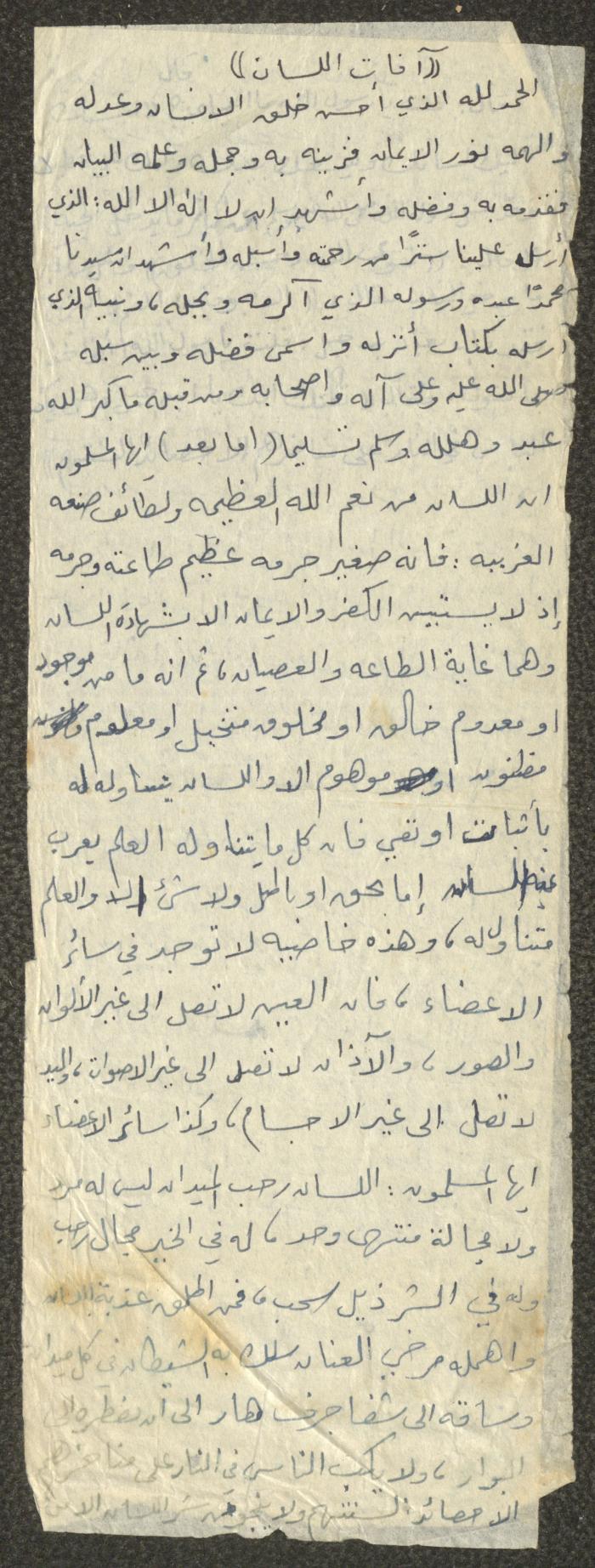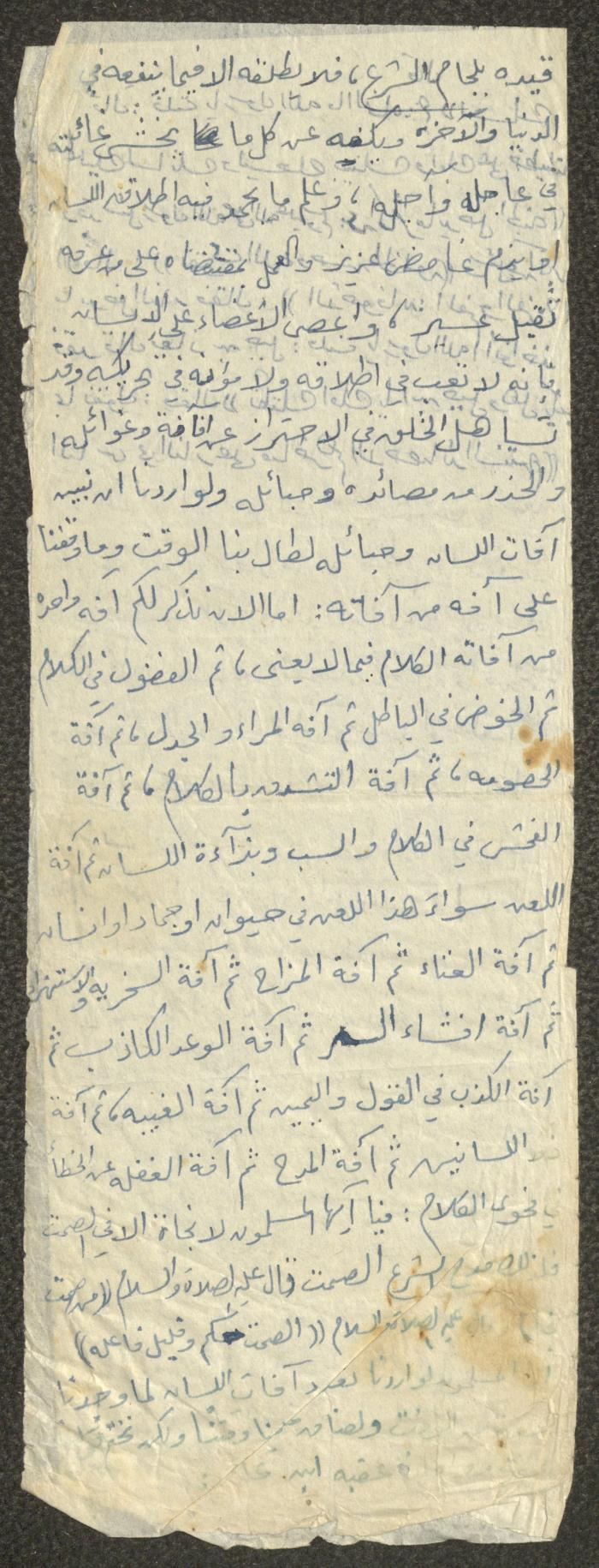 Handwritten, this document shows a Friday Khutbah titled "The Evils of Tongue" given by Imam Marouf Shtayyeh at a mosque in the village of Salem to the northeast of Nablus in the 1970s, which he began by praising Allah and talked about the importance of using tongue in everything that brings people closer to Allah and keeps them away from sins, supporting his Khutbah with several Quran verses and Hadiths.