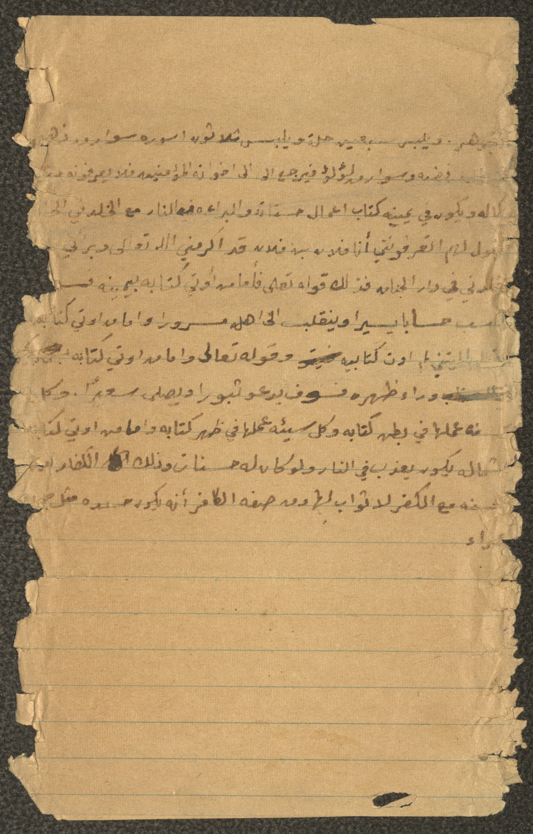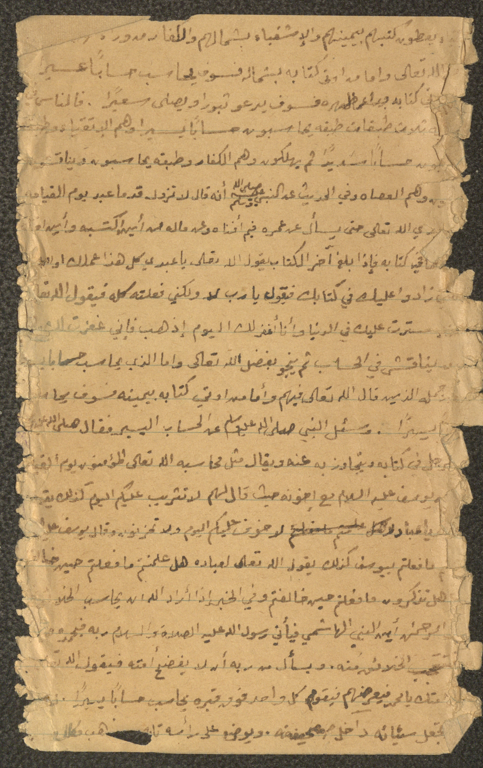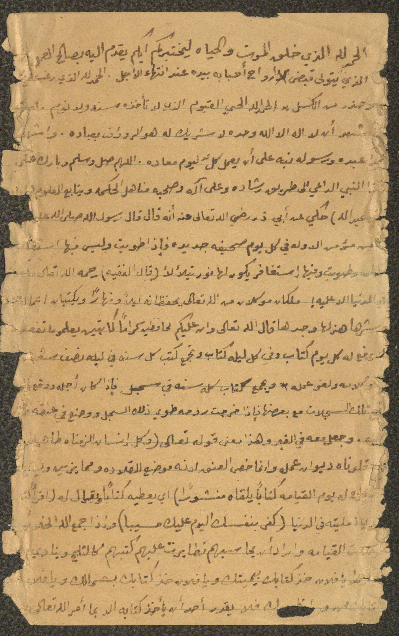 Handwritten, this document shows an untitled Friday Khutbah given by Imam Marouf Shtayyeh at a mosque in the village of Salem to the northeast of Nablus in the 1960s, in which he began by praising Allah and spoke about Allah's reckoning of humans and how their actions are recorded, supporting his Khutbah with Hadiths and Quran verses.
