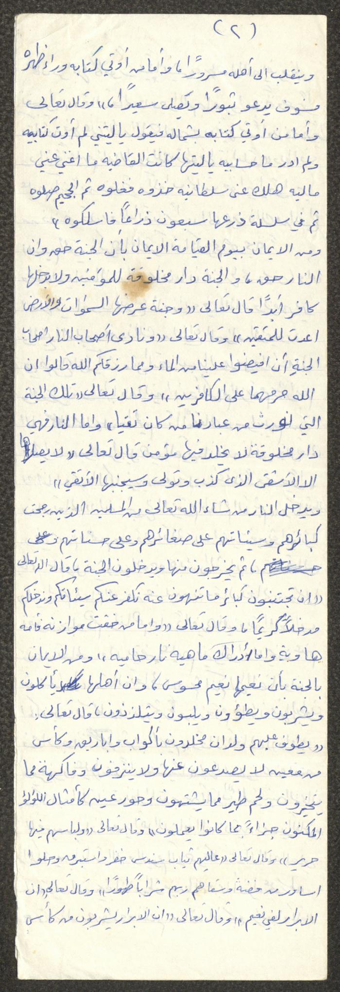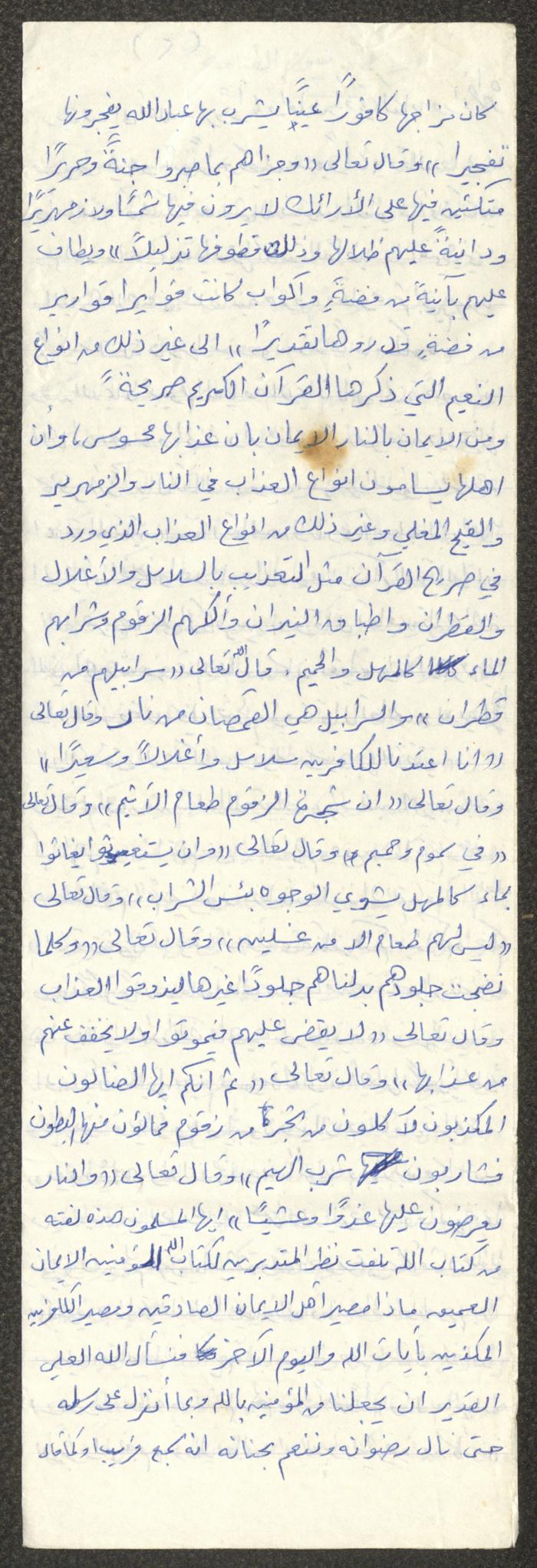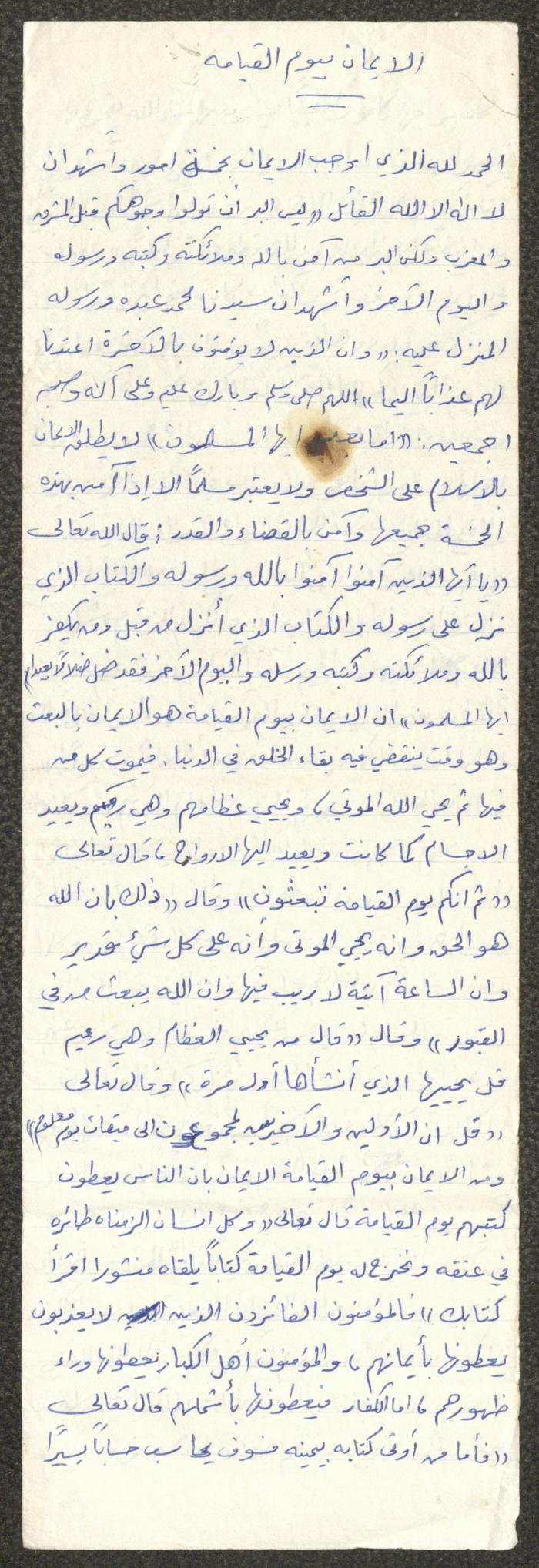 وثيقة مكتوبة بخط اليد تتضمن خطبة يوم الجمعة بعنوان "الإيمان بيوم القيامة"، ألقاها الإمام معروف اشتية في مسجد في قرية سالم شمال شرق نابلس في تسعينيات القرن العشرين. بدأها بحمد الله ثم تحدث عن أركان الإيمان، وتطرق بشكل مفصل لأهمية الإيمان بيوم القيامة، مدعمًا خطبته بعدد من الآيات القرآنية والأحاديث النبوية.