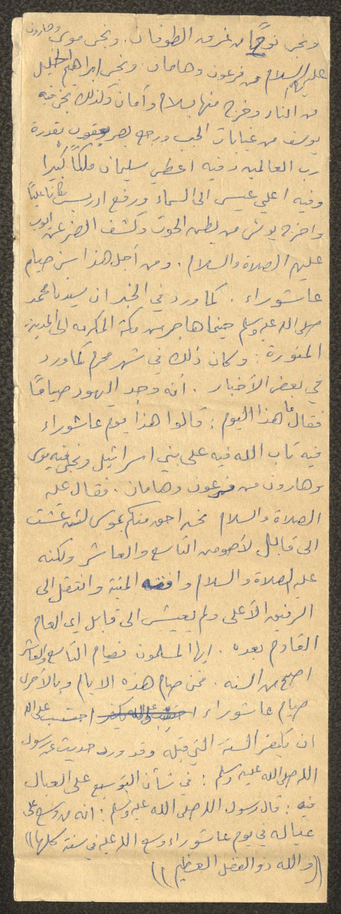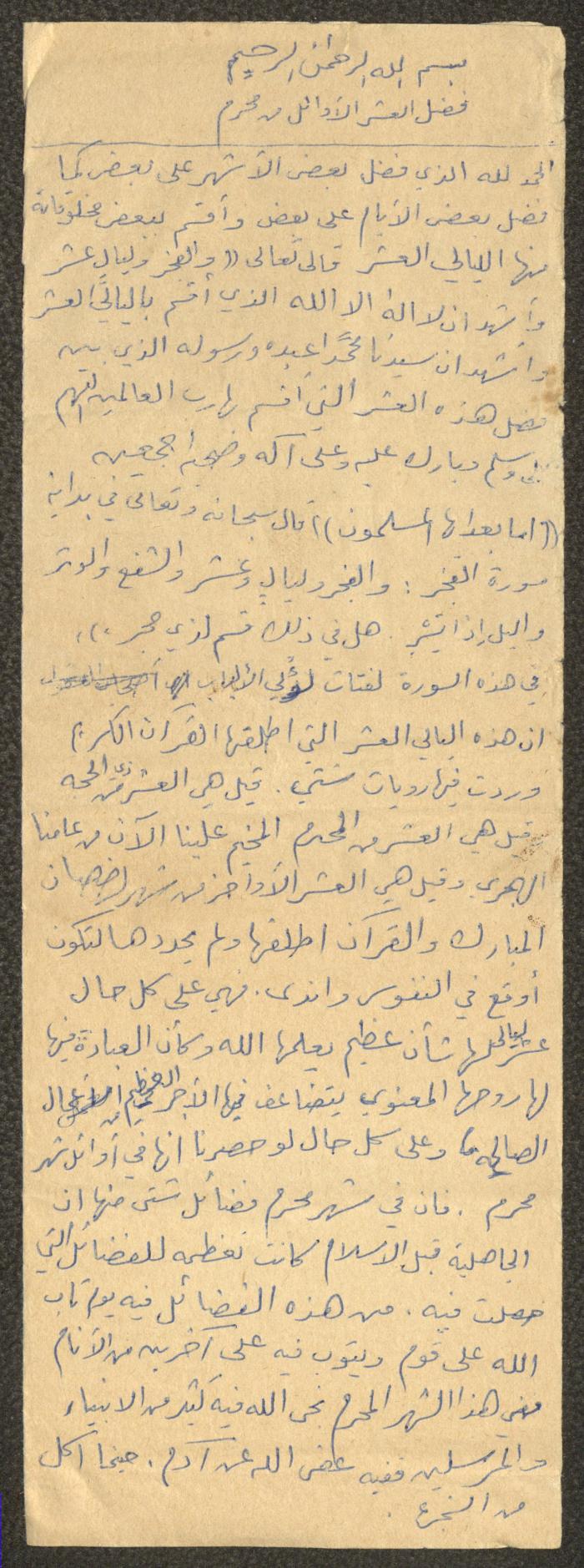 وثيقة مكتوبة بخط اليد تتضمن خطبة يوم الجمعة بعنوان "فضل العشر الأوائل من محرَّم"، ألقاها الإمام معروف اشتية في مسجد في قرية سالم شمال شرق نابلس في سبعينيات القرن العشرين. بدأها بحمد الله وتحدث فيها عن أهمية ومكانة أول عشرة أيام من شهر محرم في الإسلام، مدعمًا خطبته بعدد من الآيات القرآنية والأحاديث النبوية.