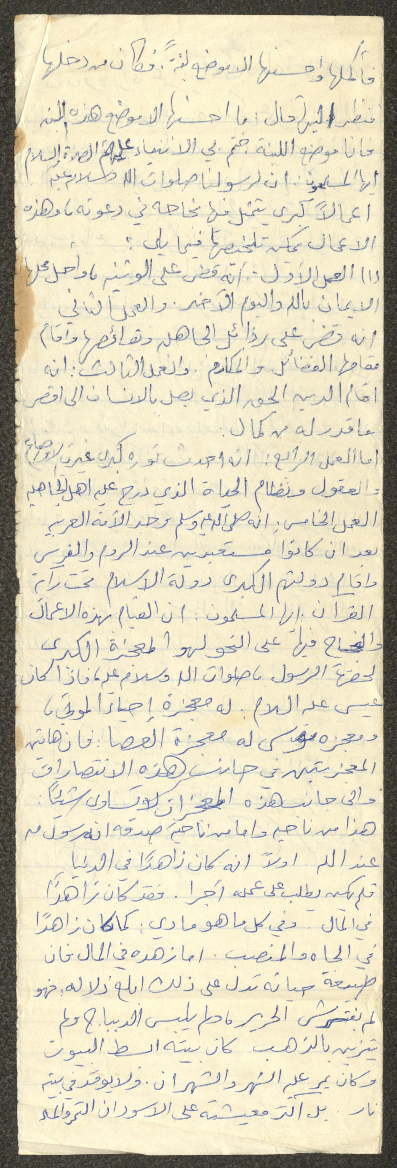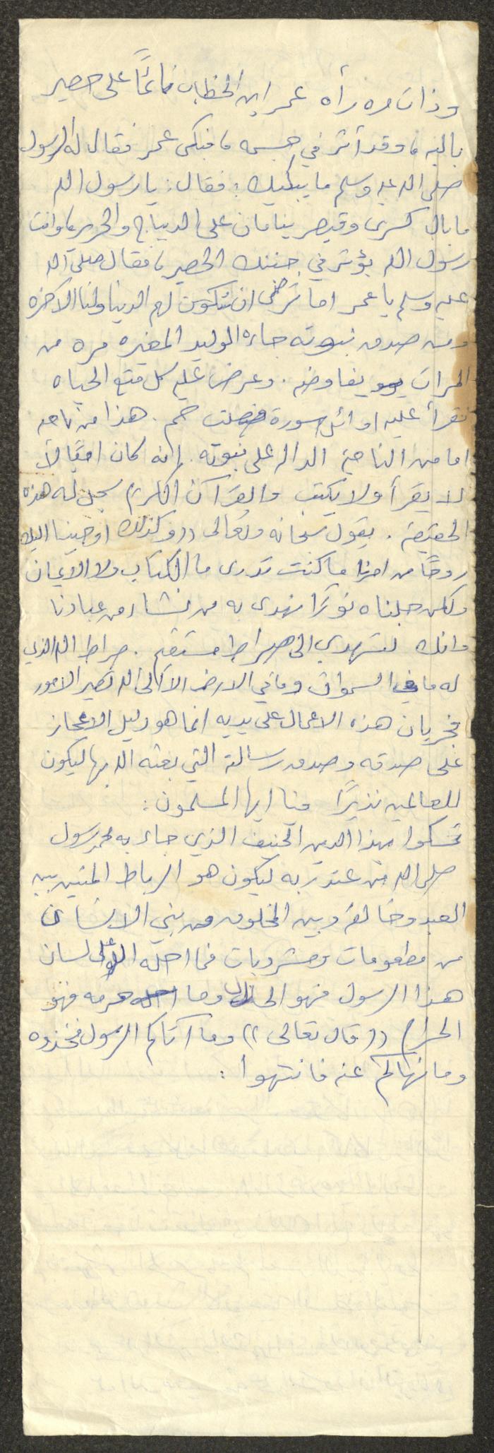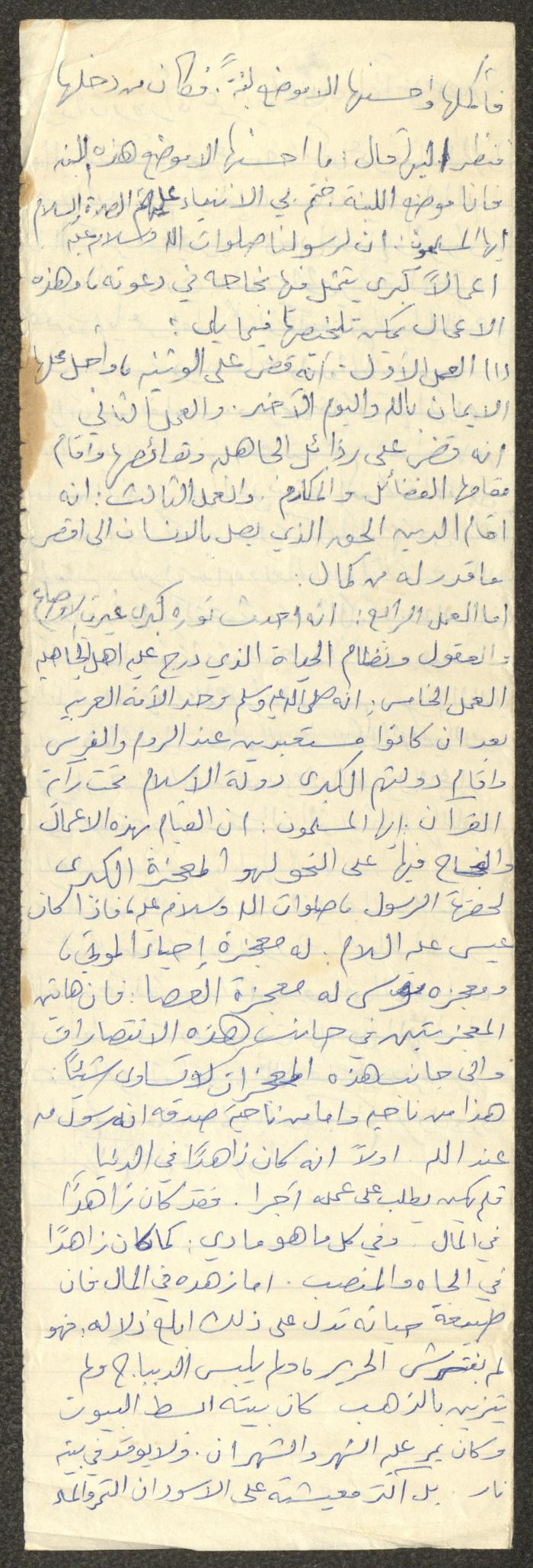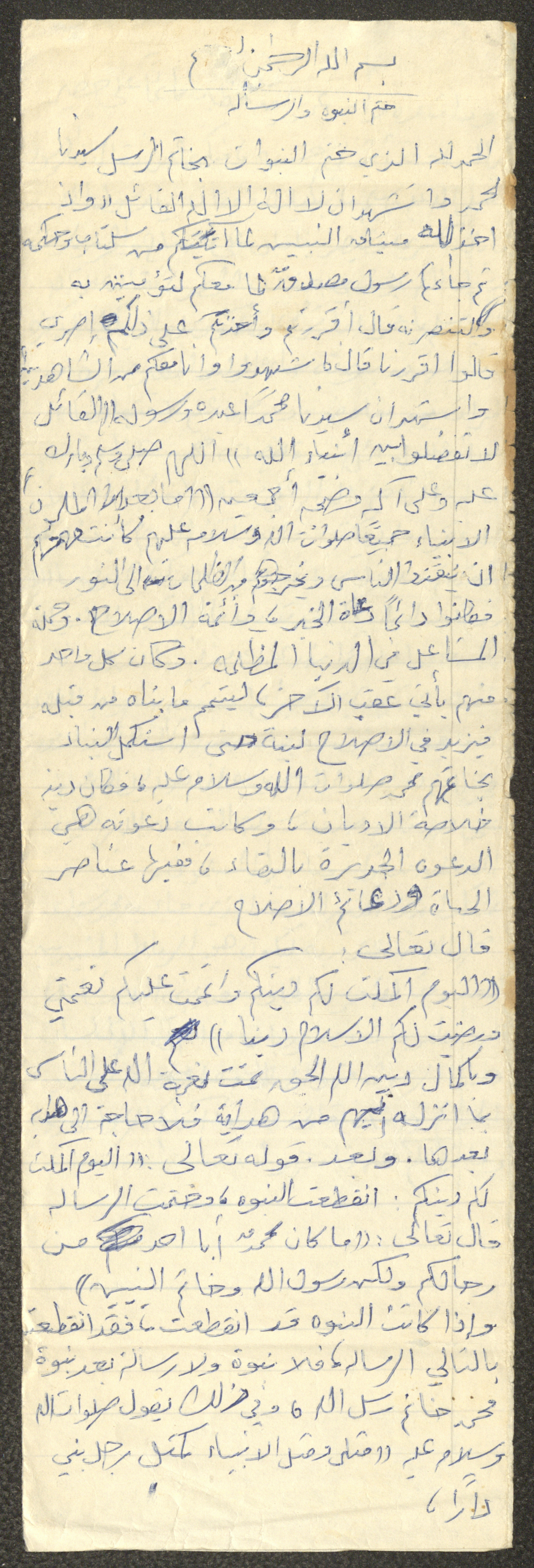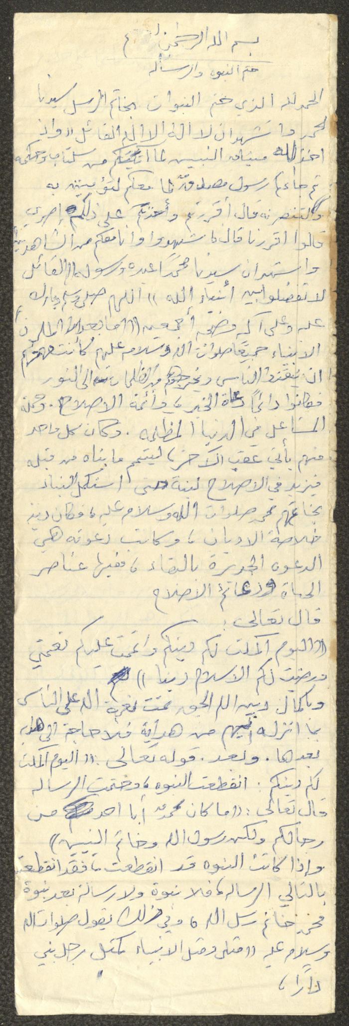 وثيقة مكتوبة بخط اليد تتضمن خطبة يوم الجمعة بعنوان "خاتم النبوة والرسل"، ألقاها الإمام معروف اشتية في مسجد في قرية سالم شمال شرق نابلس في سبعينيات القرن العشرين. بدأها بحمد الله وتحدث فيها عن رسالة النبي محمد، مشيرًا إلى أن الدين الإسلامي هو آخر الرسالات السماوية وأن النبي محمد آخر الرسل، ومدعمًا خطبته بعدد من الآيات القرآنية والأحاديث النبوية.