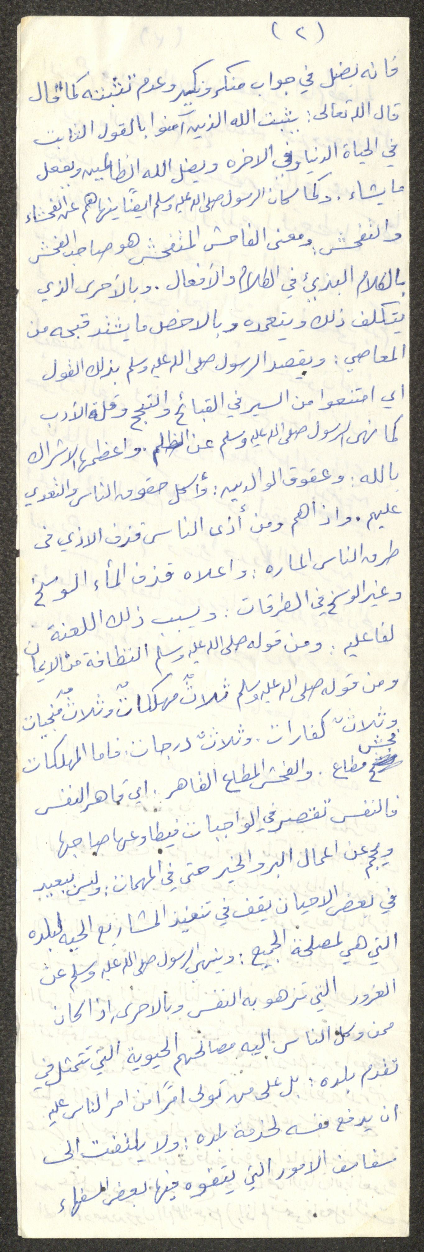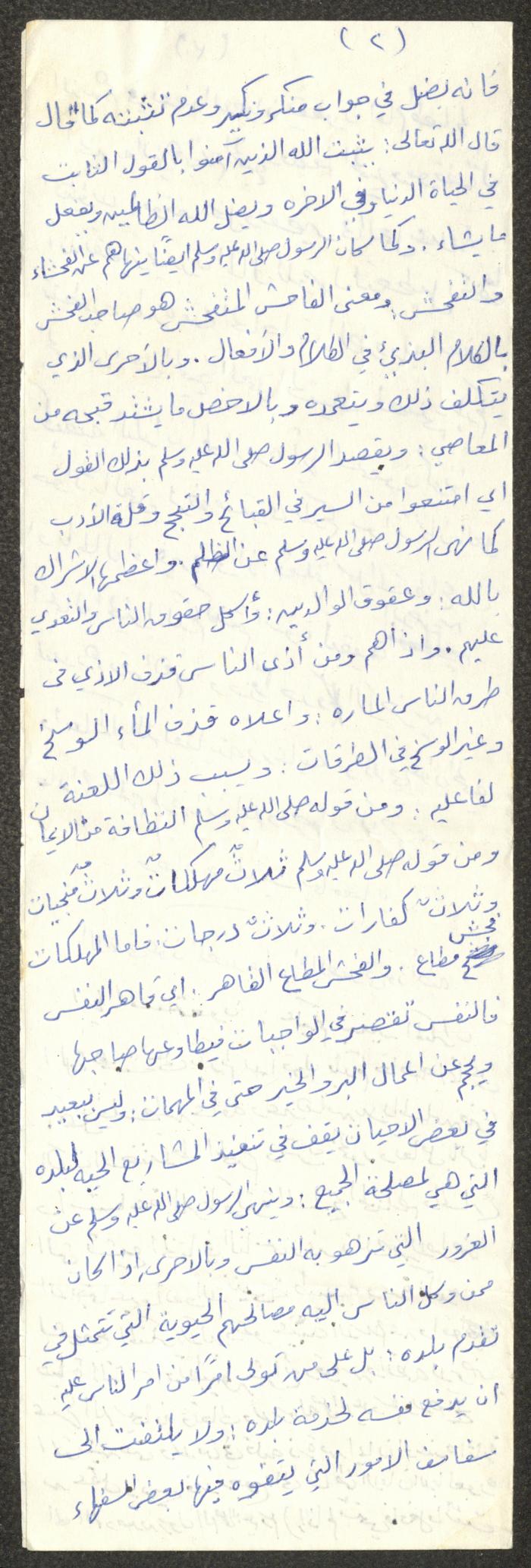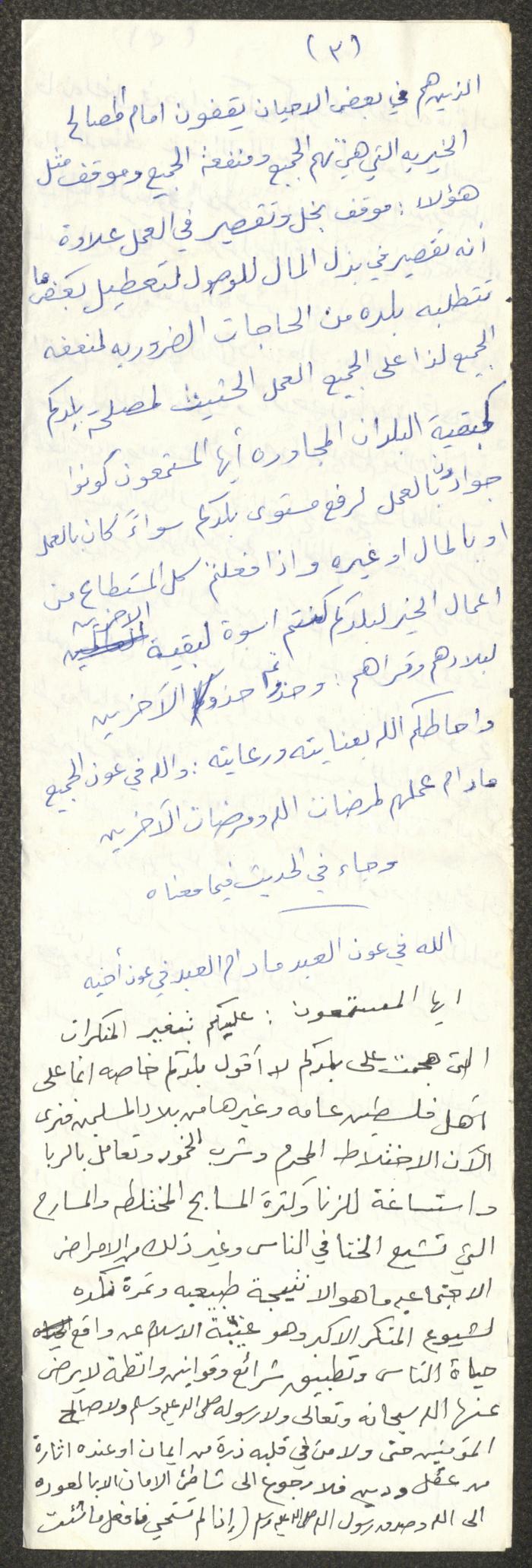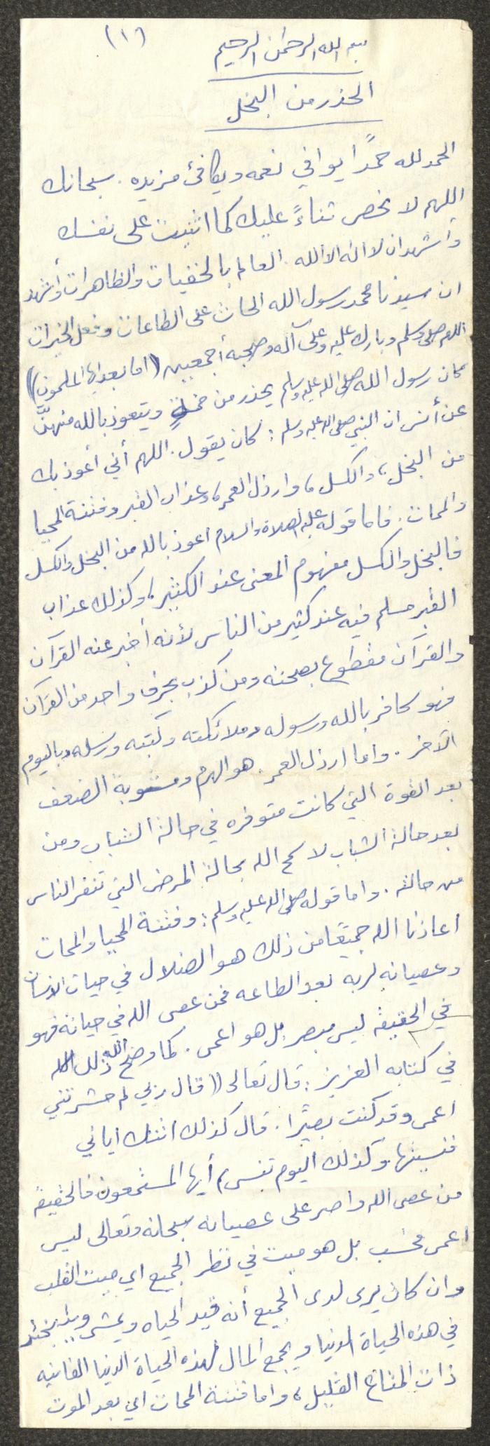 Handwritten, this document shows a Friday Khutbah titled "Awareness Against Avarice" given by Imam Marouf Shtayyeh at a mosque in the village of Salem to the northeast of Nablus in the 1980s, which he began by praising Allah and mentioned avarice and its evils, he also advised against it and supported his speech with several Quran verses and Hadiths.