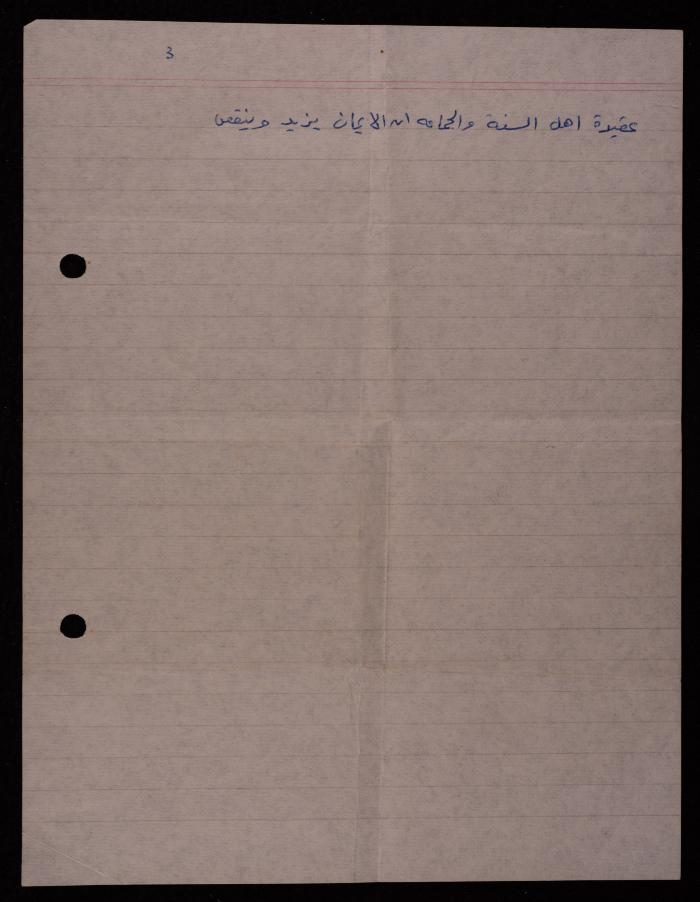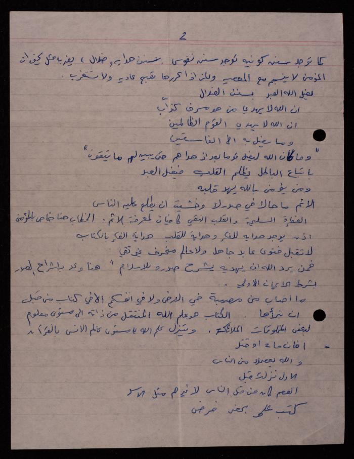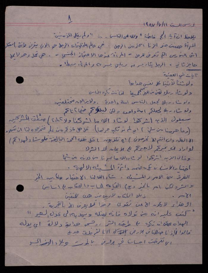 Issued on 11 July 1987, this document shows notes handwritten by Sameeh Hammoudeh under the title "Lessons of Sheikh Bassam Jarrar", which contain a summary of the lesson delivered on the same day, Saturday, lessons in Islamic religion, and interpretation of verses from the Holy Quran.