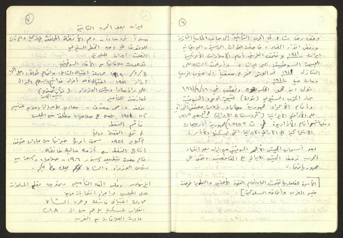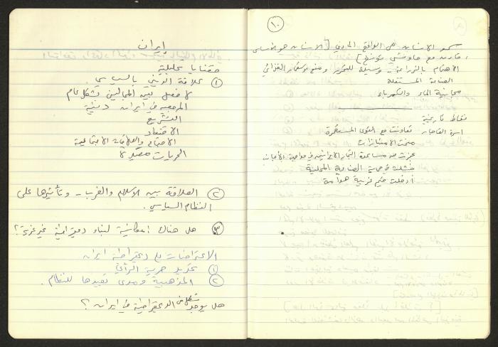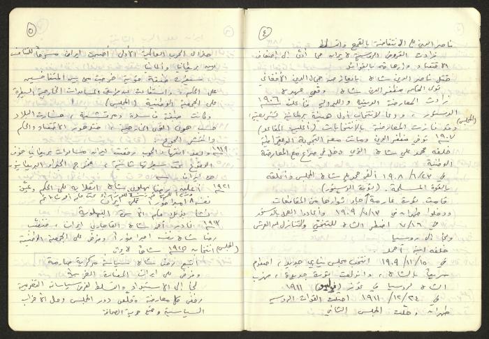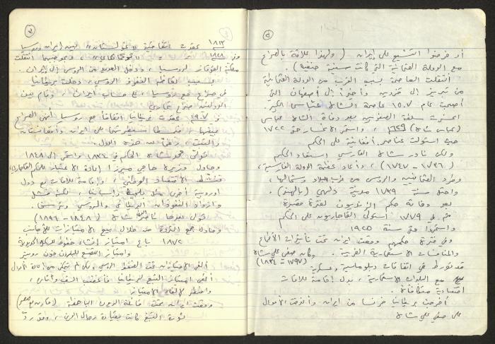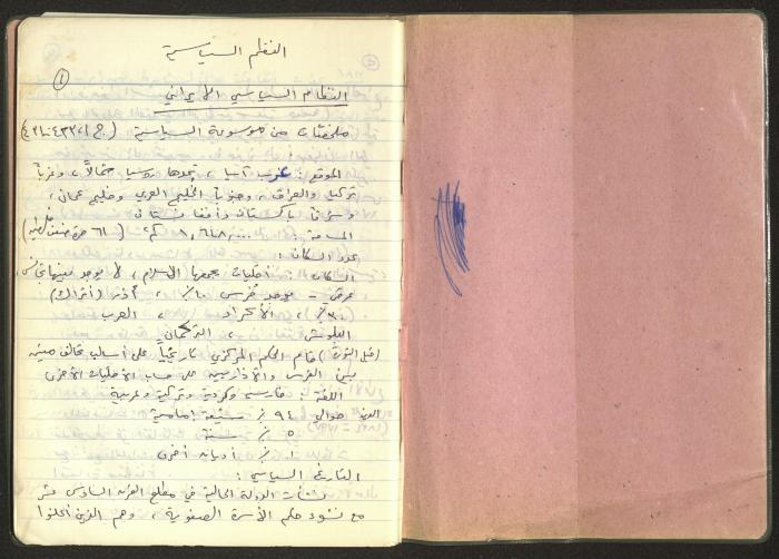 Handwritten by Sameeh Hammoudeh, this document shows a notebook that includes summaries of the political encyclopedia titled "Political Systems" regarding the Iranian political system, the stages of its development, the impacts of World War 1 and World War 2, Khomeini and the new political system.