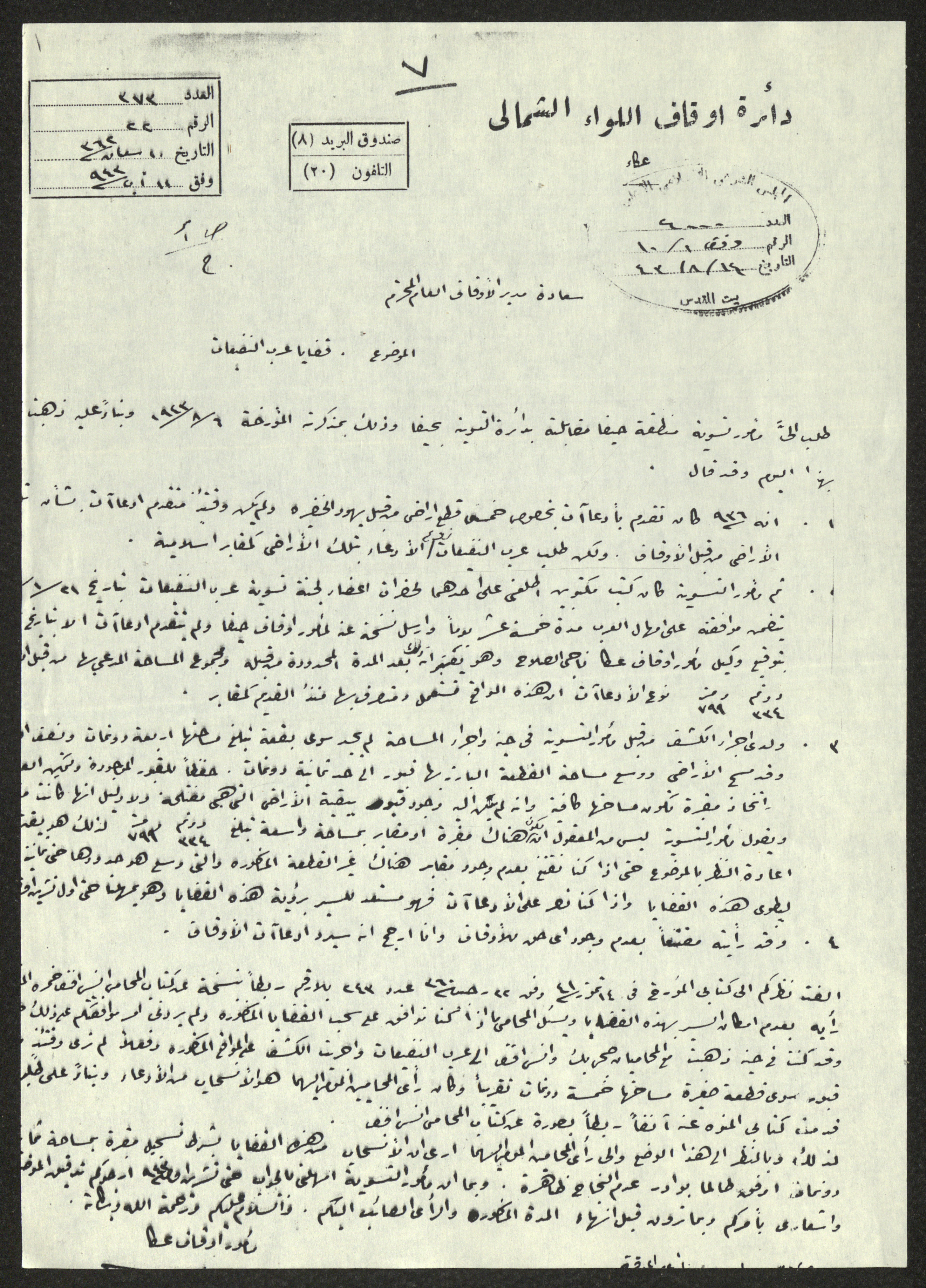 نسخة عن رسالة مرسلة من مأمور أوقاف اللواء الشمالي في عكا إلى مدير الأوقاف العام، ومرسلة بتاريخ 11 آب 1943، وموضوعها قضية عرب النفيعات قضاء حيفا. وختم المجلس الإسلامي الأعلى عليها بتاريخ 14 آب 1943.
