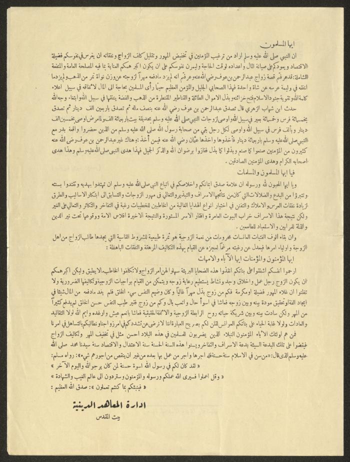"آداب الإسلام في الاعتدال في مهور الزوجات والاقتصاد في النفقات"، منشور صادر عن إدارة المعاهد الدينية، القدس
