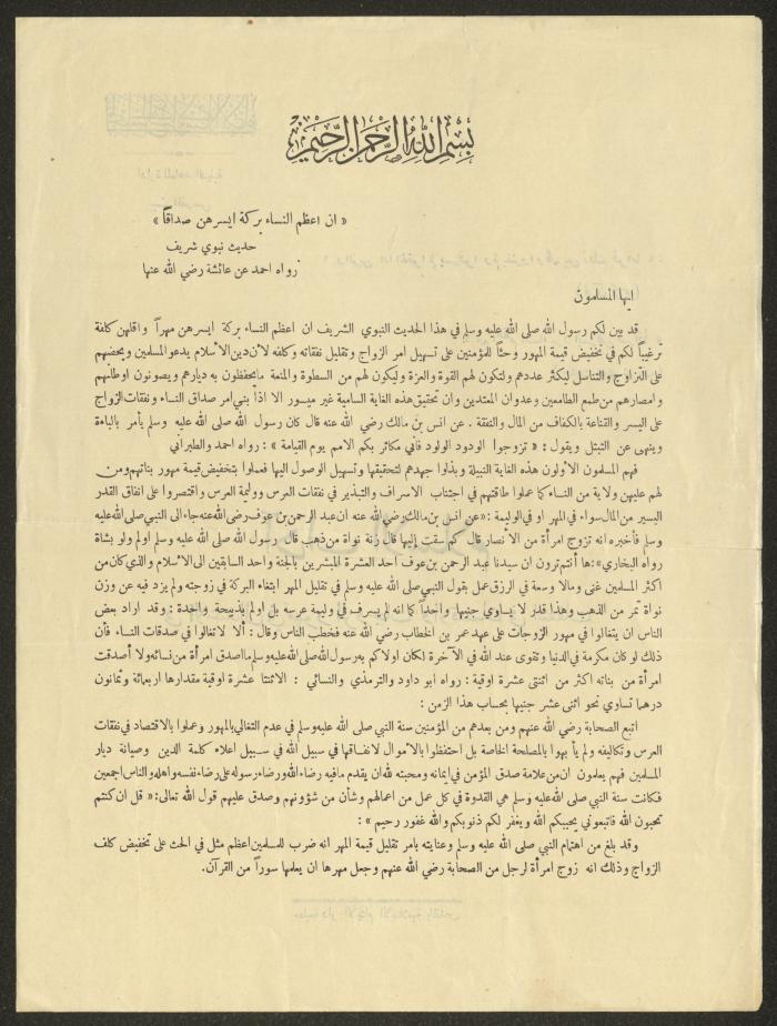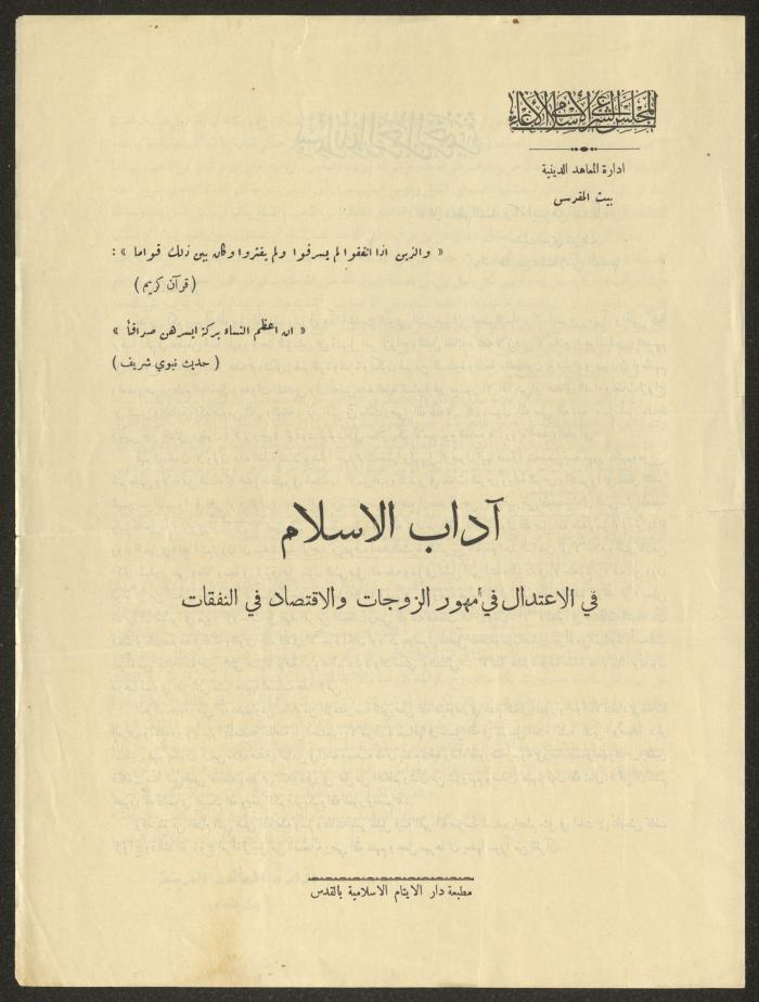 منشور صادر عن إدارة المعاهد الدينية في القدس، التابعة للمجلس الشرعي الإسلامي الأعلى، بعنوان "آداب الإسلام في الاعتدال في مهور الزوجات والاقتصاد في النفقات"، طبع في دار الأيتام الإسلامية في القدس.