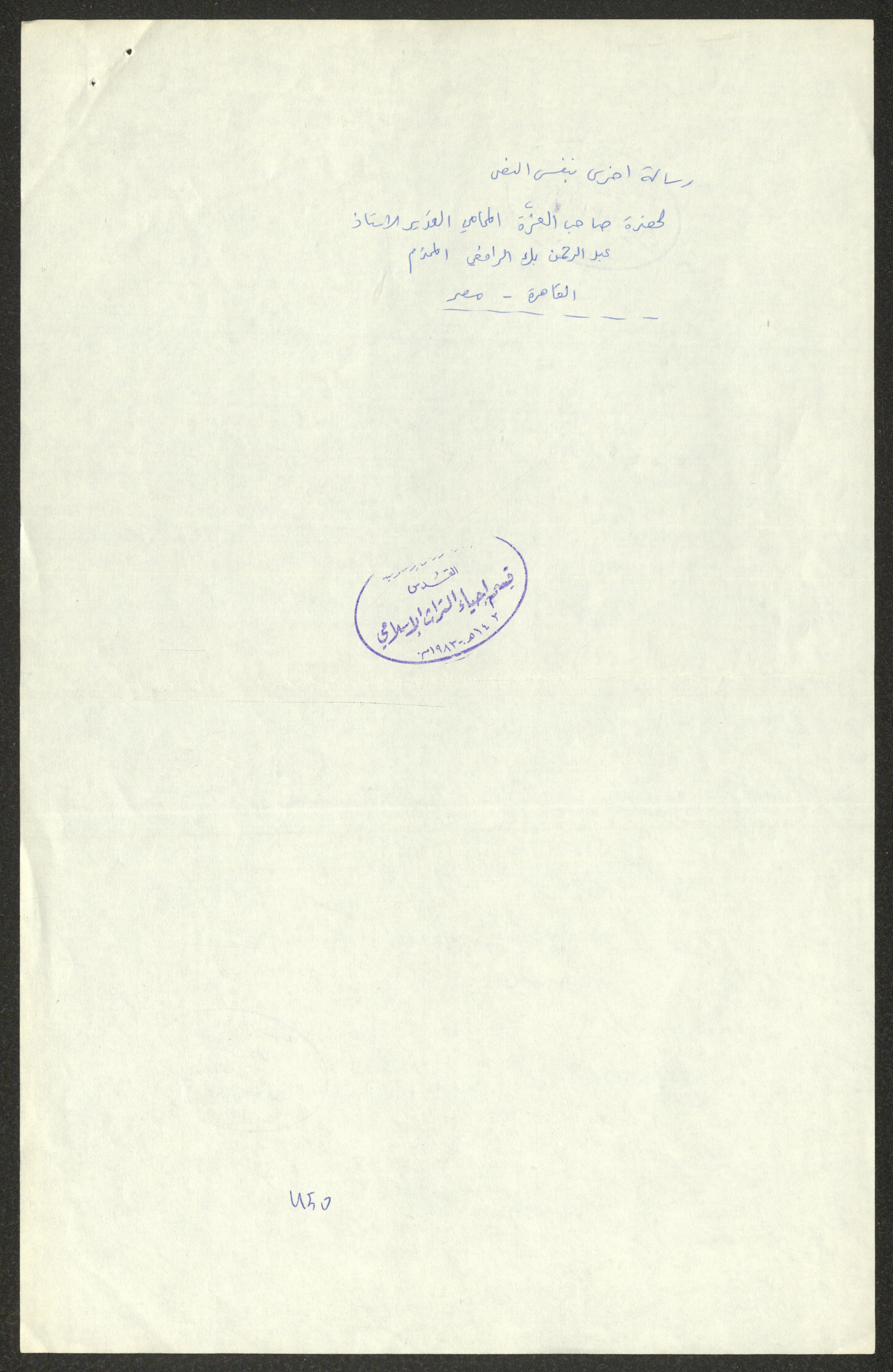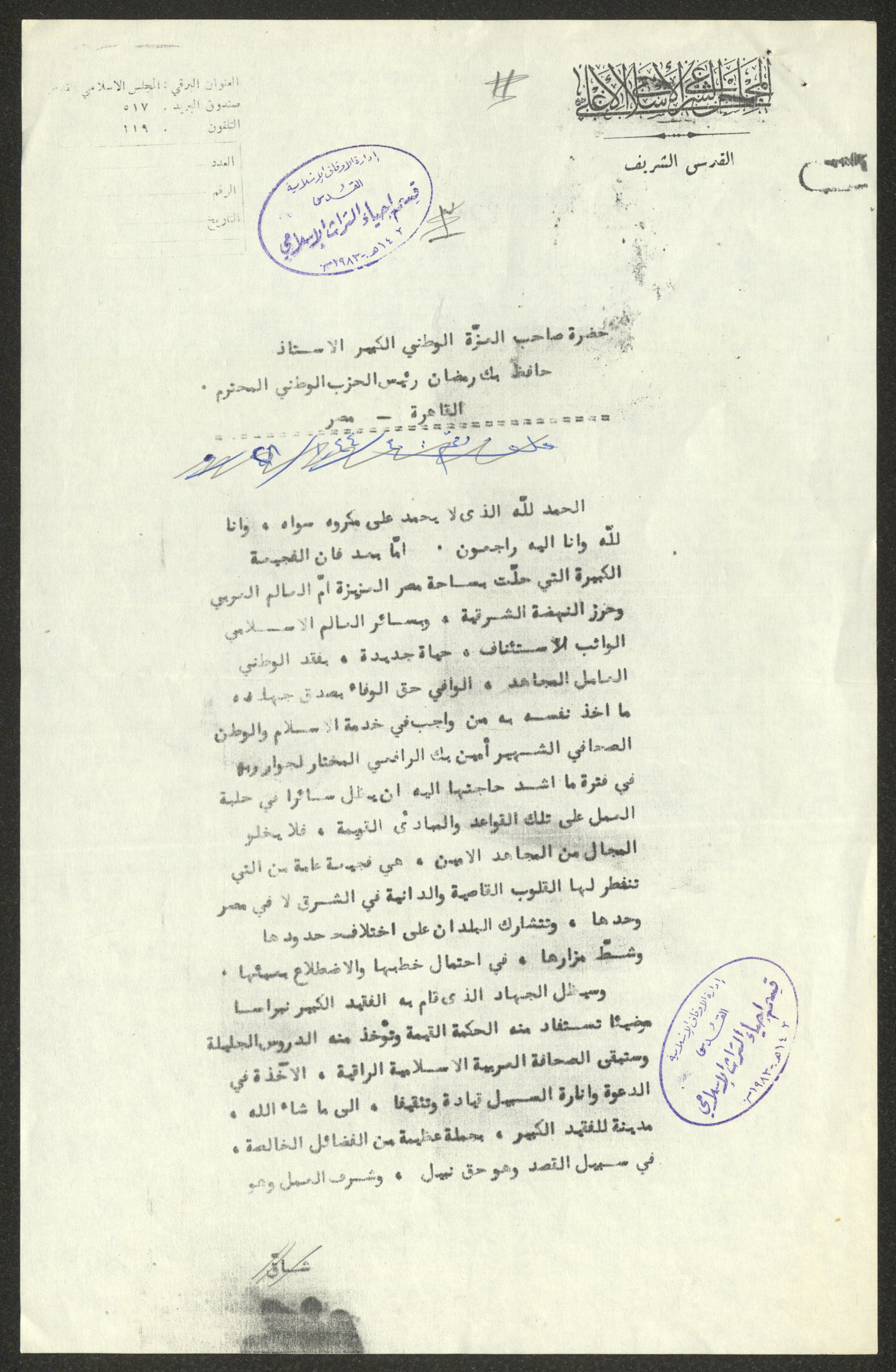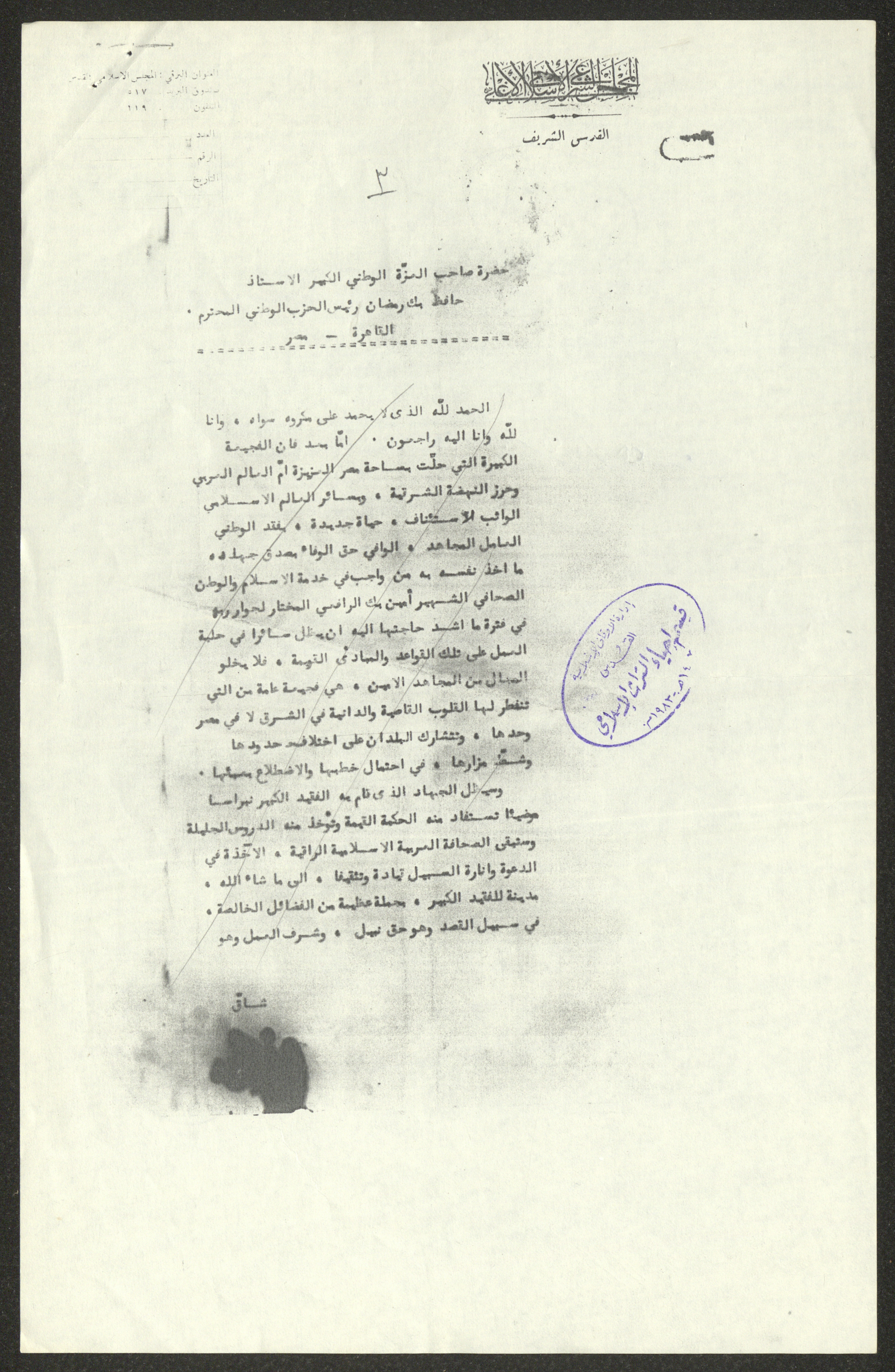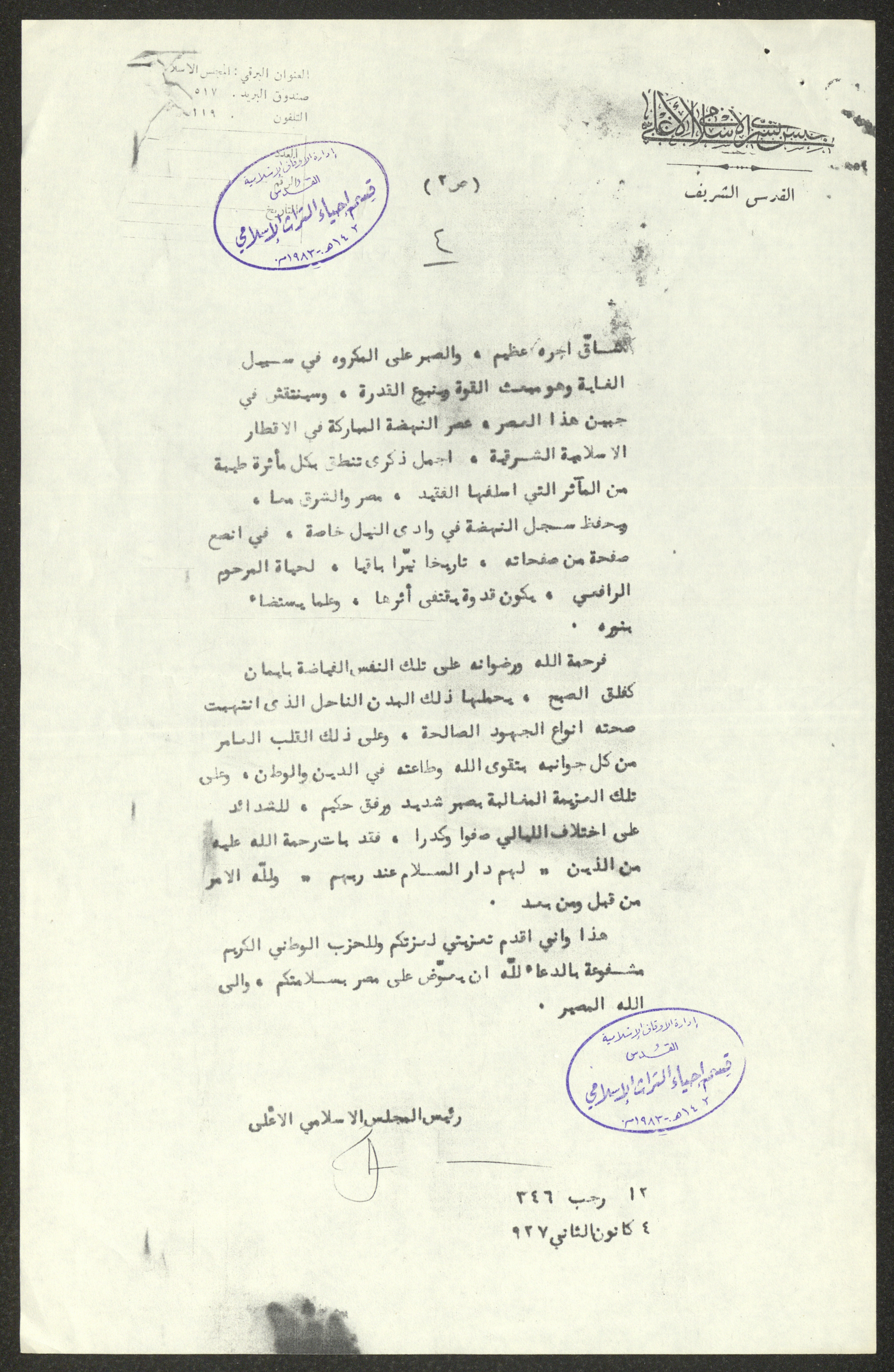 رسالة تعزية من رئيس المجلس الإسلامي الأعلى إلى حافظ رمضان، رئيس الحزب الوطني المصري، بتاريخ 4 كانون الثاني 1927.