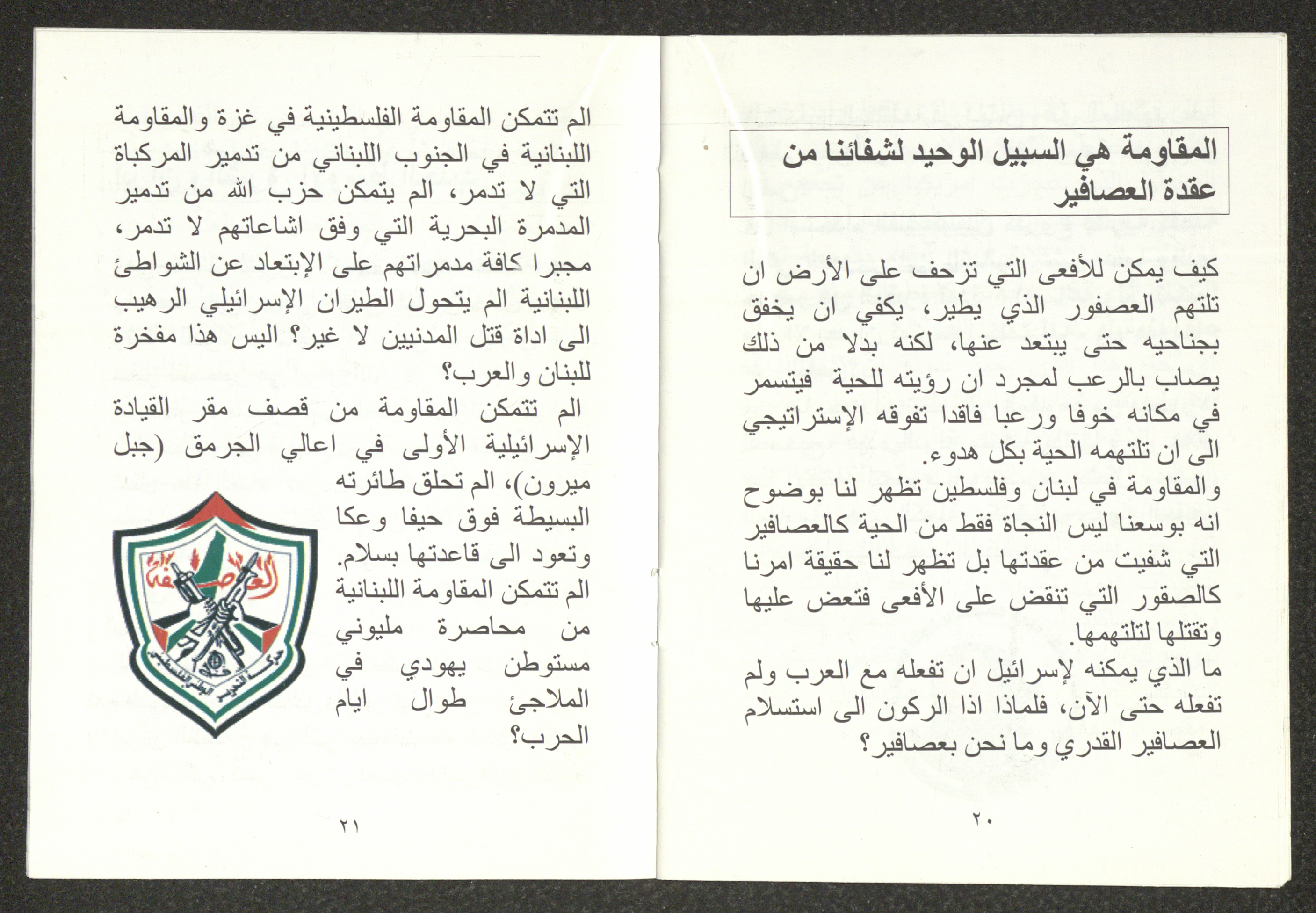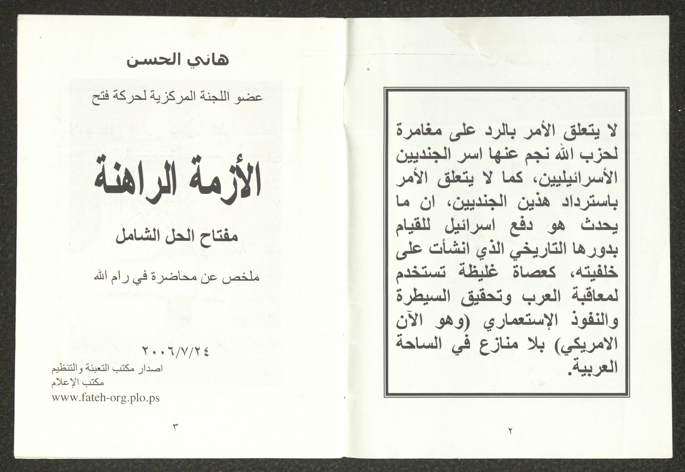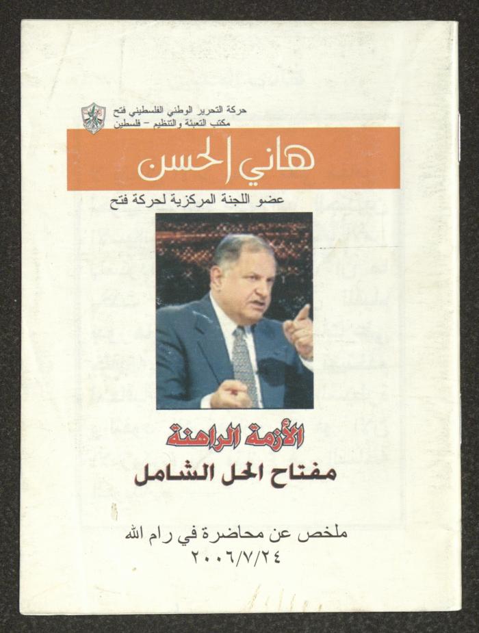 كتيب صادر عن مكتب التعبئة والتنظيم لحركة التحرير الوطني الفلسطيني- فتح، وهو ملخص لمحاضرة ألقاها هاني الحسن عضو اللجنة المركزية للحركة، بعنوان "الأزمة الراهنة"، بتاريخ 24 تموز 2006.