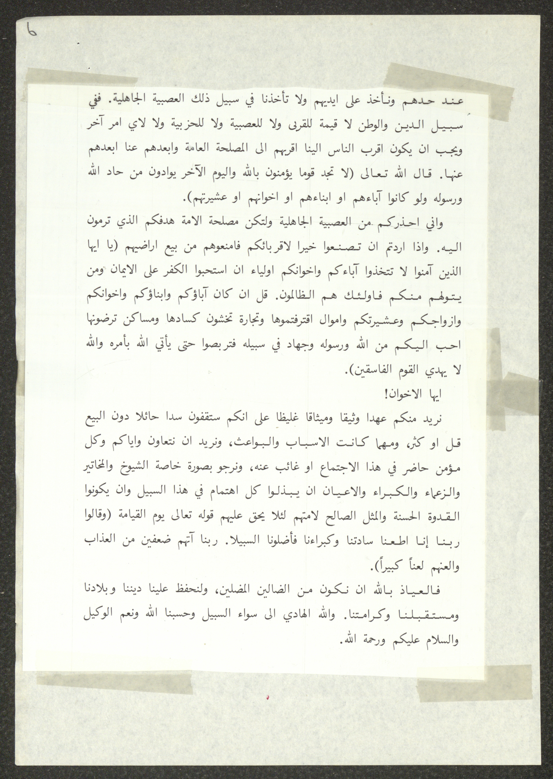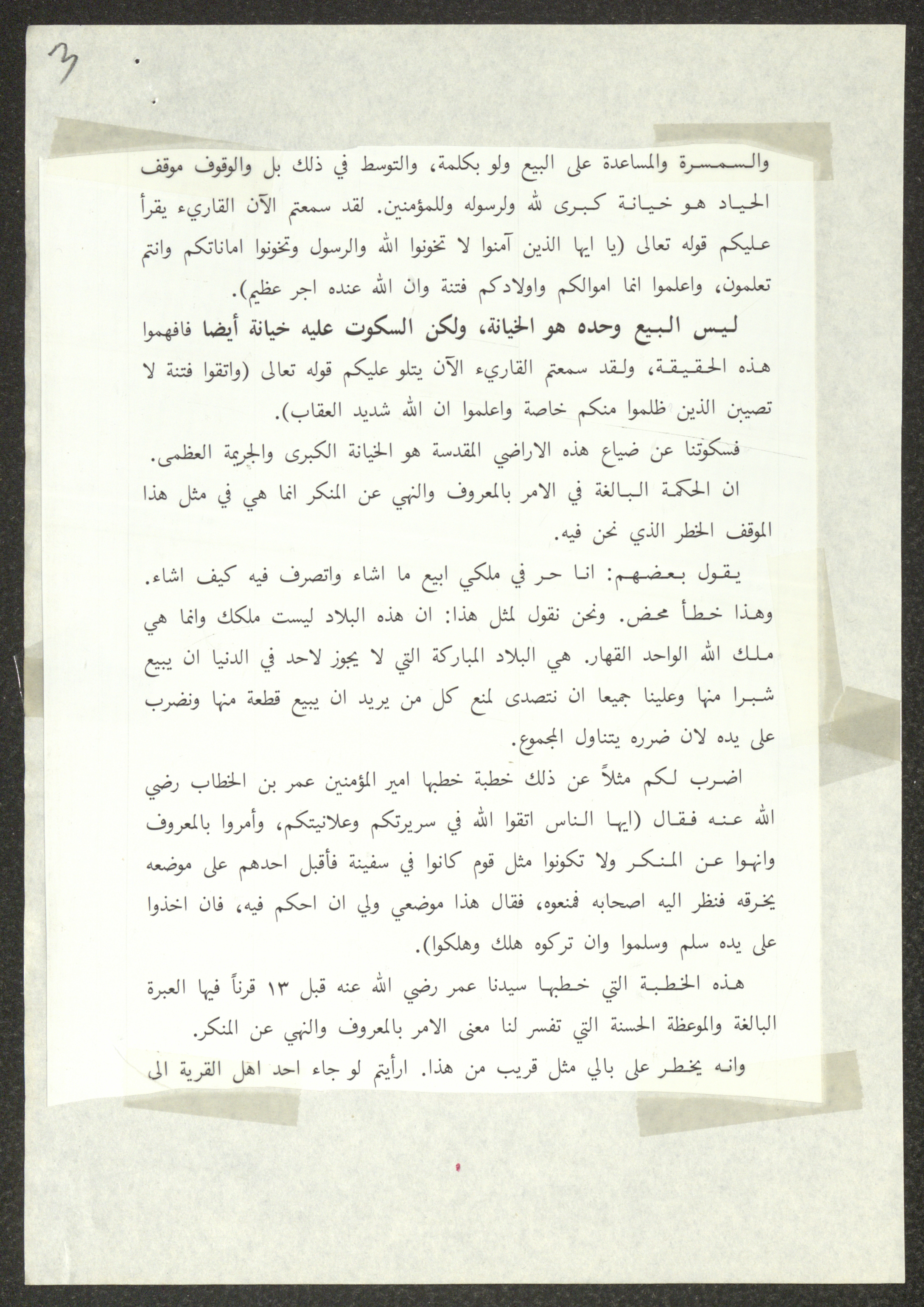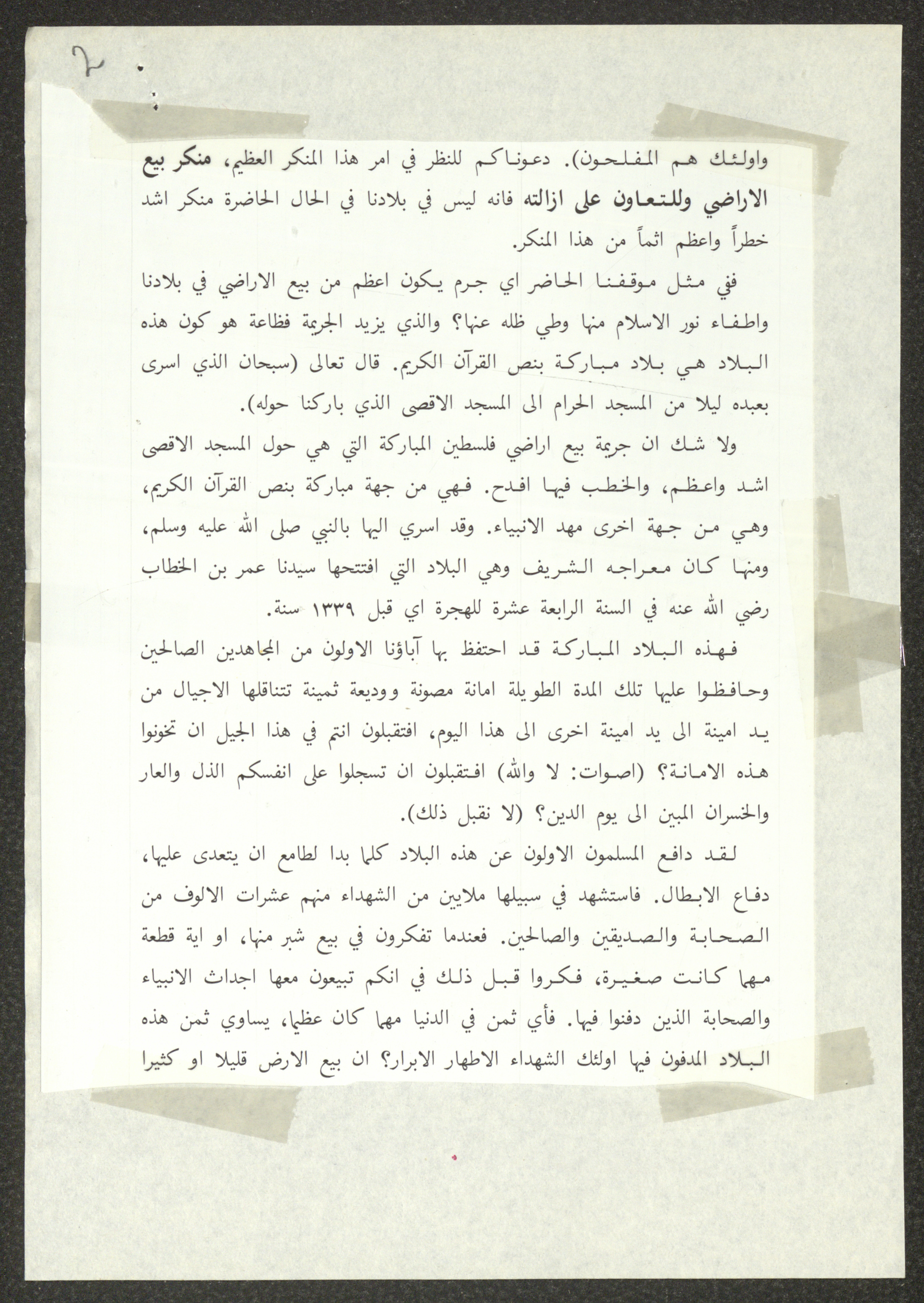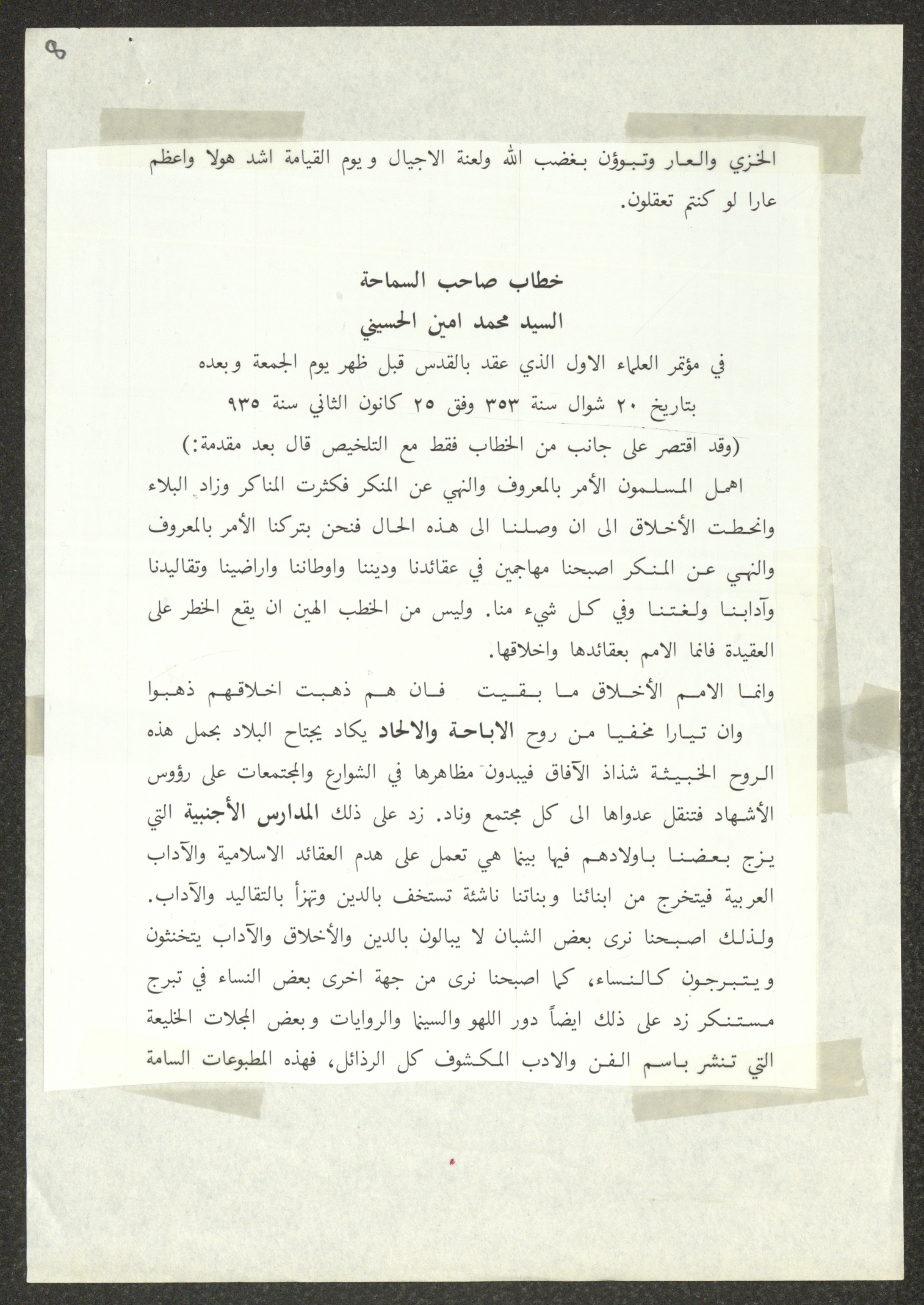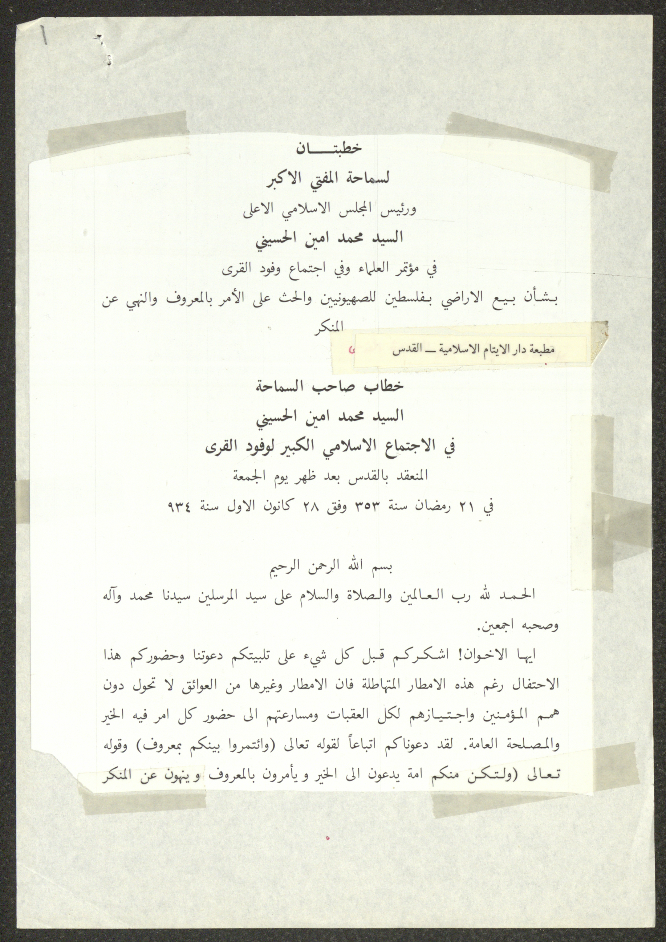 This document shows two speeches which were delivered by Haj Amin al-Husseini, president of the Supreme Islamic Sharia Council, the first of which was delivered during the General Islamic Congress of the Village Delegates, held on 28 December 1934, and the second during the First Scholar Congress, held on 25 January 1935, during which al-Husseini talked about the issue of land sale to the Zionist Movement. Both speeches were published by the Islamic Orphanage Press in Jerusalem.