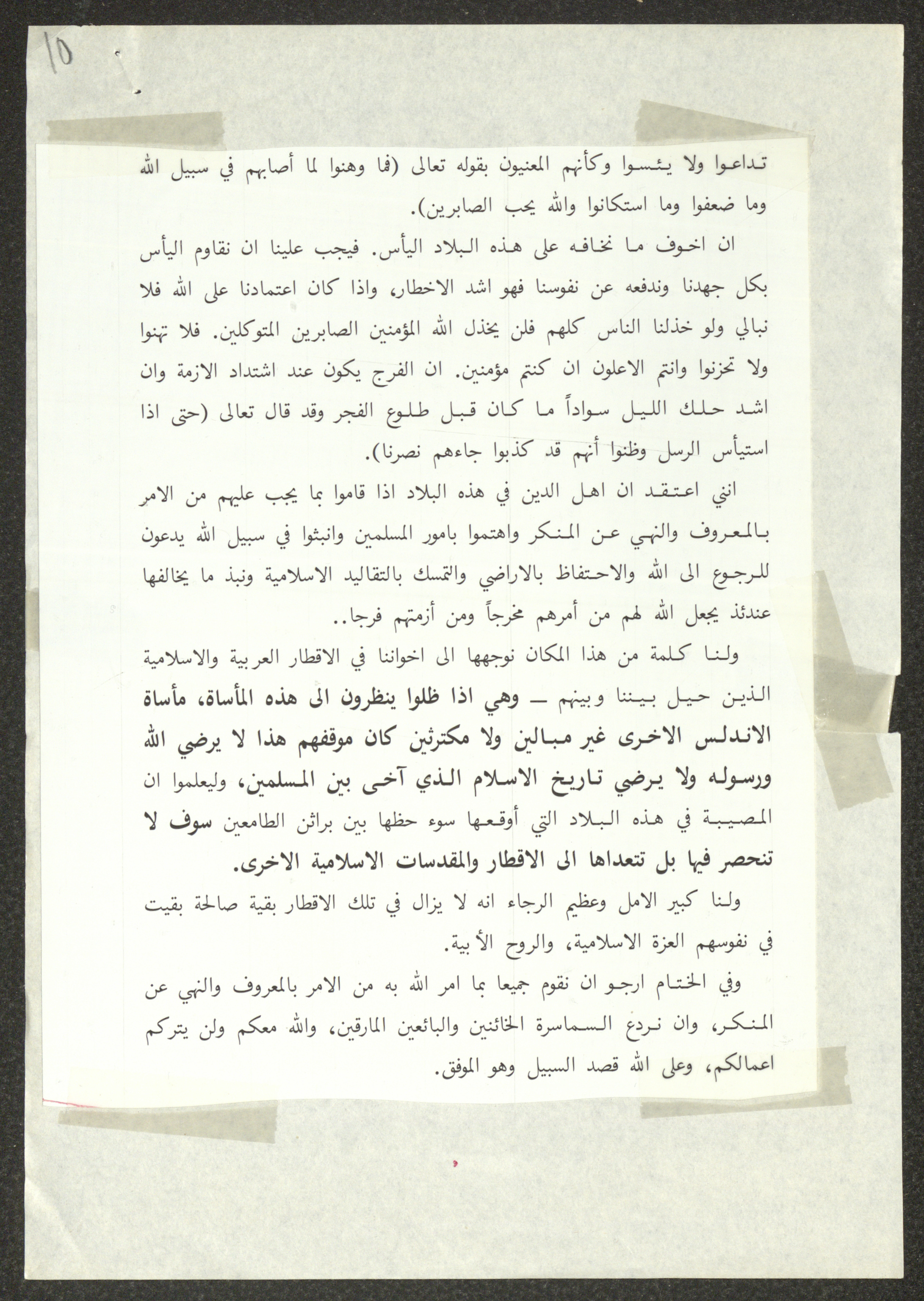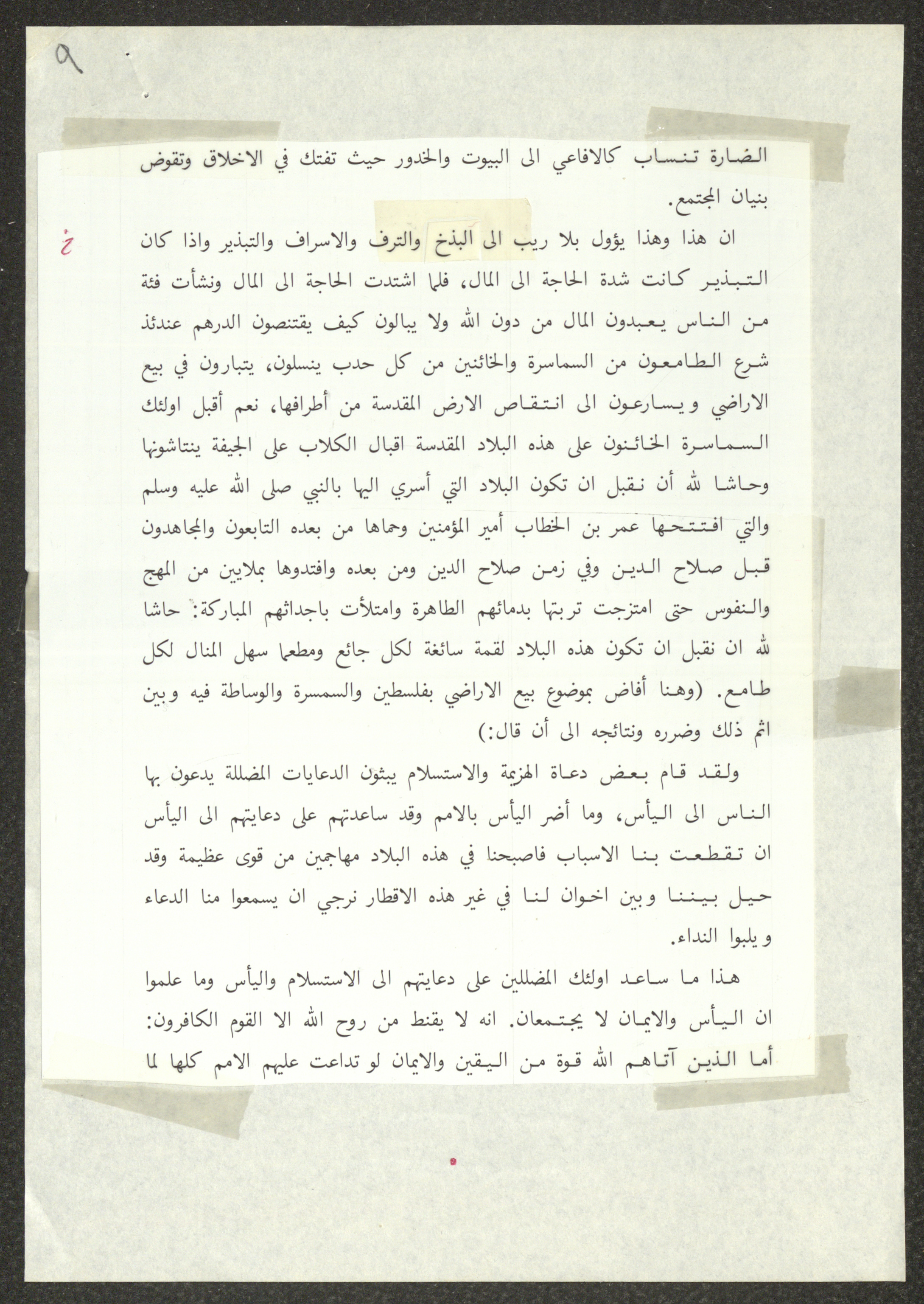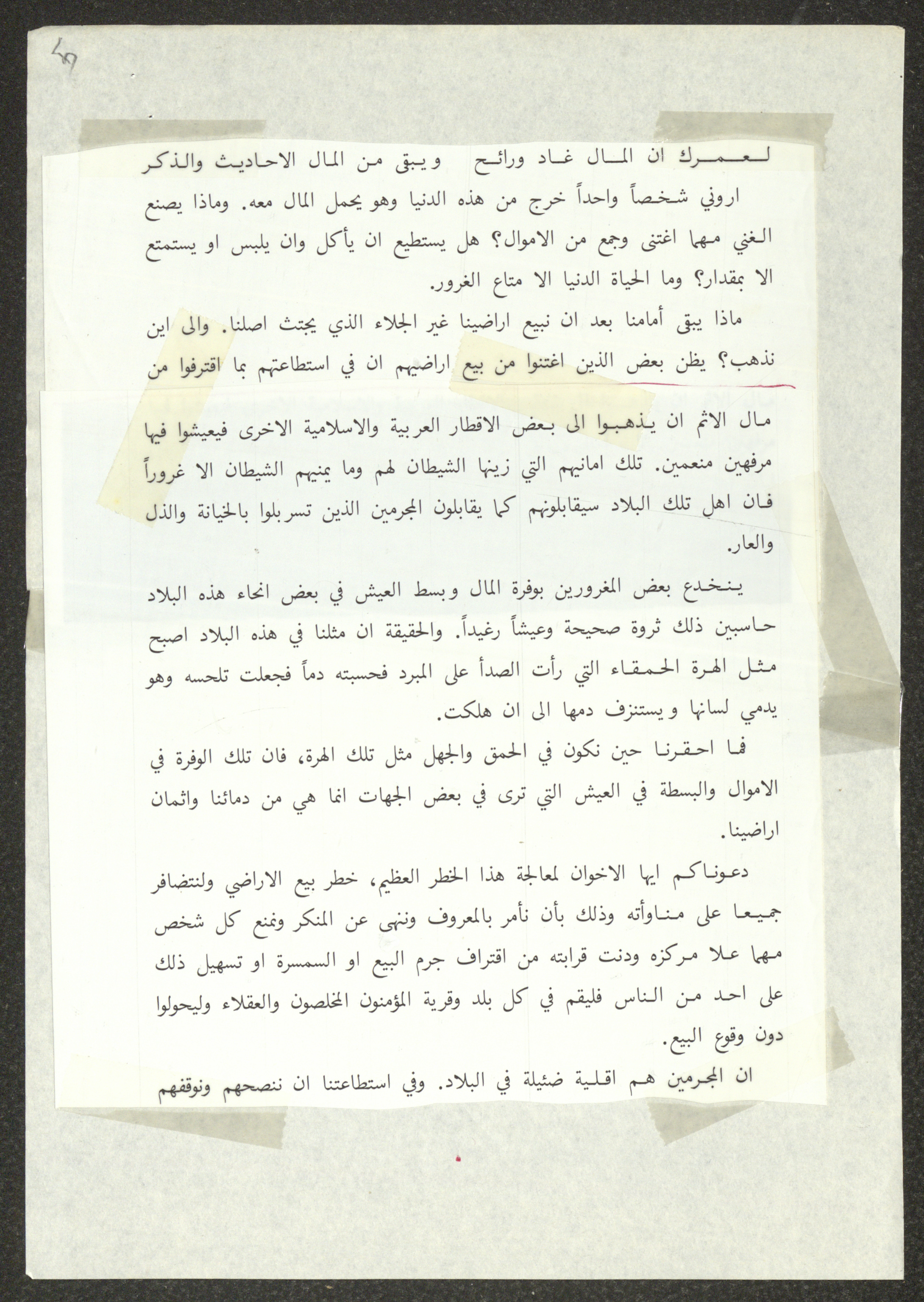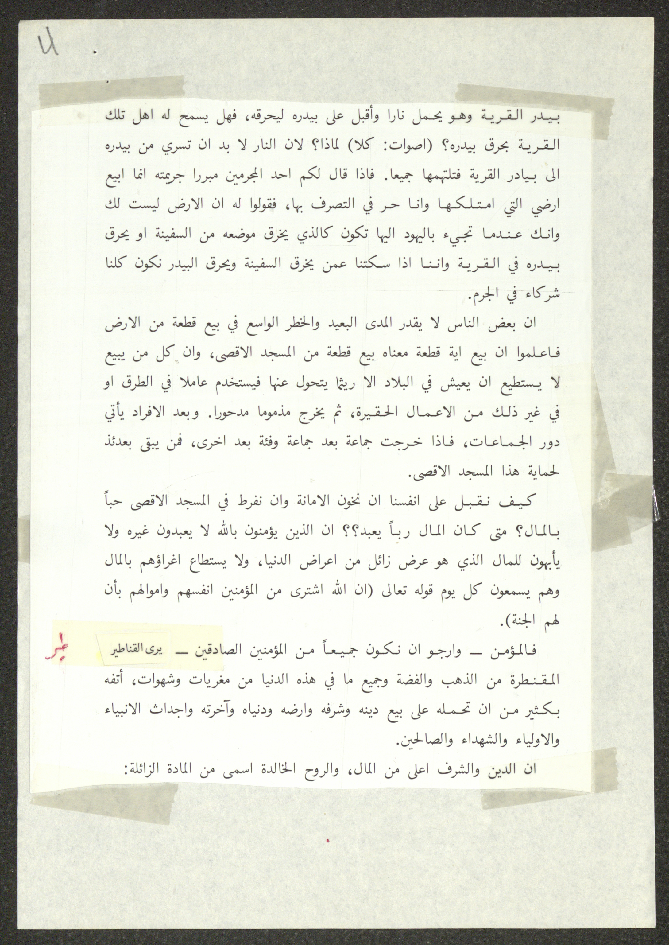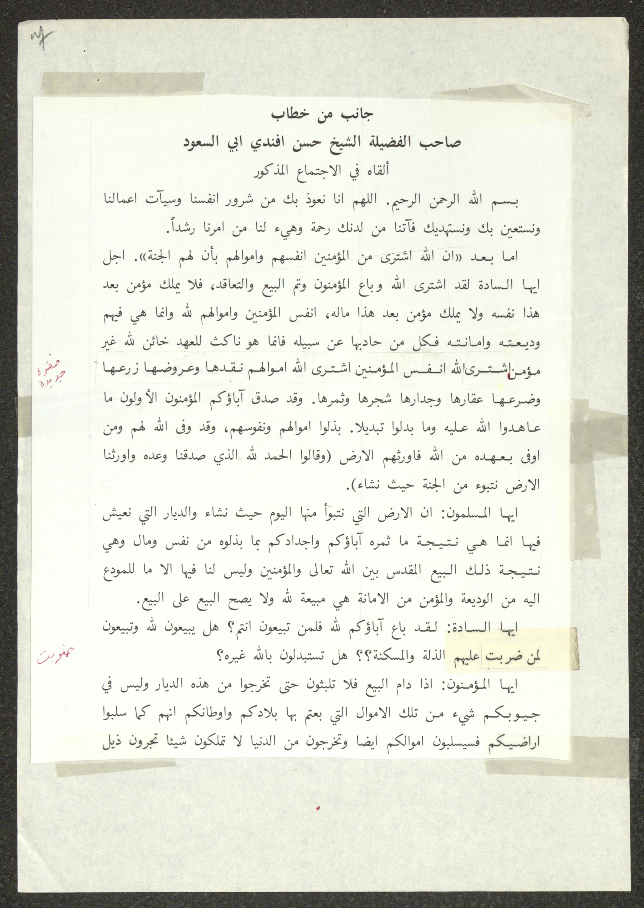 This document shows two speeches which were delivered by Haj Amin al-Husseini, president of the Supreme Islamic Sharia Council, the first of which was delivered during the General Islamic Congress of the Village Delegates, held on 28 December 1934, and the second during the First Scholar Congress, held on 25 January 1935, during which al-Husseini talked about the issue of land sale to the Zionist Movement. Both speeches were published by the Islamic Orphanage Press in Jerusalem.