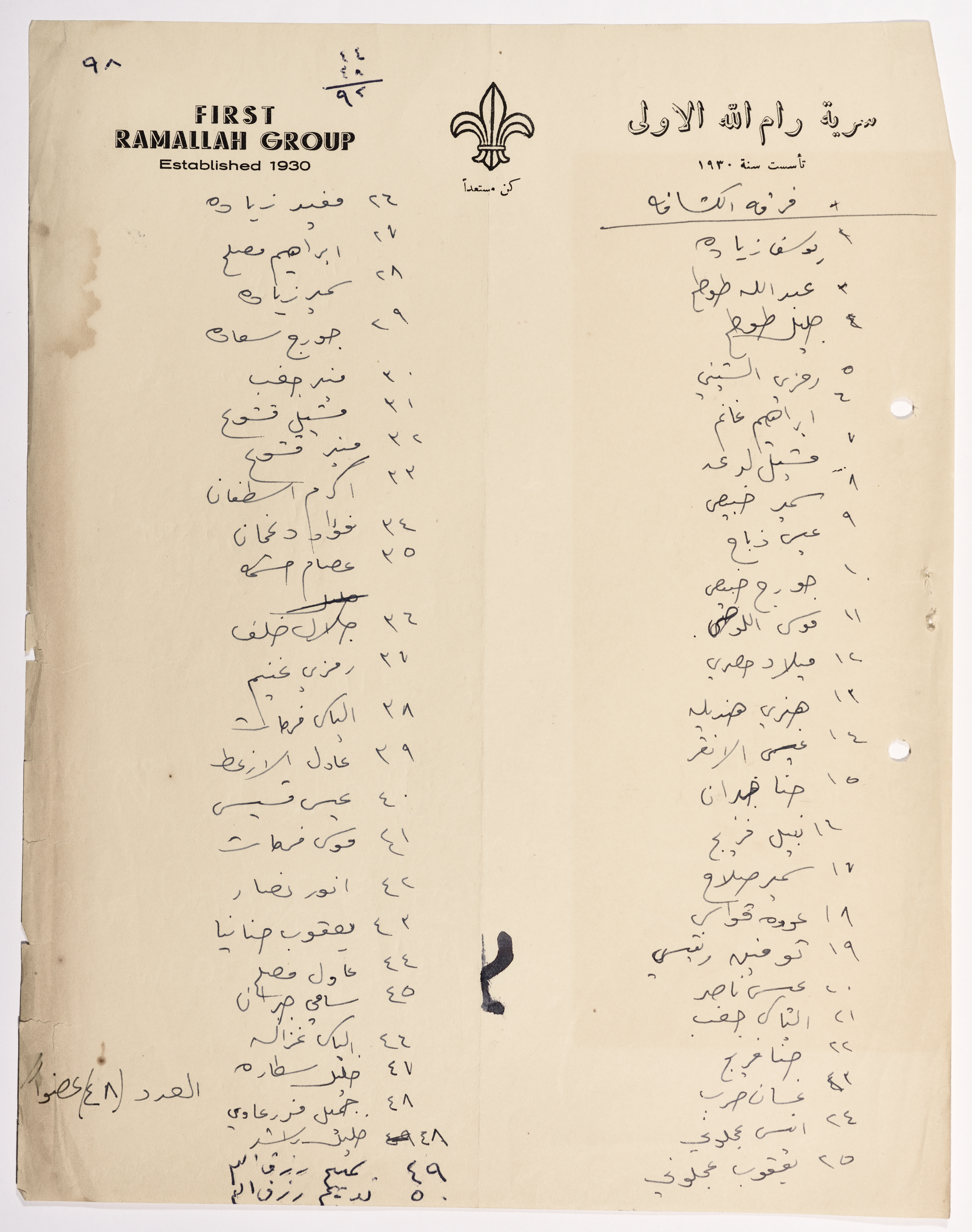 Headed by the logo of First Ramallah Group (Sareyyet Ramallah), this handwritten register contains the names of the scout group members.