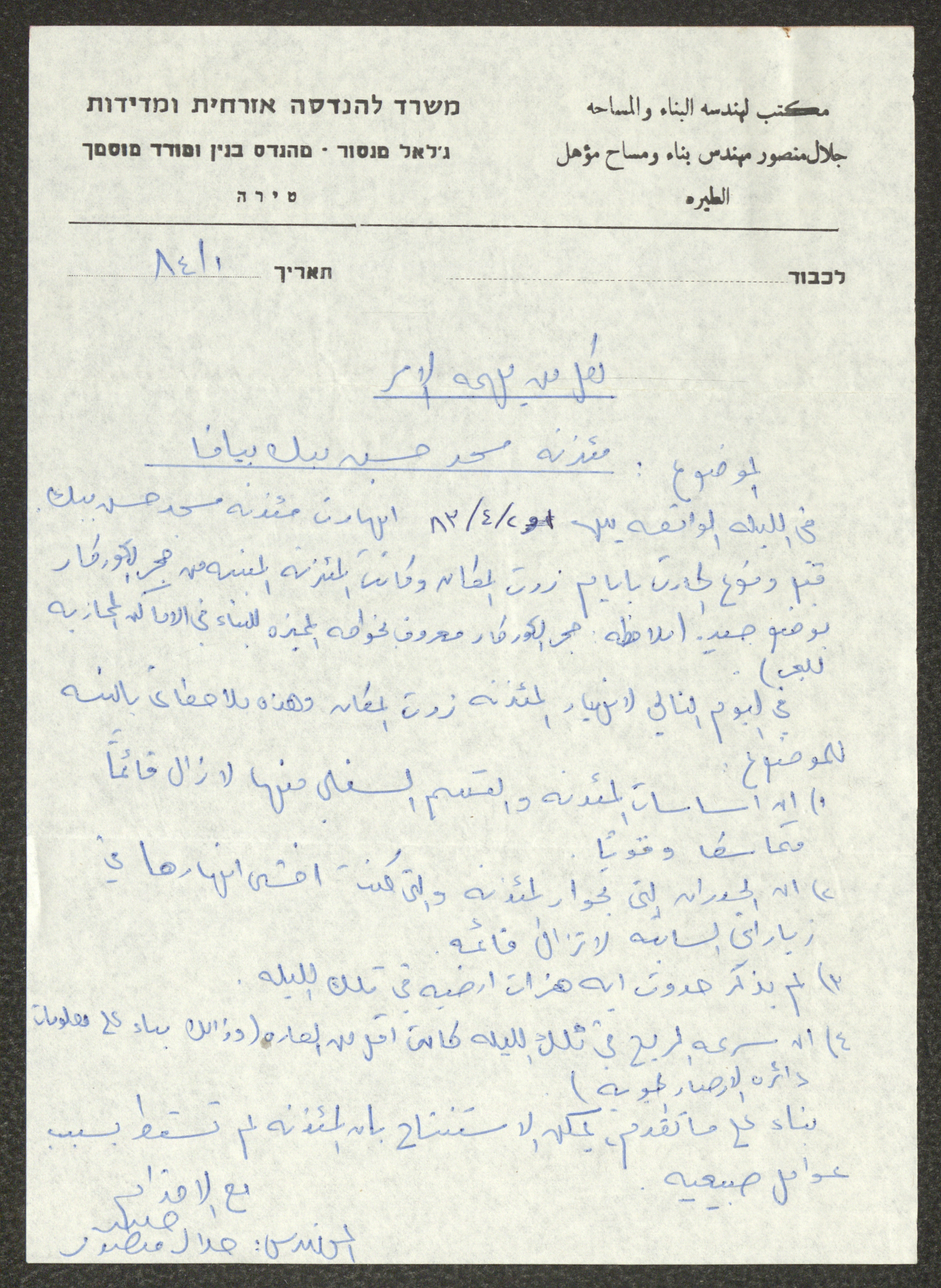تقارير صادرة عن المهندس جلال منصور بعد زيارته لمسجد حسن بيك في يافا خلال 1983-1984، كما تضم مخطط للمسجد ومئذنته.