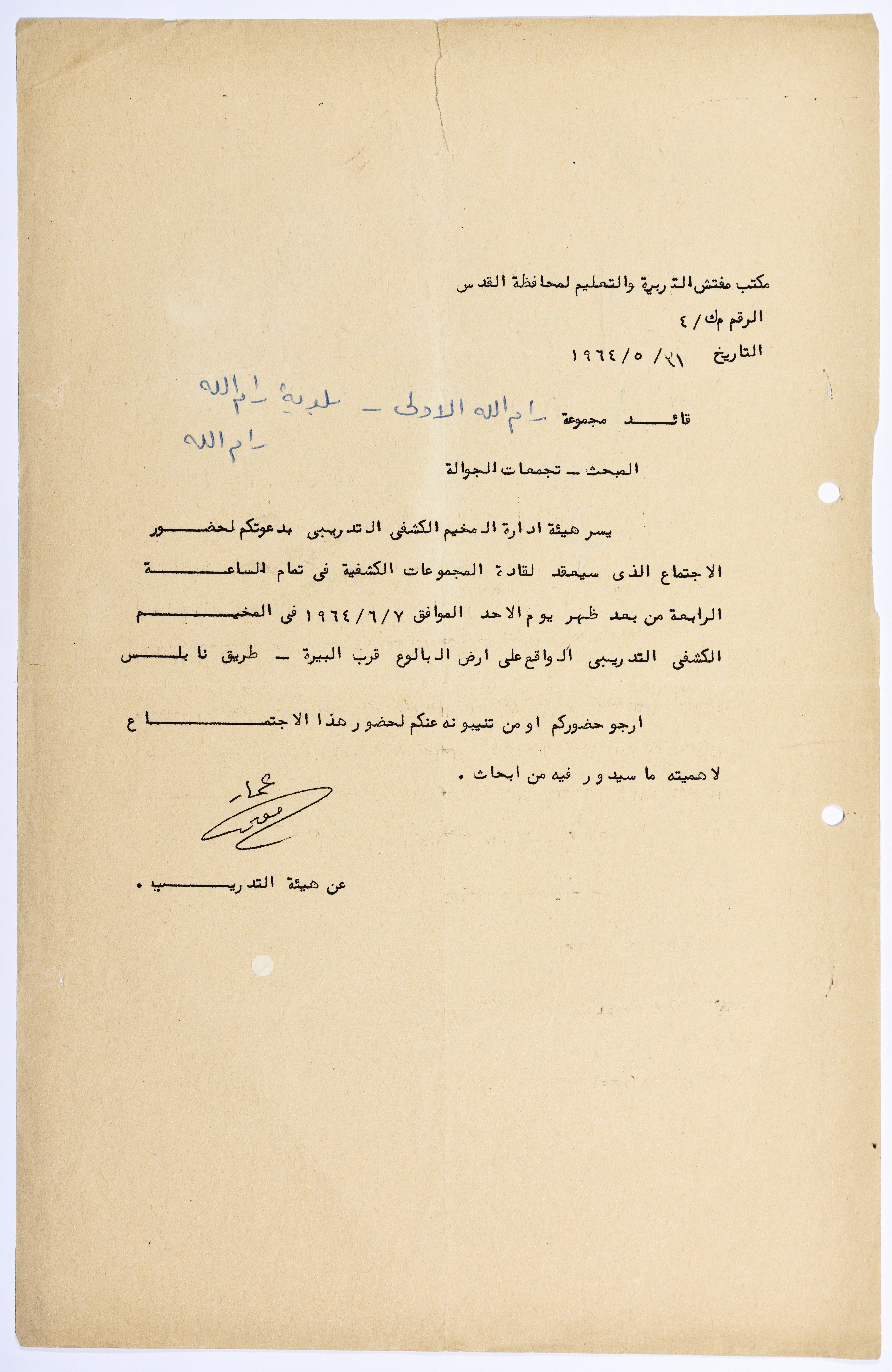 دعوة من مديرية التربية والتعليم في محافظة القدس موجهة لقائد مجموعة رام الله الأولى من أجل حضور اجتماع لقادة الفرق الكشفية في مدينة البيرة في عام 1964.