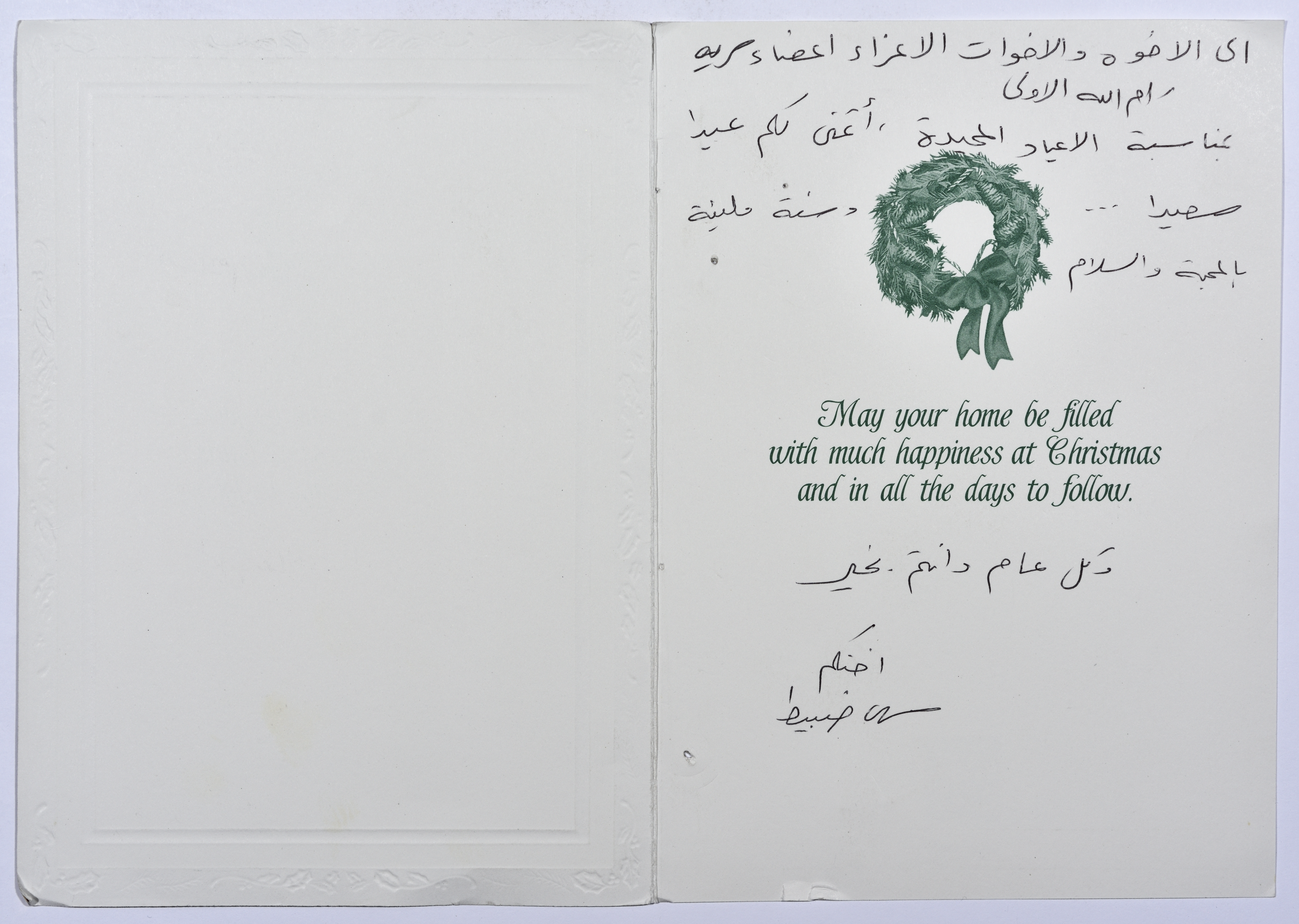بطاقة معايدة مطبوعة بمناسبة أعياد الميلاد ورأس السنة الميلادية قدمتها سهى ضبيط إلى سرية رام الله الأولى.