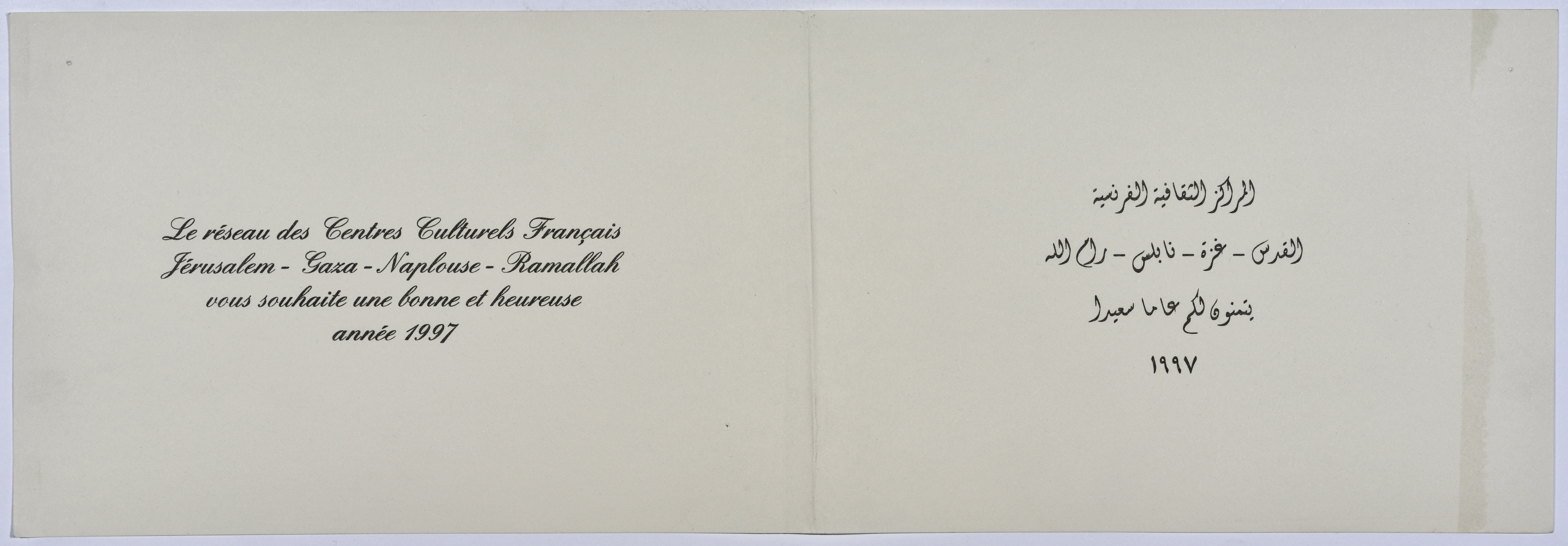 Dated 1997, this is a printed New Year greeting card from the French Cultural Centre to Sareyyet Ramallah.
