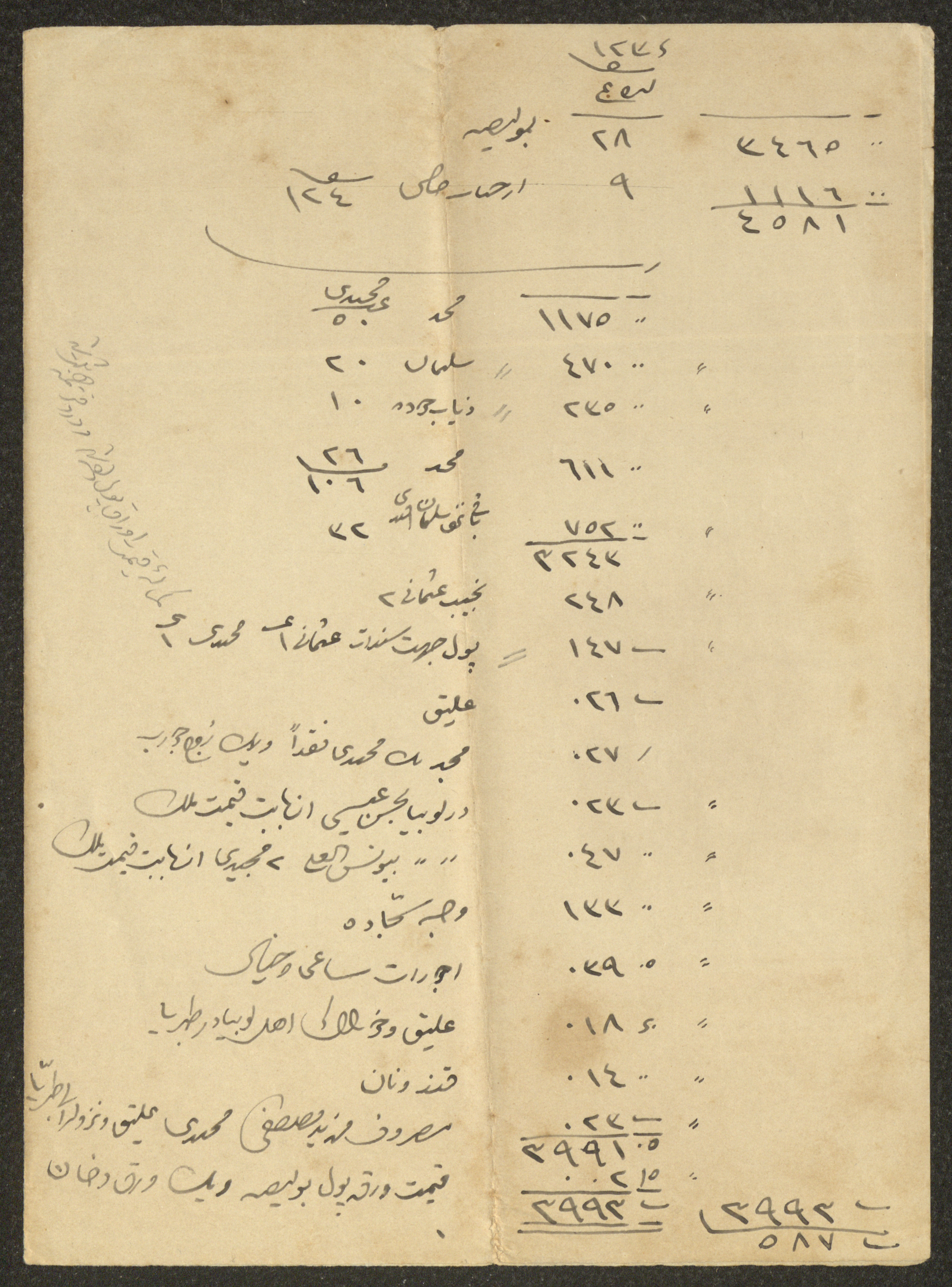 Issued in the early 20th century and written in Ottoman, this document shows a balance sheet of the expenses paid by a person from the al-Husseini Family.