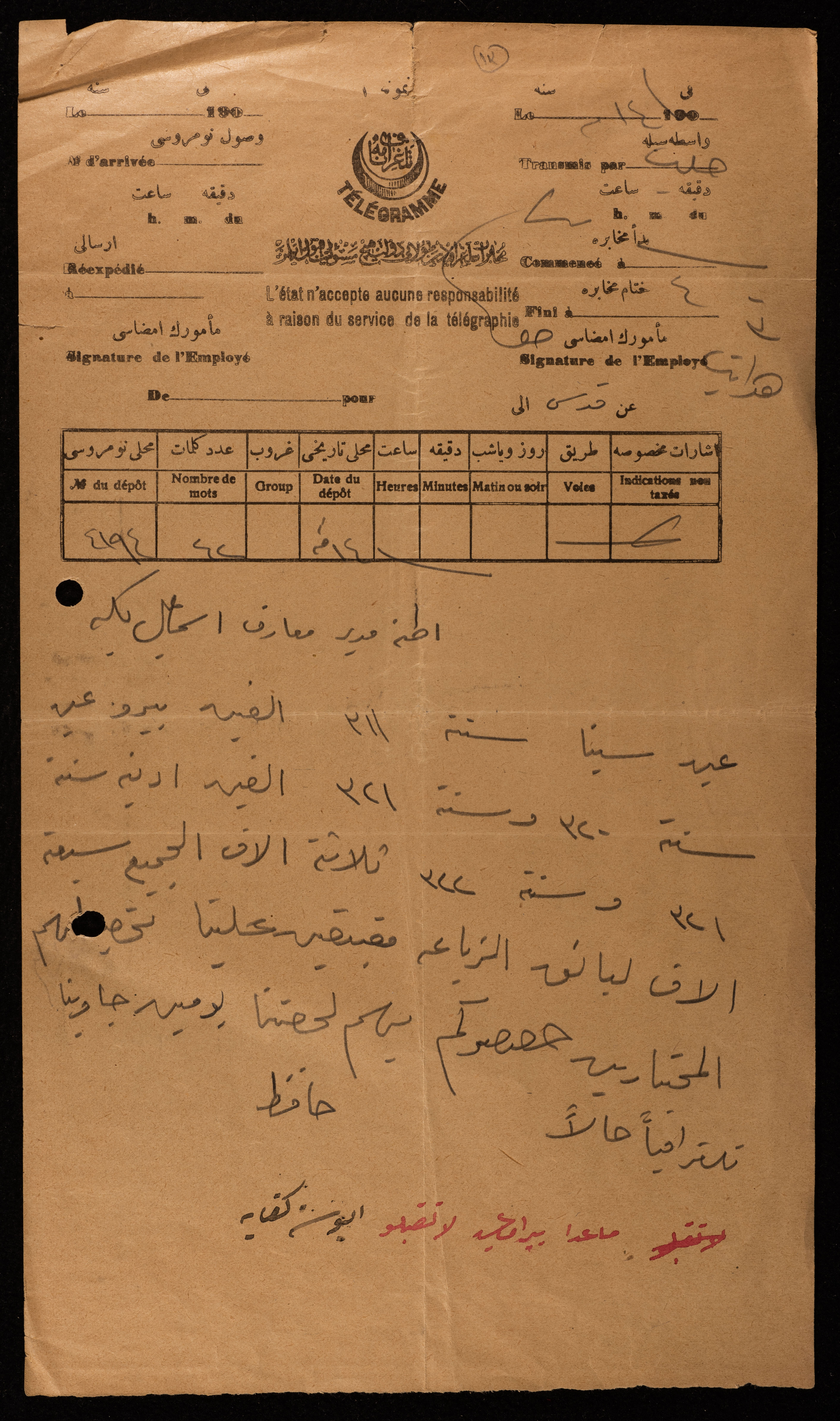 A Telegram from Hafeth al-Alami to Ismael al-Husseini, Jerusalem, the Early 20th Century