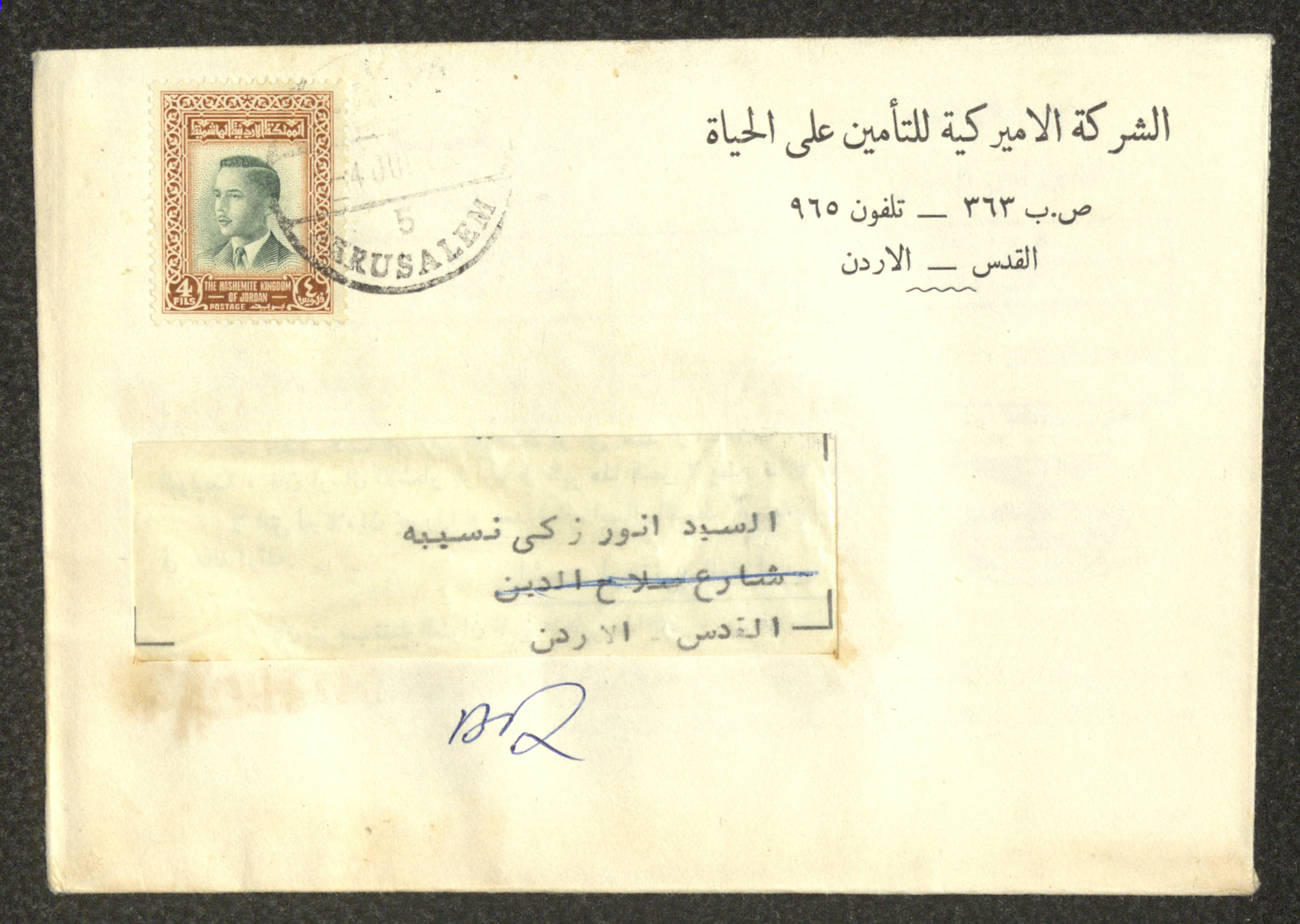 Printed in English, this archival item documents an empty envelope issued by the American Insurence Company to Anwar Nusseibeh; whereas the upper side of the envelope features the P. O. Box, the phone number and each of Jerusalem and Jordan in addition to the postal stamps of the Hashemite Kingdom of Jordan and the arrival stamp to Jerusalem.
