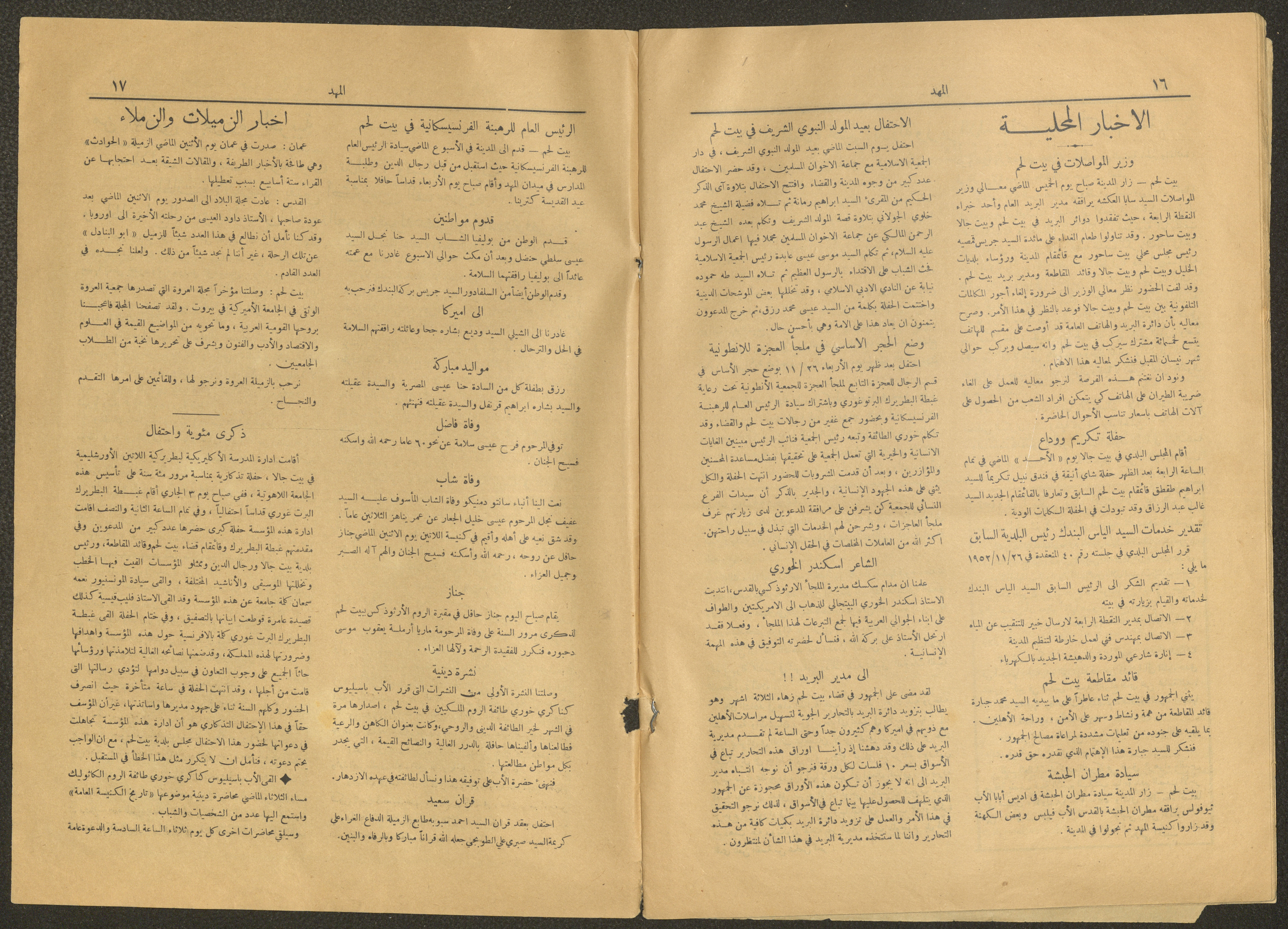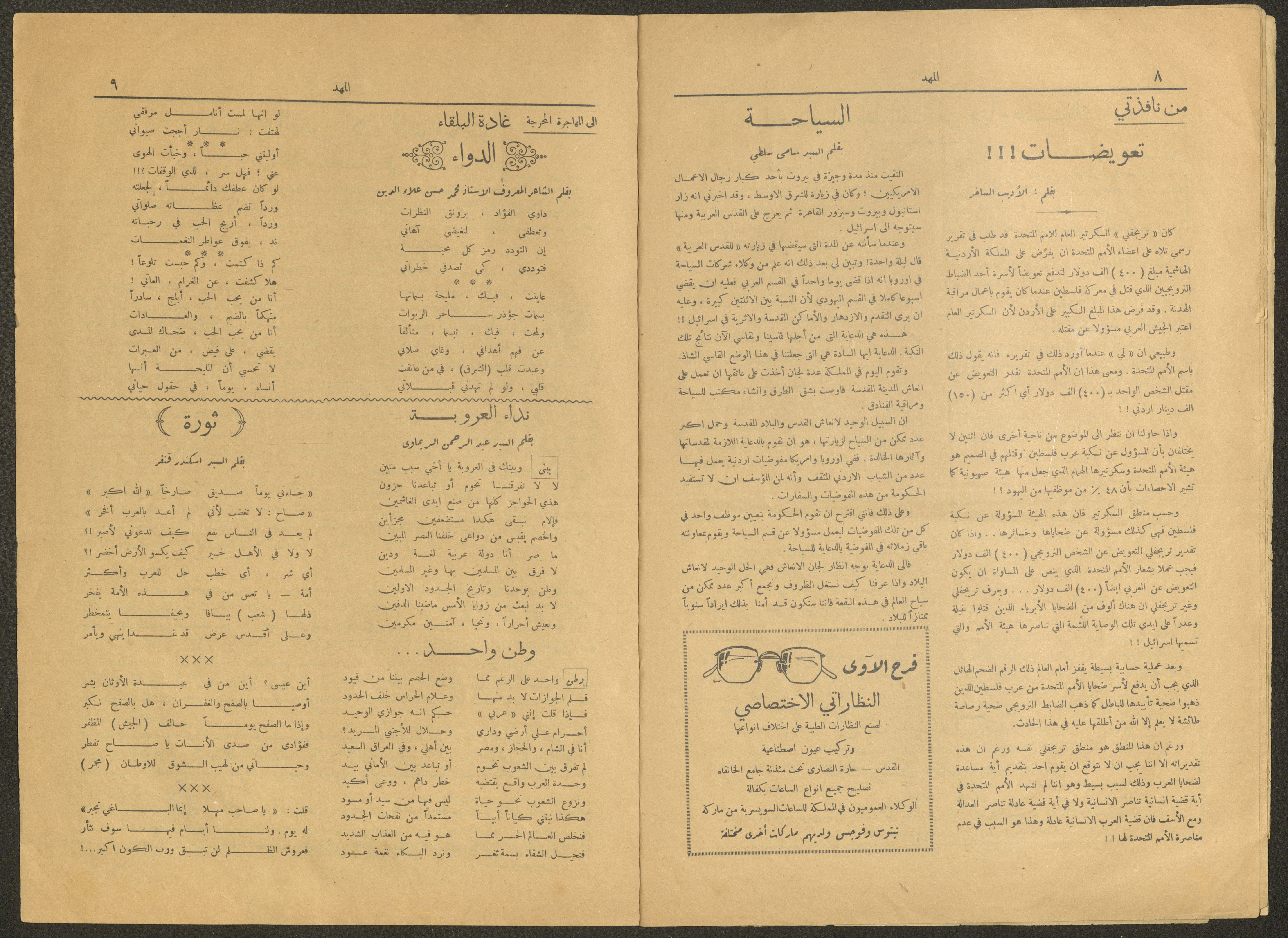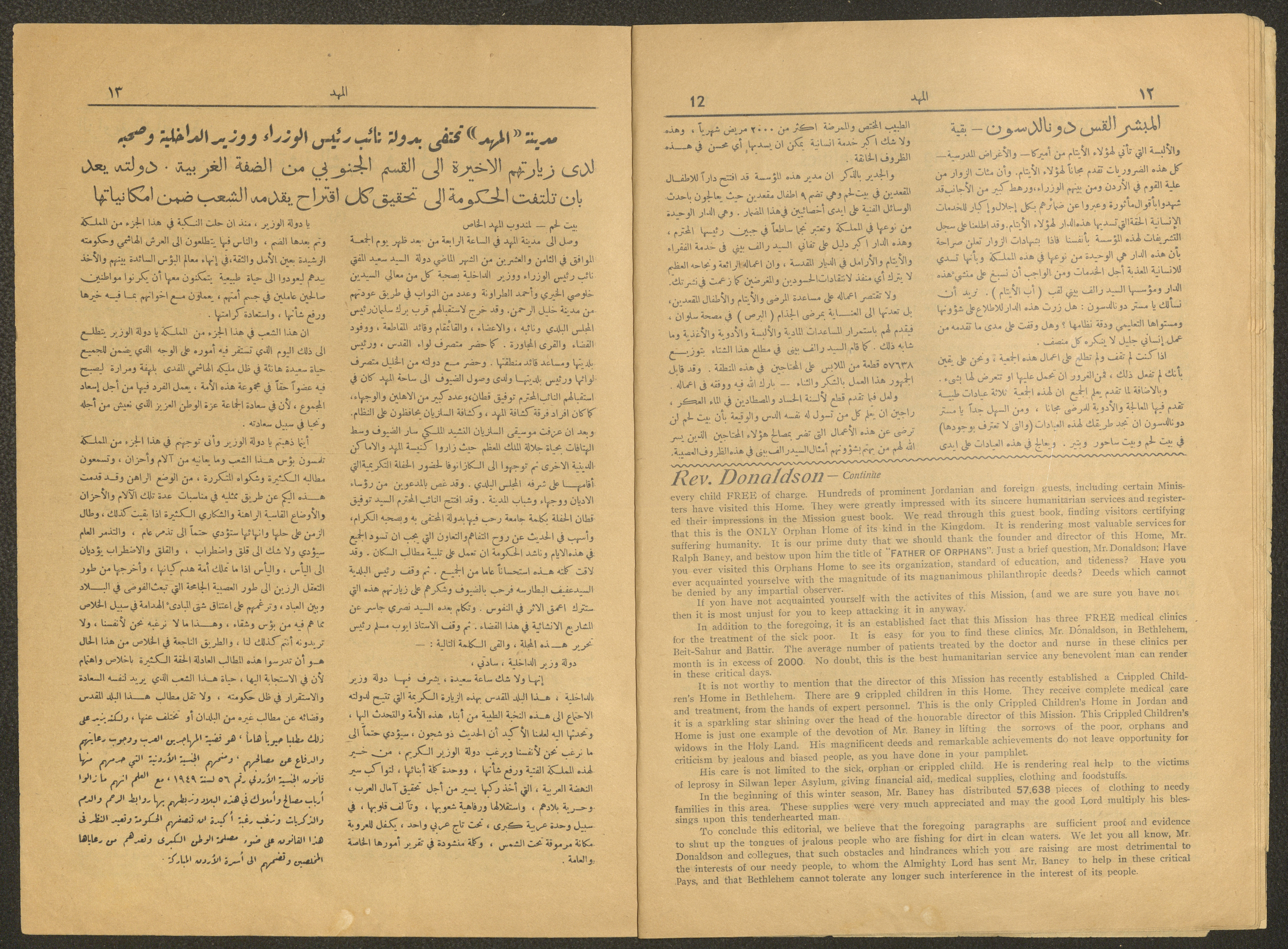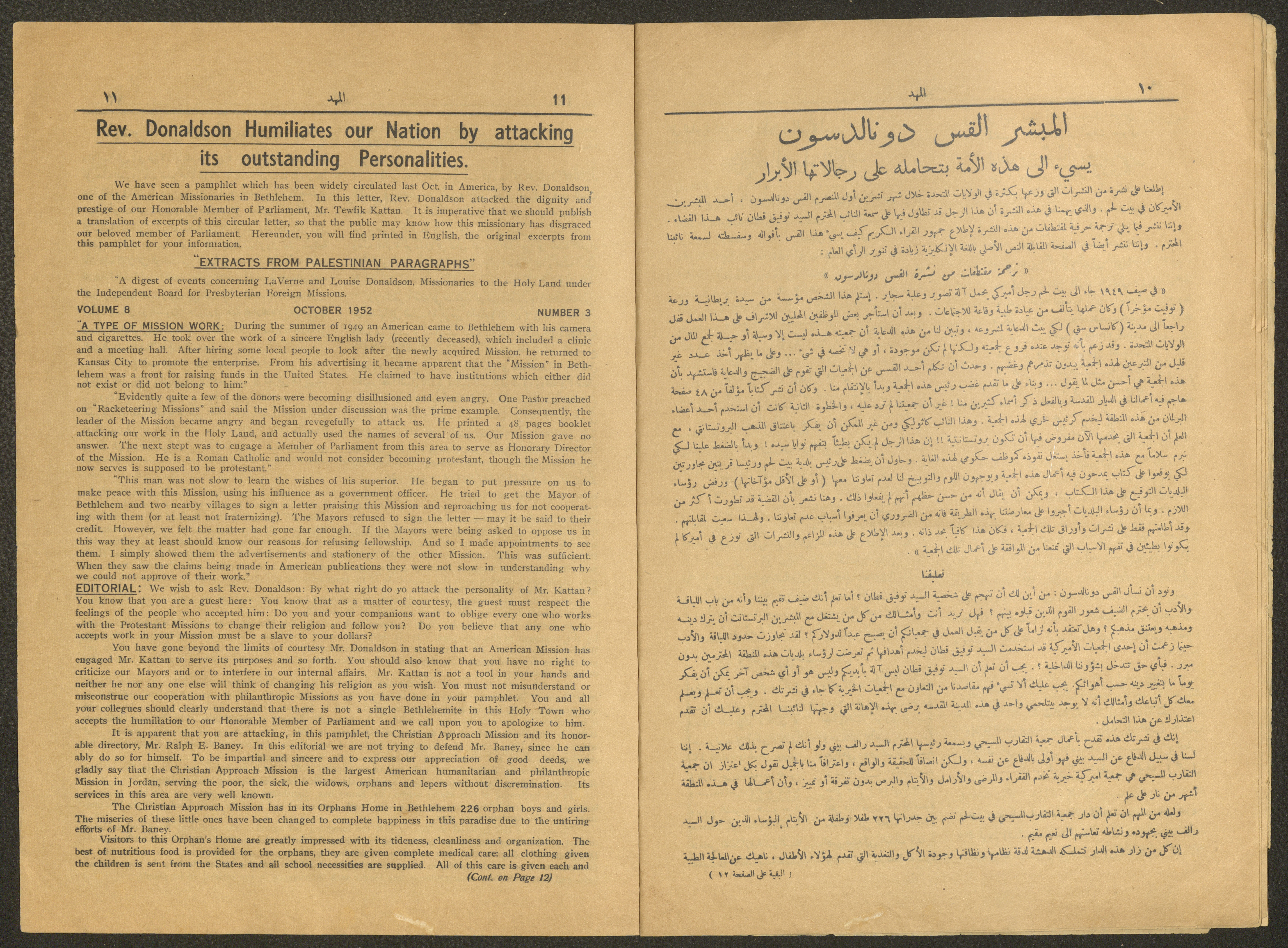 Issue 26 of the al-Mahd magazine, issued on 7 December 1952, and is a weekly, political and literary magazine, which was published in Bethlehem, where Ayoub Msallam was the franchisee and chief editor, while Nabil Shehadeh al-Khoury was its managing editor, Saba al-Bandak was its managing director, and his assistant was Mikhail Salim Kanawati. On its fourth page, the magazine published thought by Yaqoub al-Awdat, known as the masked Bedouin, about his trip to South America, and on its tenth page, the magazine addressed what was stated in one of the bulletins by the American priest Donaldson about prejudice and insulting to Tawfiq Qattan, the Deputy of Bethlehem Judiciary.