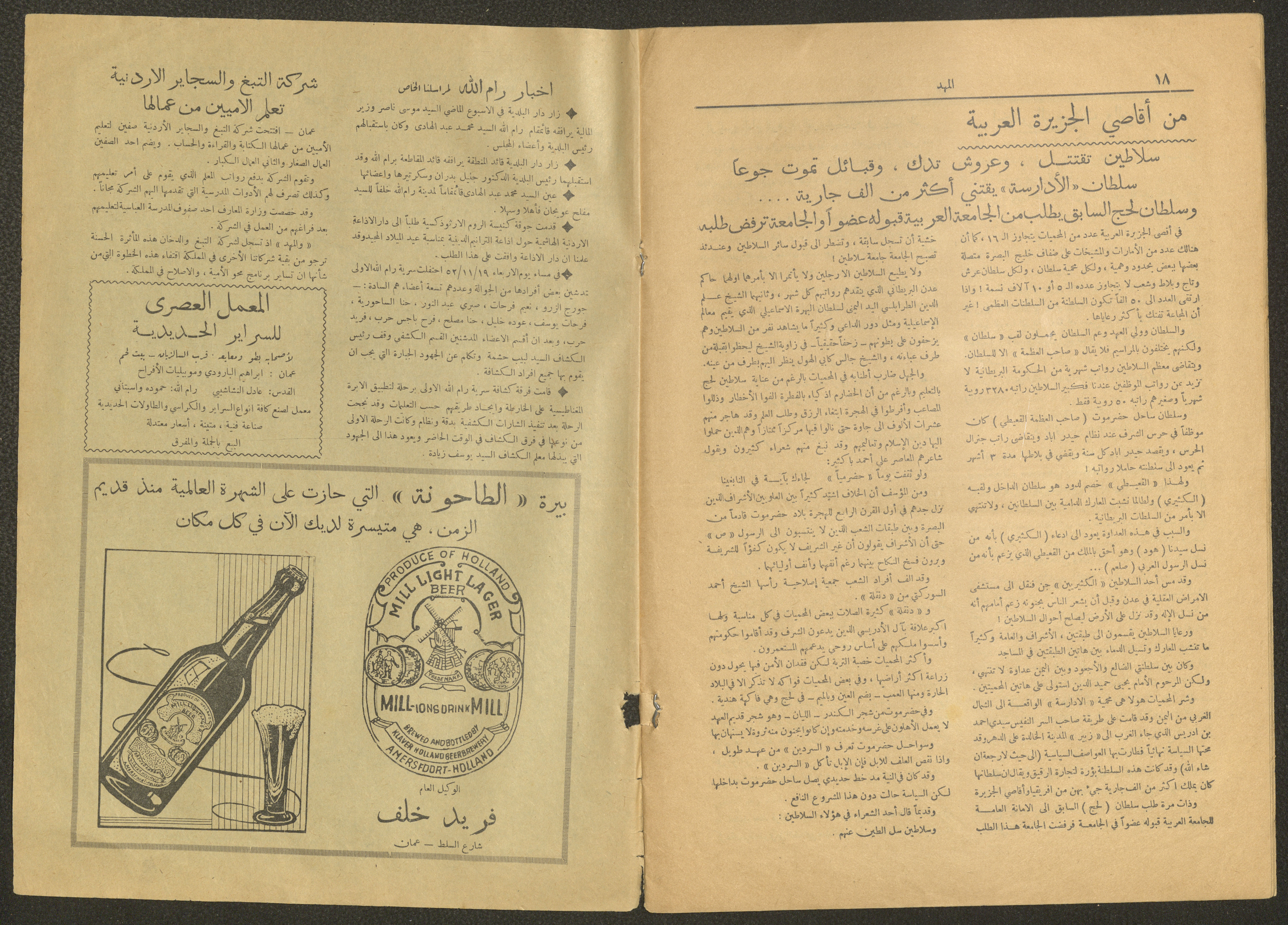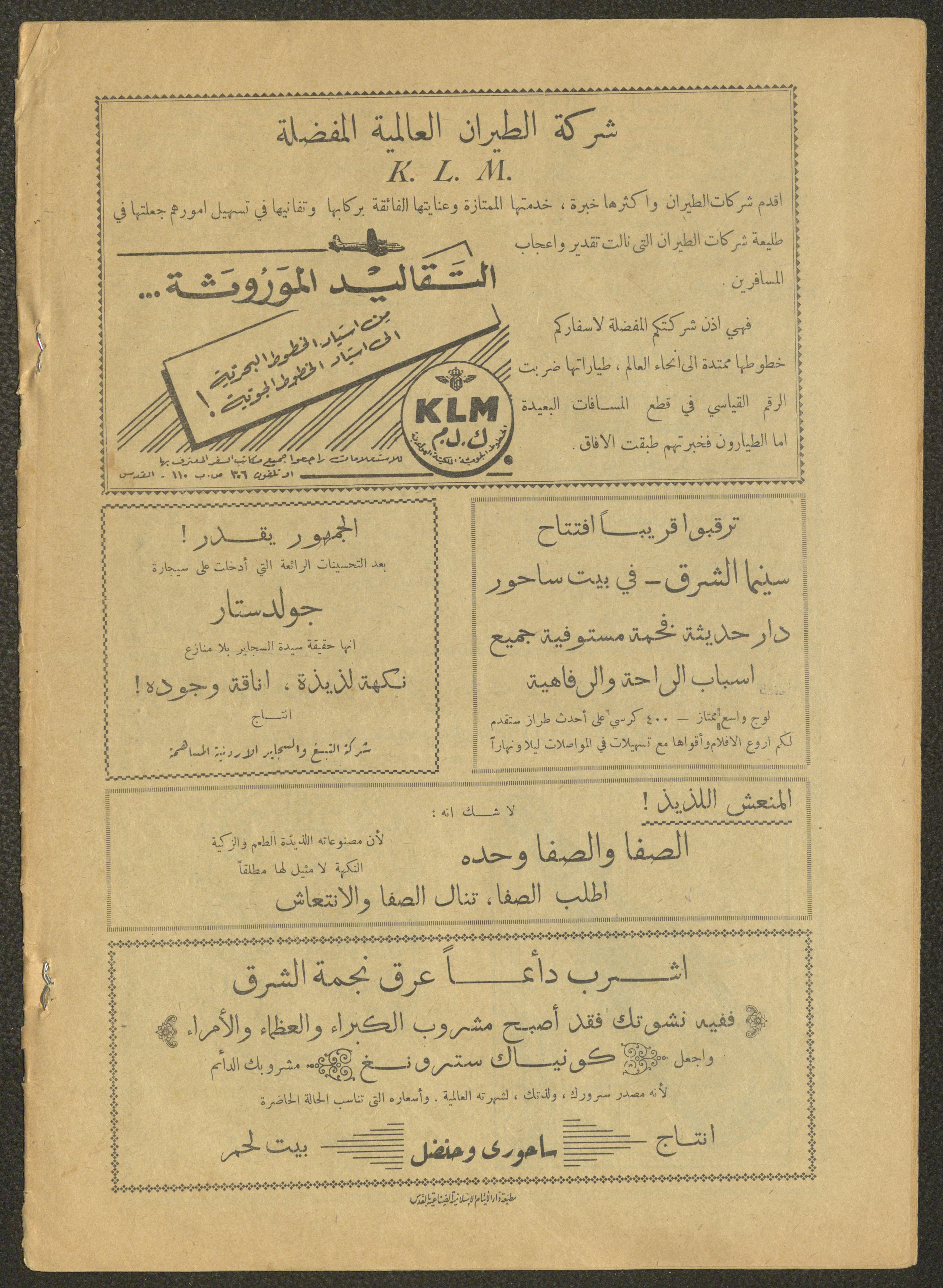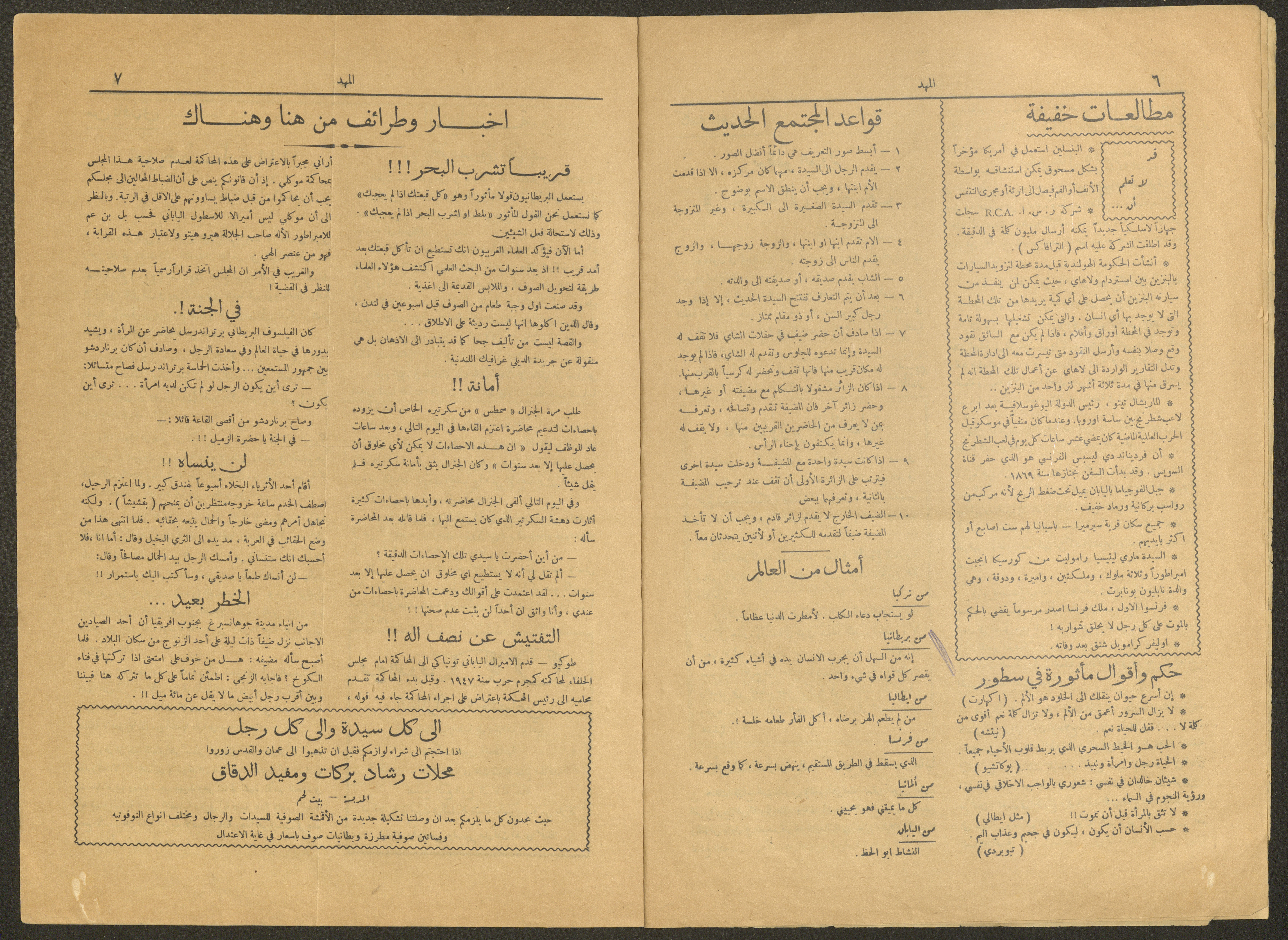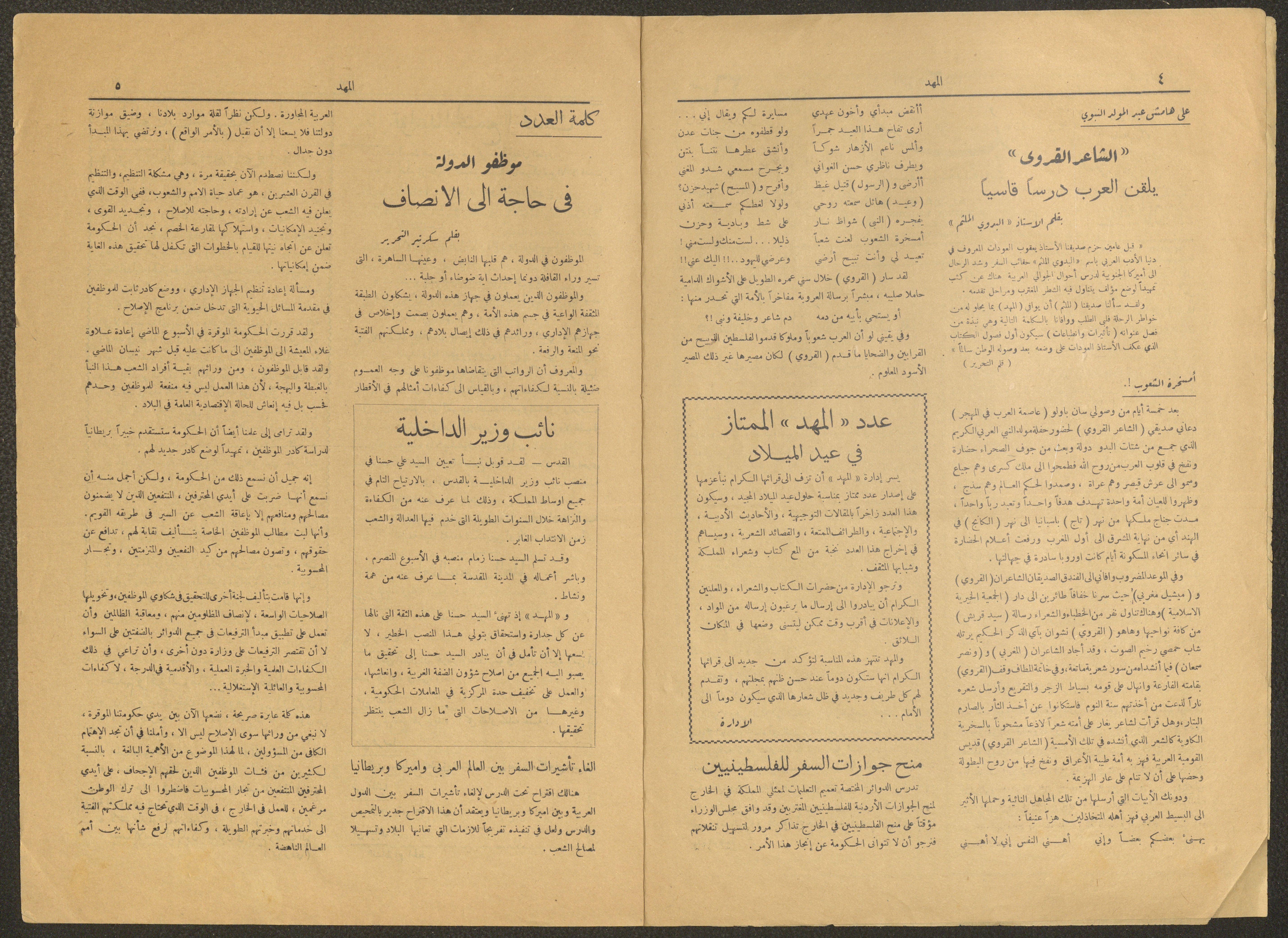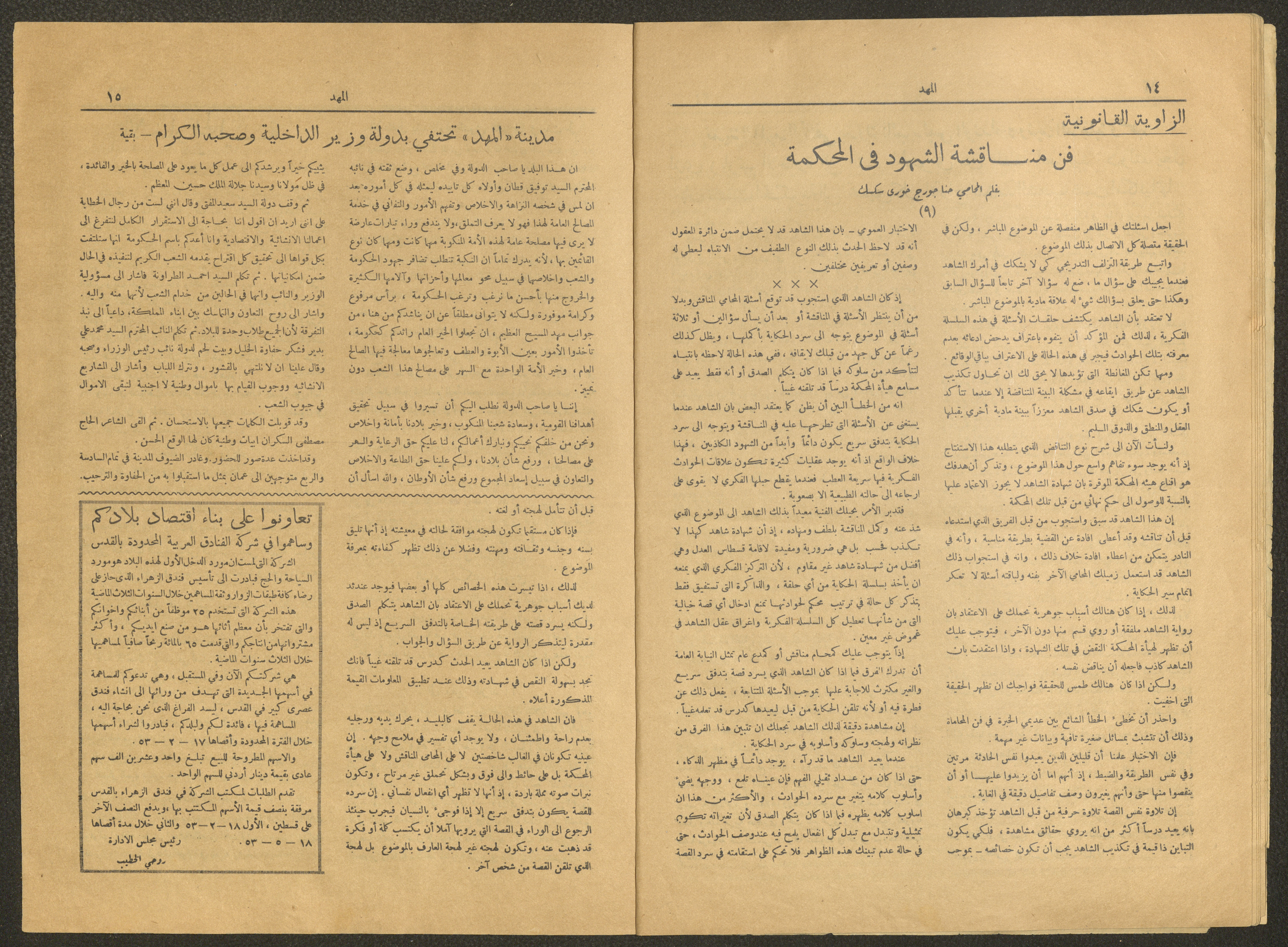 Issue 26 of the al-Mahd magazine, issued on 7 December 1952, and is a weekly, political and literary magazine, which was published in Bethlehem, where Ayoub Msallam was the franchisee and chief editor, while Nabil Shehadeh al-Khoury was its managing editor, Saba al-Bandak was its managing director, and his assistant was Mikhail Salim Kanawati. On its fourth page, the magazine published thought by Yaqoub al-Awdat, known as the masked Bedouin, about his trip to South America, and on its tenth page, the magazine addressed what was stated in one of the bulletins by the American priest Donaldson about prejudice and insulting to Tawfiq Qattan, the Deputy of Bethlehem Judiciary.