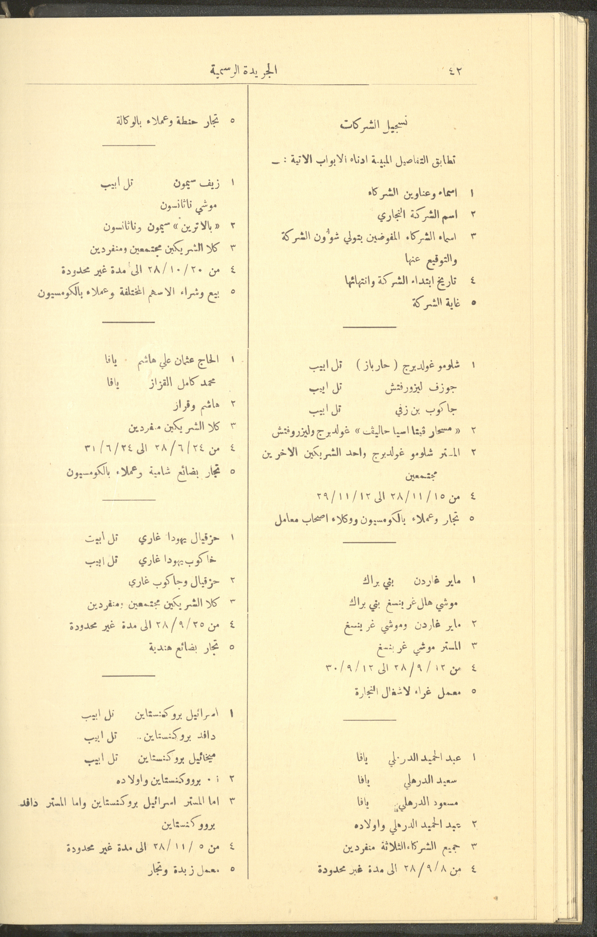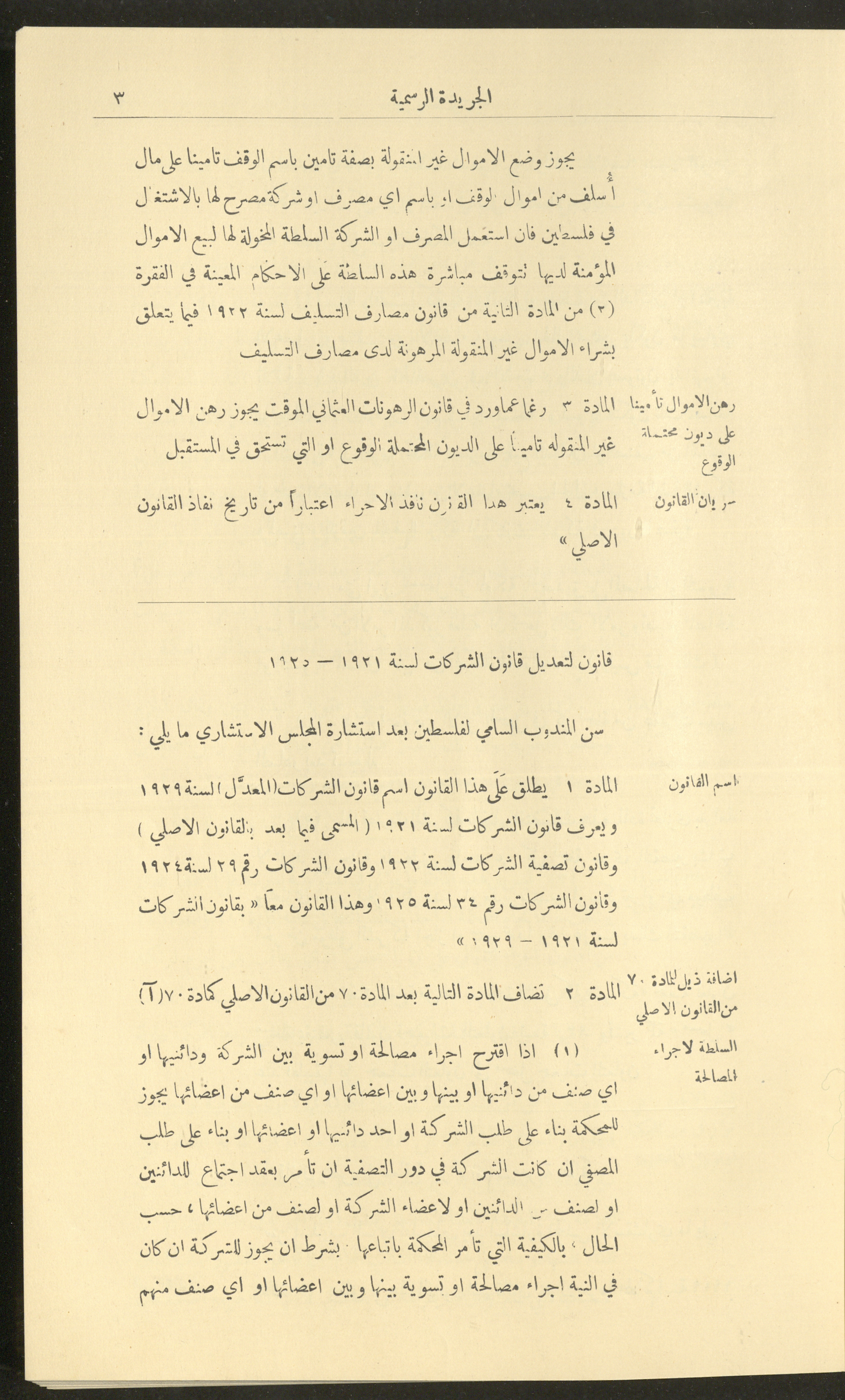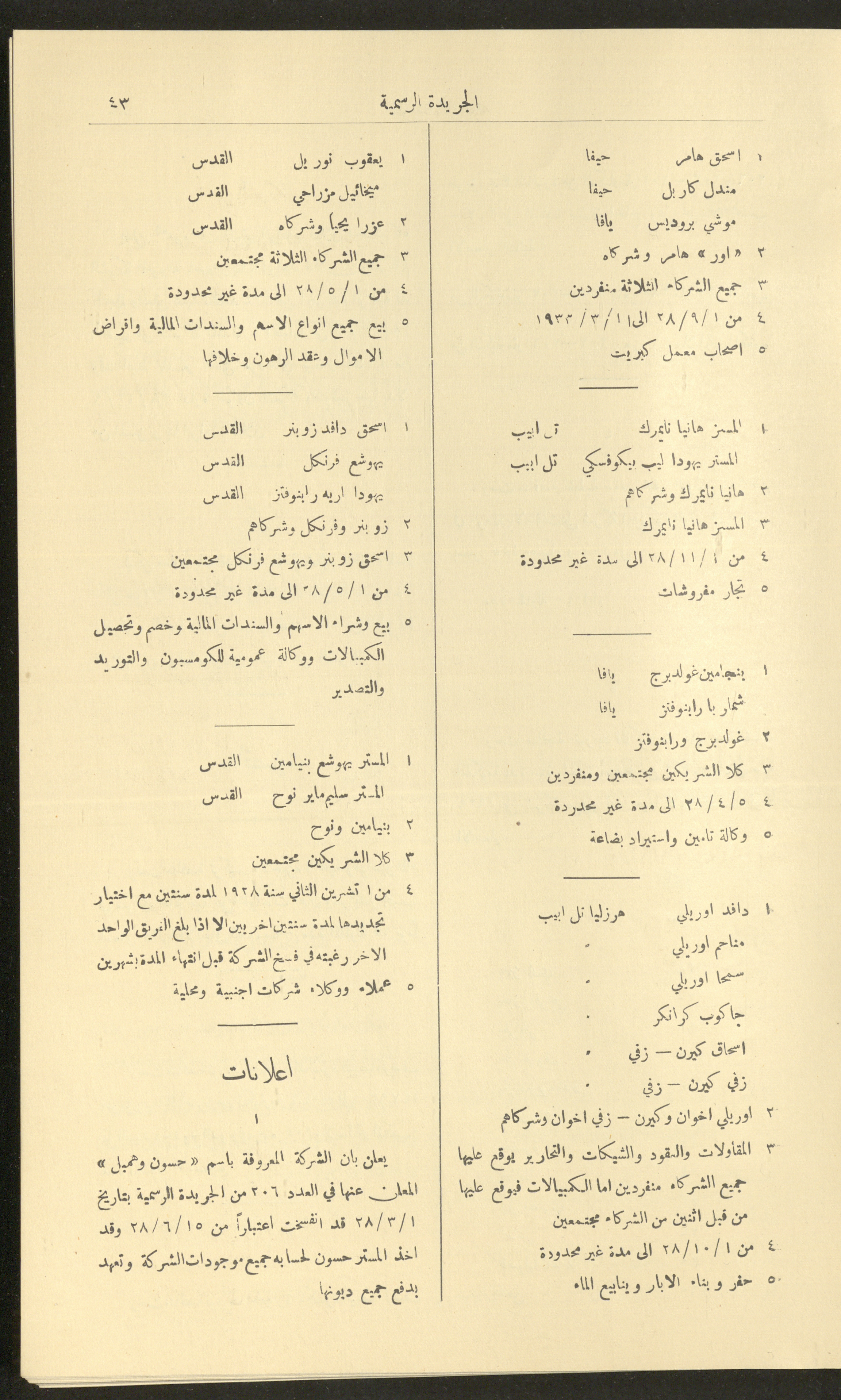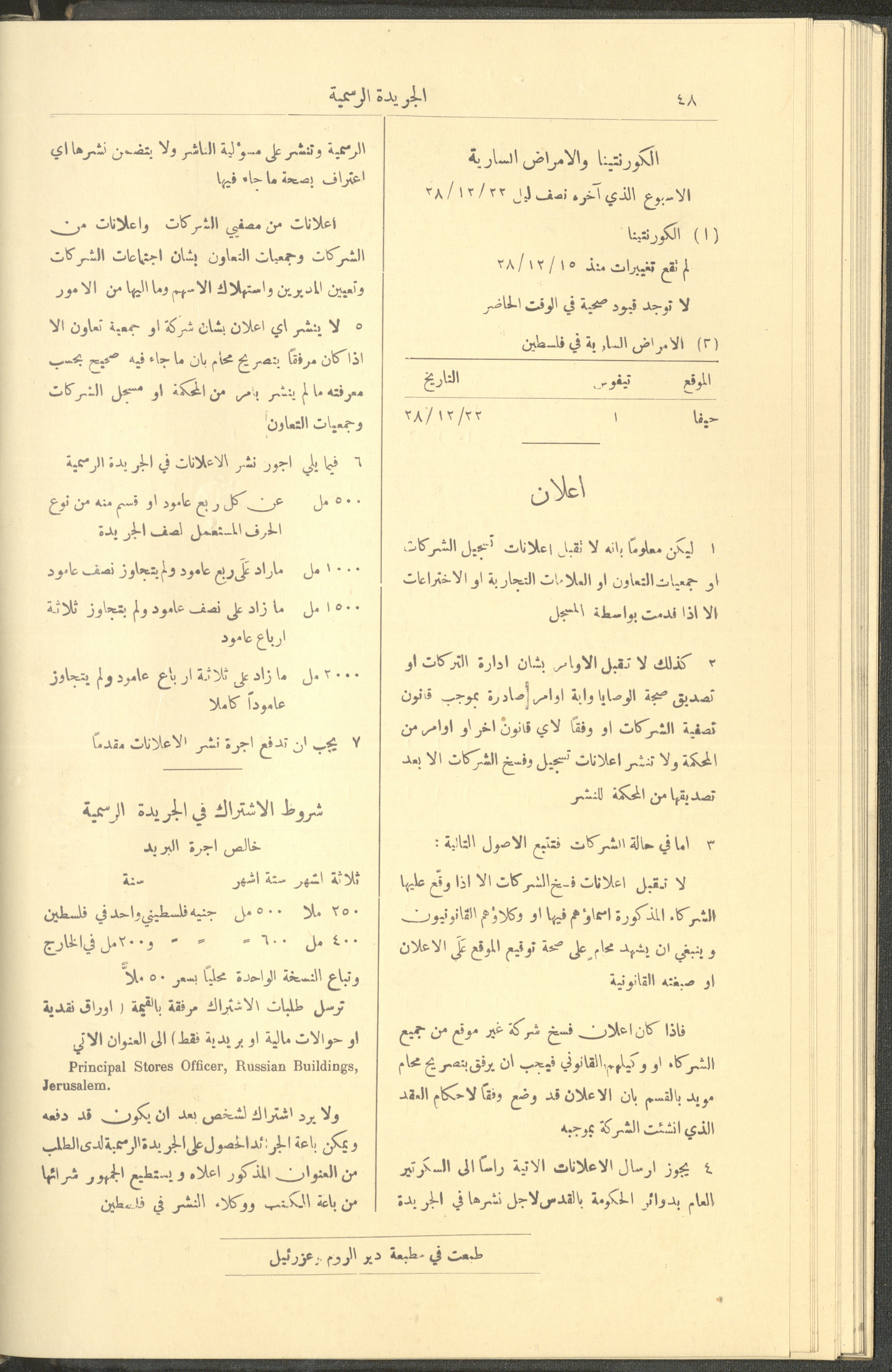 Issued on 1 January 1929, this document shows issue no. 226 of the Official Palestine Newspaper featuring official government announcements including appointments and orders issued under the laws in force in Palestine during the British Mandate, it also shed light on laws about loading and unloading goods and company registrations, the Law of Communicable Diseases and Epidemiology, and the law of doctors licensing. It also follows asylum to and exodus from Palestine, as well as some miscellaneous advertisements. The issue was printed in Azriel Press in Jerusalem, where the price of the copy was fifty mils and was published twice a month. Said official government announcements and amendments include: 1. Land Law 2. Companies Law 3. Mortgage Law 4. Contempt of Court 5. Colonial Probates Act in the British Kingdom 6. Urban Planning Law 7. Local Councils Law 8. Property Tax Law 9. Law on Road Transport 10. Railway Law 11. Forest Law 12. Jaffa Port Law 13. Land Settlement Law 13. Prison System Law 14. Publishing Law