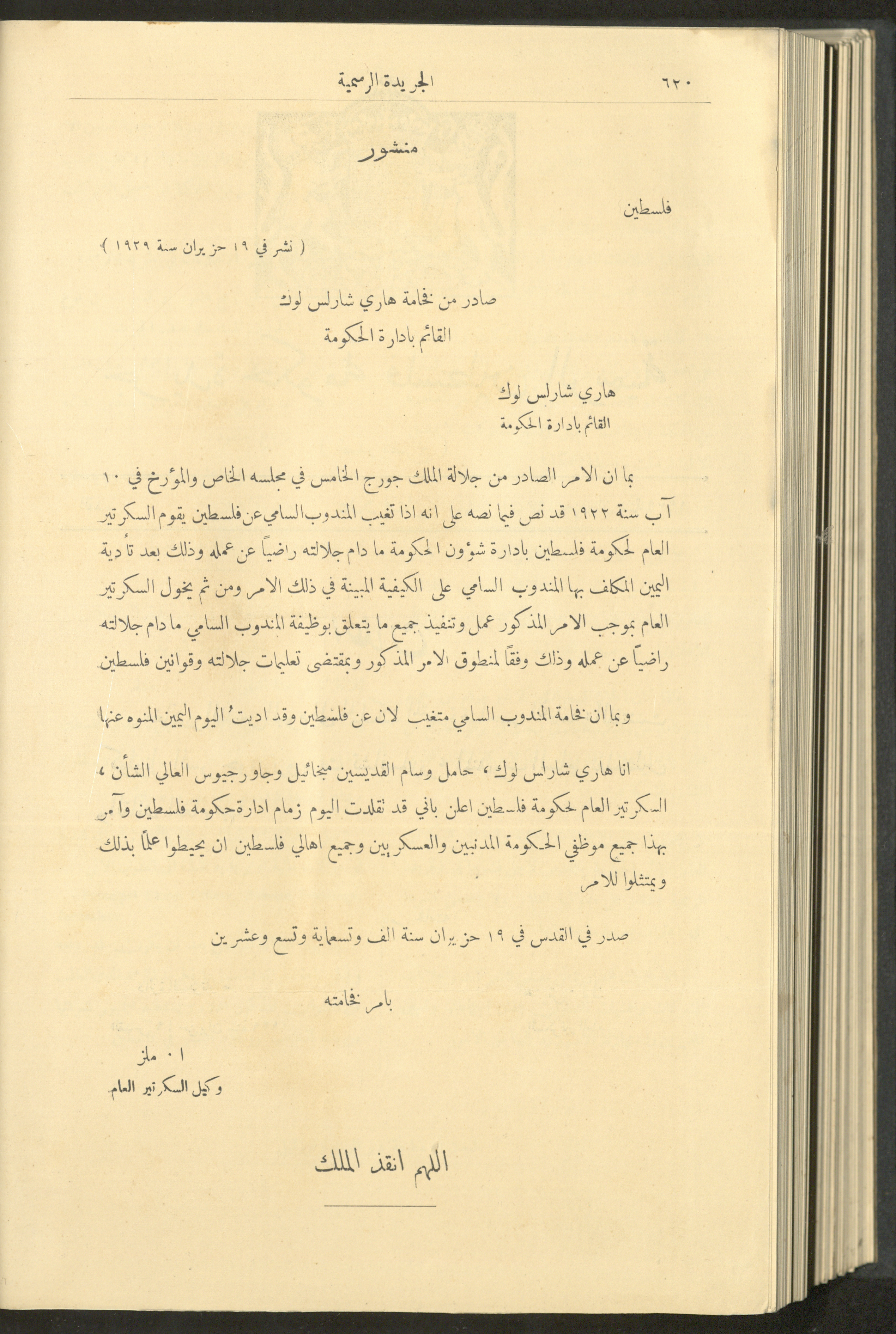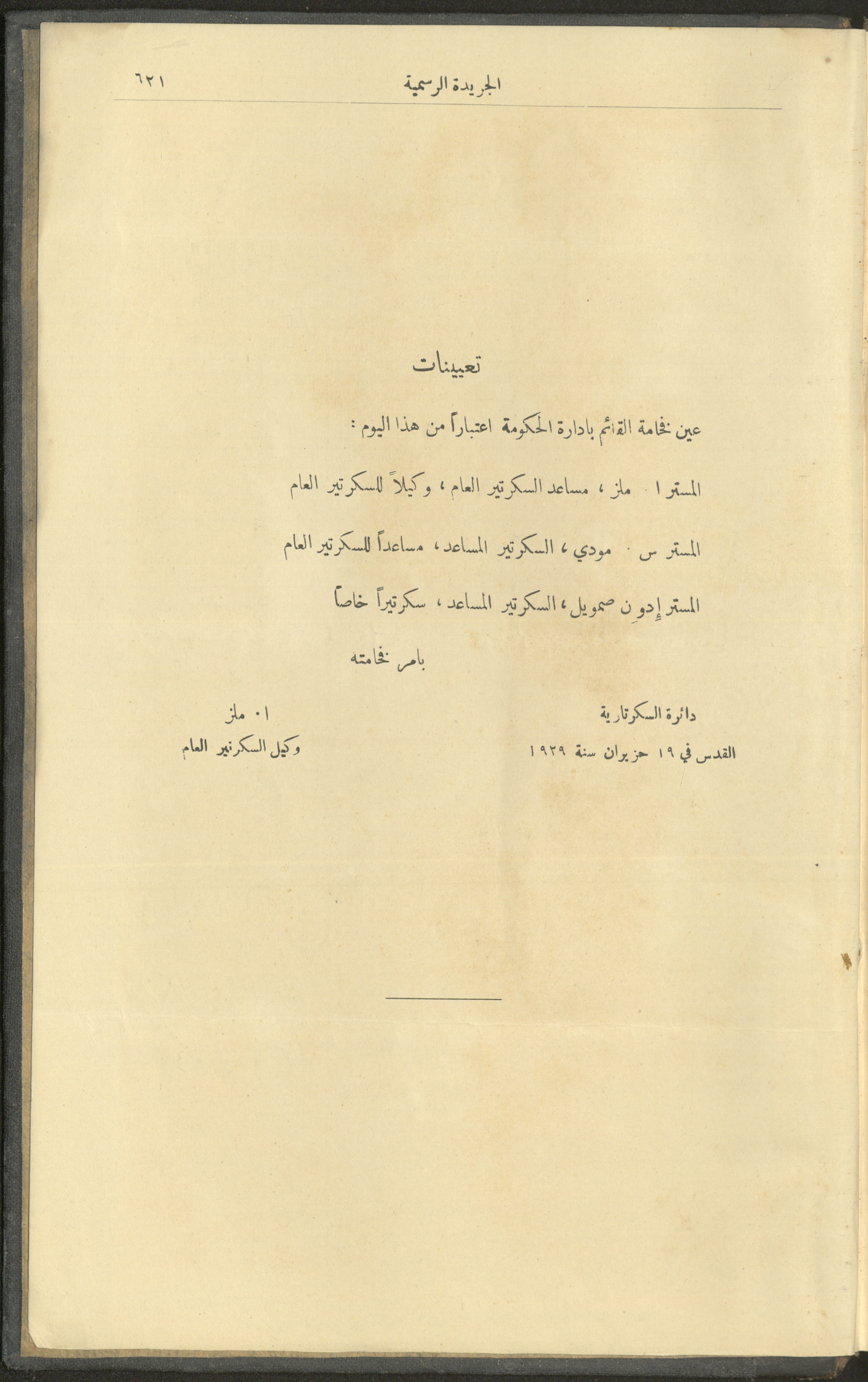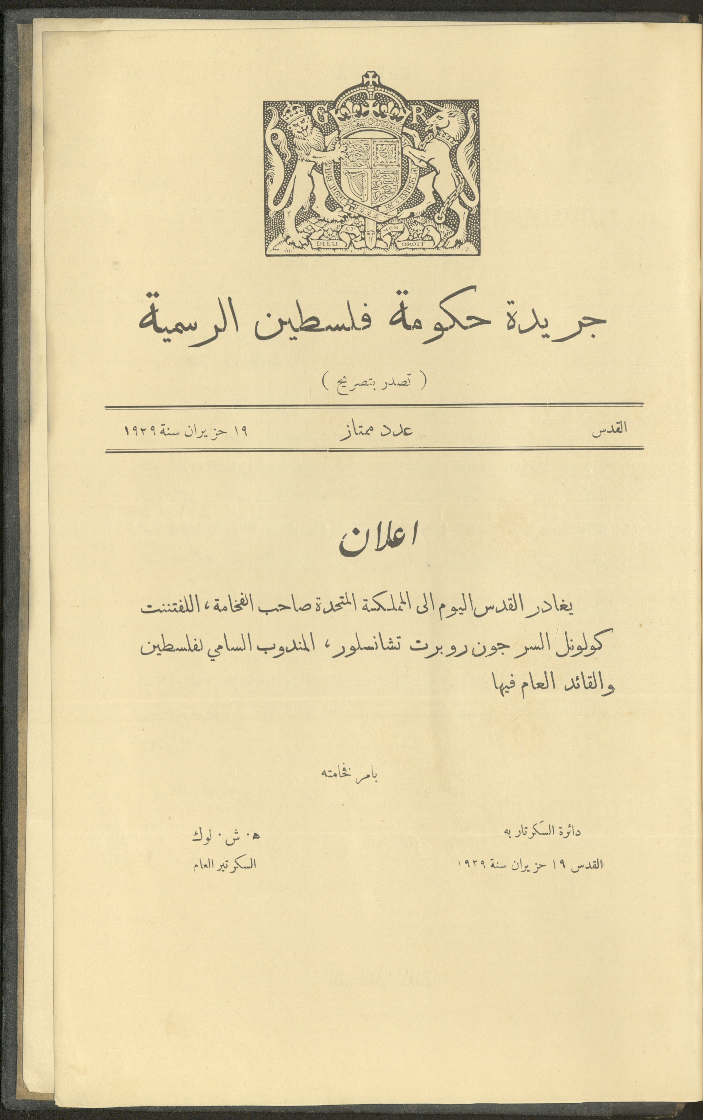 Issued on 19 June 1929 in Jerusalem and printed in Azriel Press, this special issue of the official Palestine newspaper includes announcing the departure of the High Commissioner for Palestine, John Robert Chancellor, for Britain.