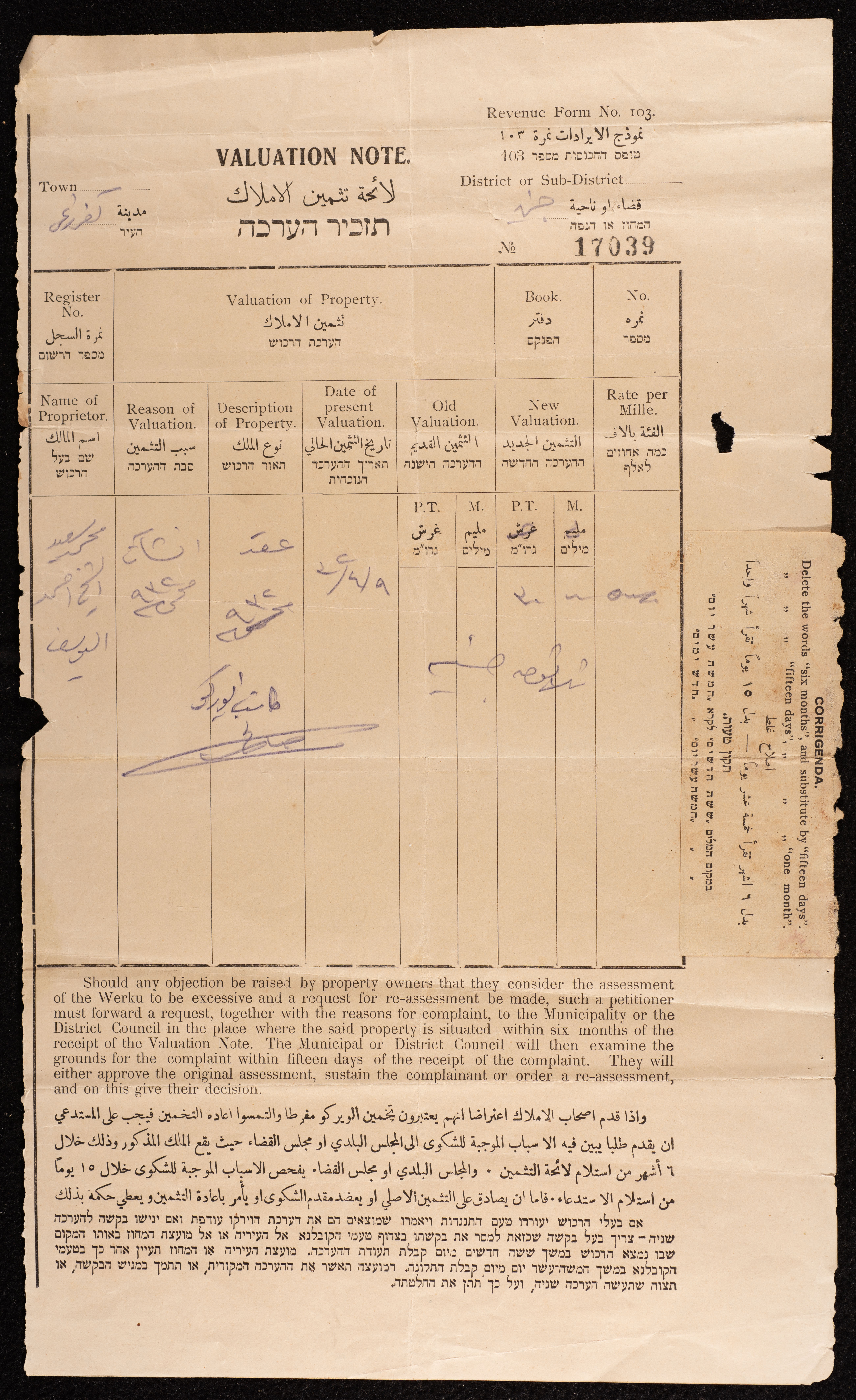 Printed in Arabic, English and Hebrew and dated 9 April 1932, this document shows a Valuation of Property Note for Mohammad Saeed Sheikh Ahmad al-Yousef, which includes details of the valuation amounting to thirty pounds, in addition to the type of property, the reason for the valuation, and the name of the owner.