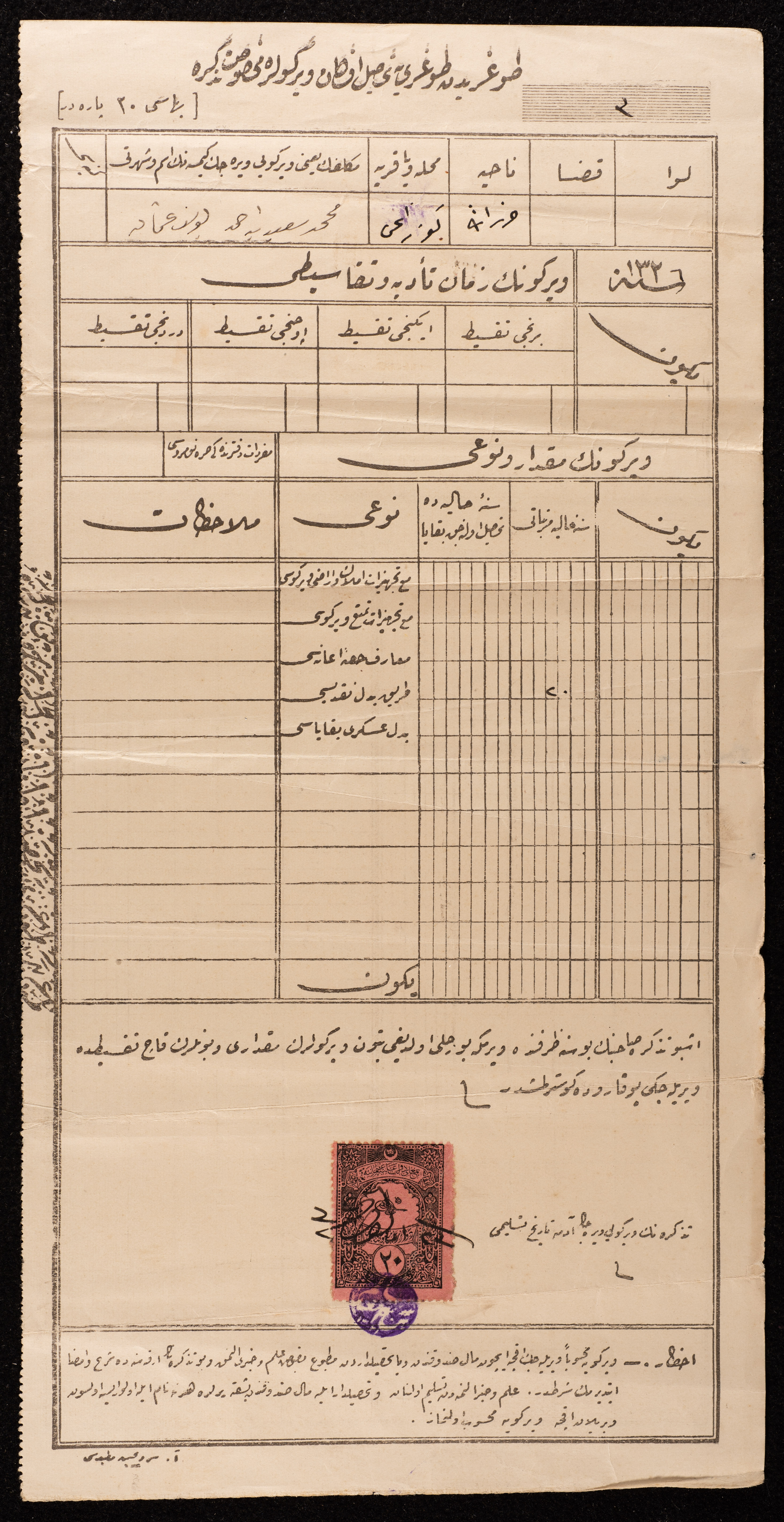 Dated 1326 AH, corresponding to 1908 AD, this Ottoman document shows a notification of payment of the “Werko” tax in the name of Mohammad Saeed Othman from the village of Kafr Ra’i, Jenin District, in lieu of property tax, as the notice included the signature of the collection officer, seal of the department and an Ottoman stamp.