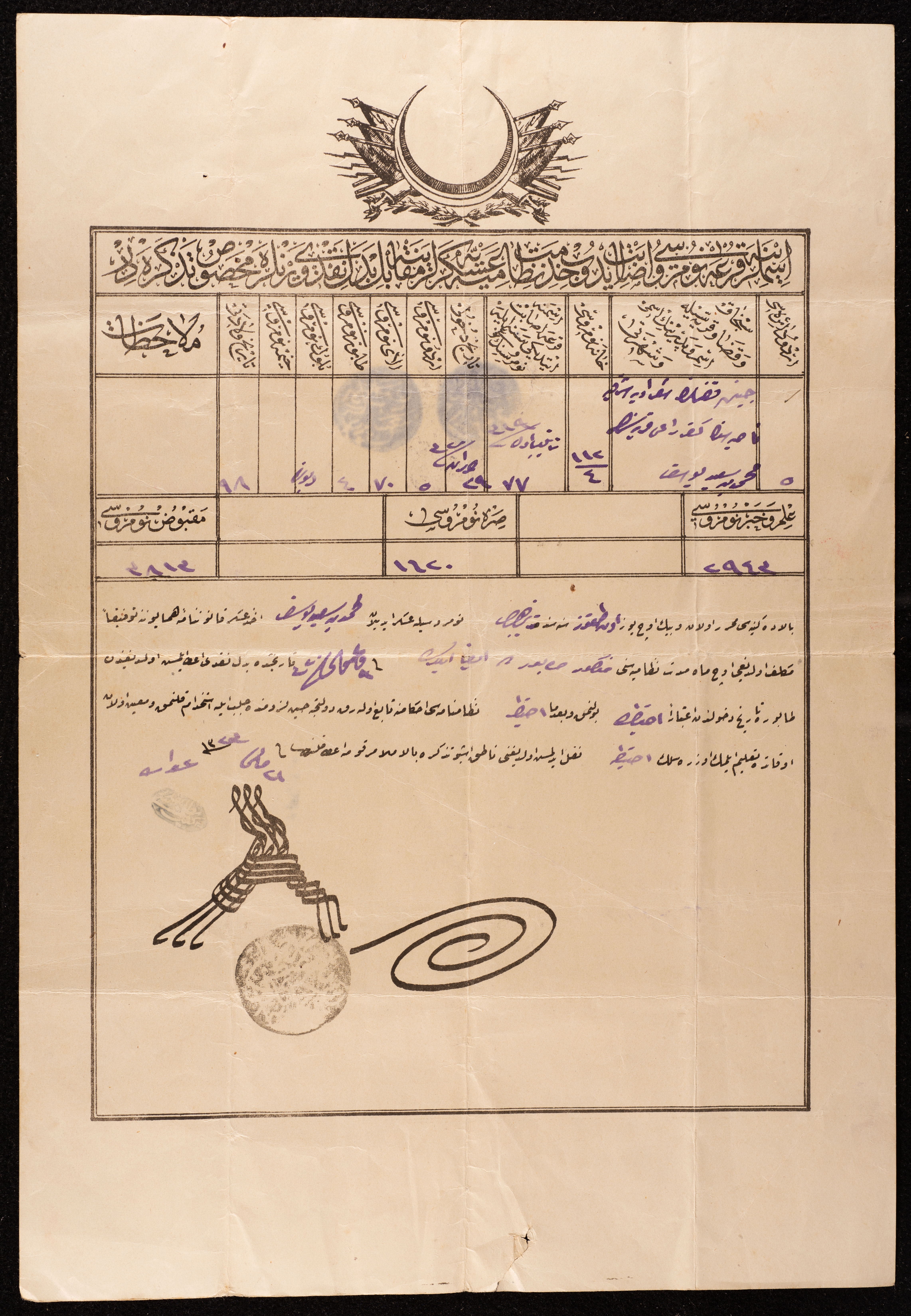 Issued in the name of Mohammad Saeed Yousef in 1323 AH, corresponding to 1905 AD, this document shows a notice for paying a tax for the compulsory conscription law for the year 1320 AH corresponding to 1901 AD, and this notification contained the signature and seals of the competent Ottoman departments.